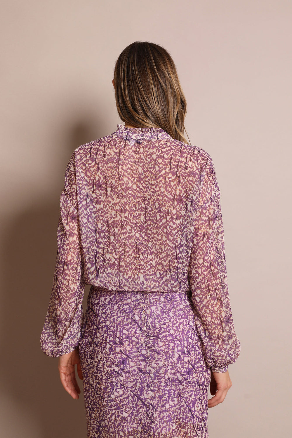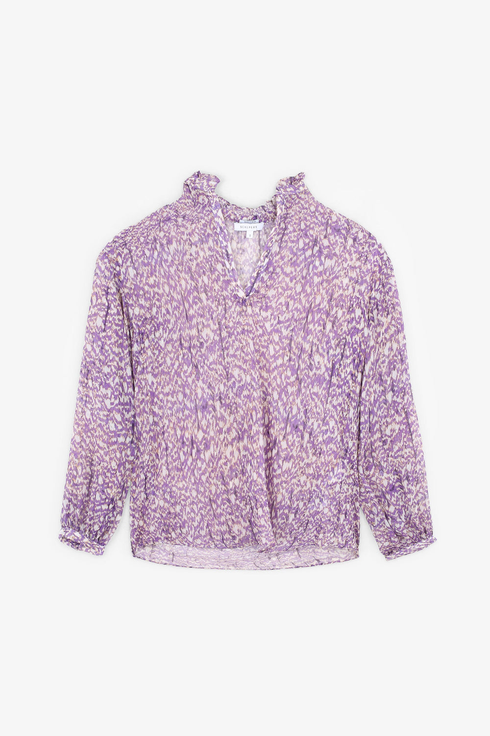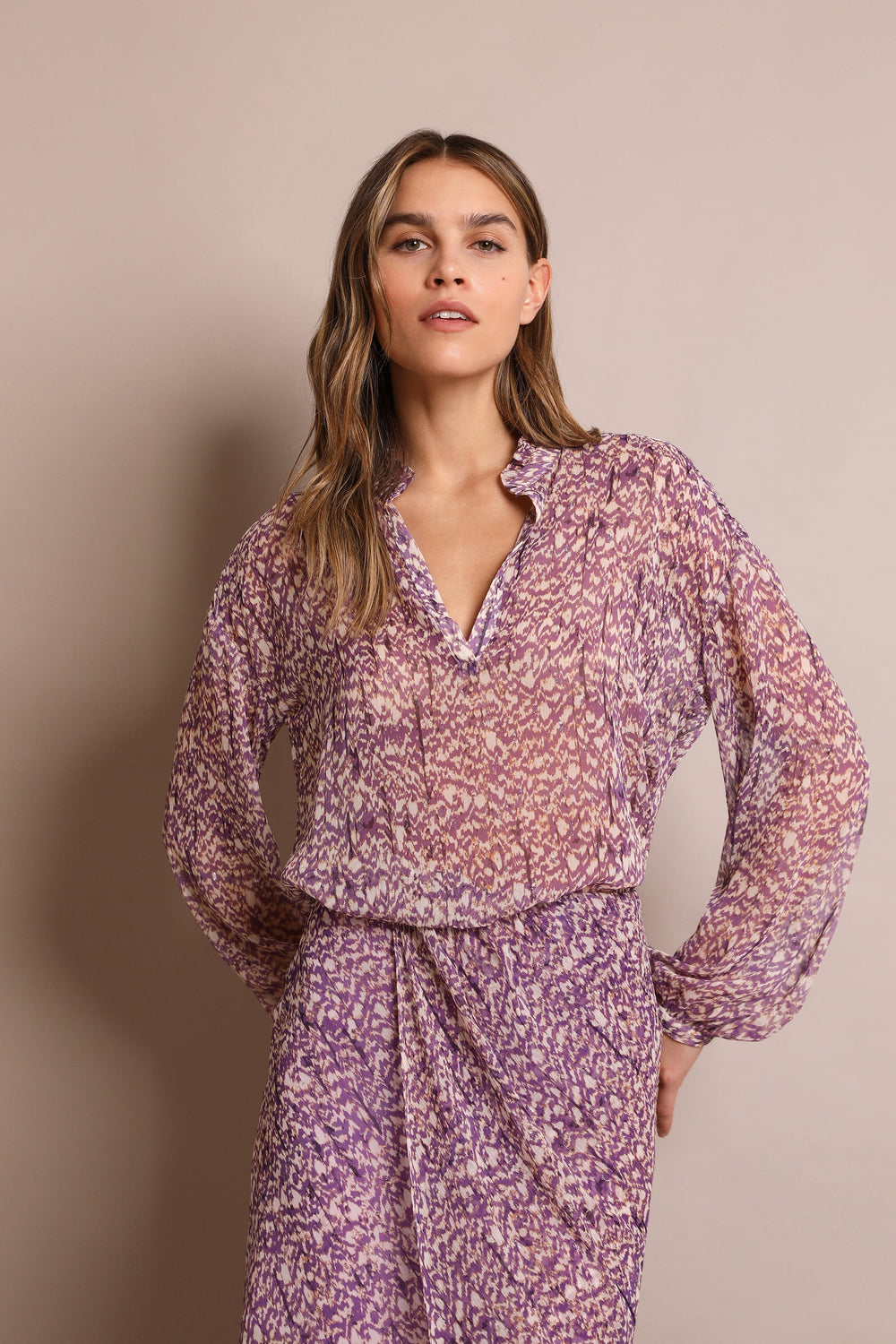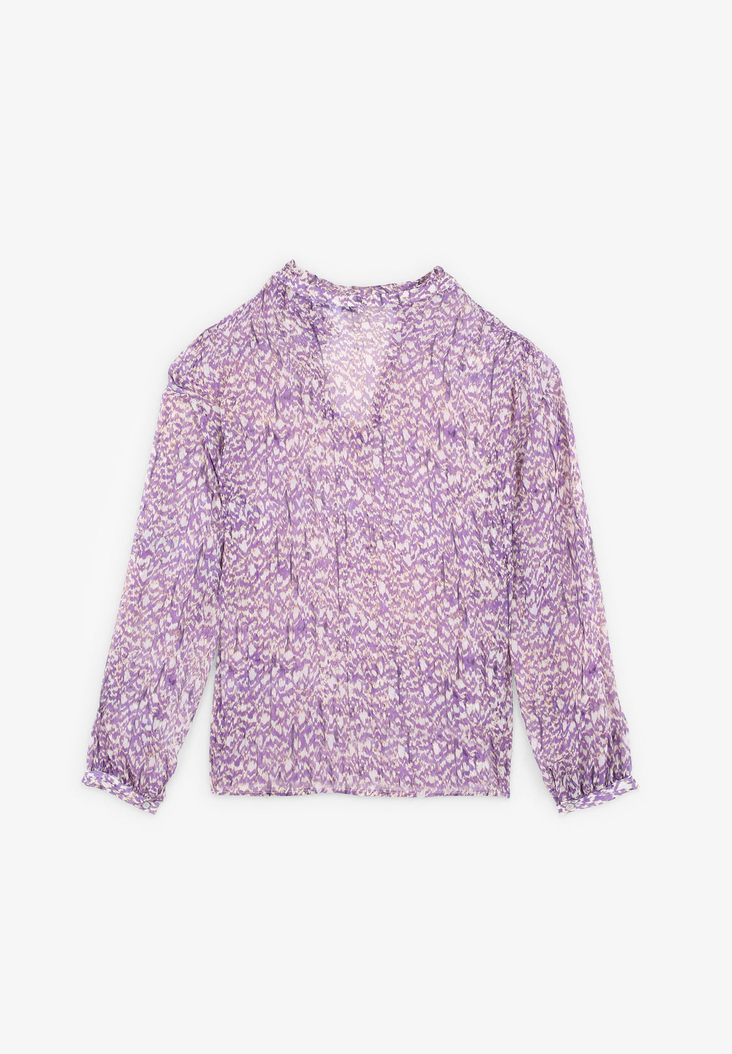 Blouse with metallic print. Made from flowing fabric with metallic thread, V-neck and long balloon sleeves with cuffs.