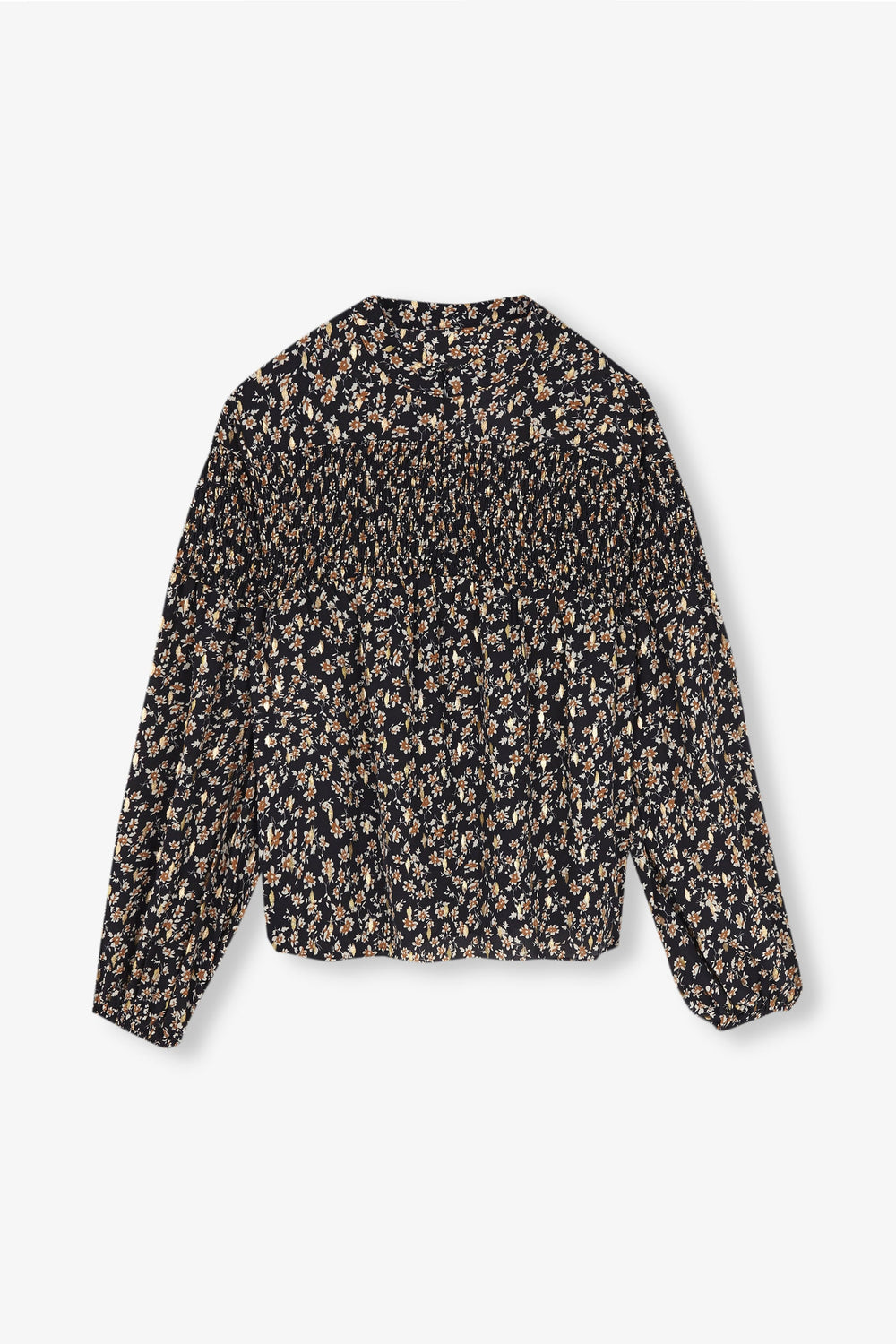 Floral blouse made of flowing fabric. Slim fit, round collar with opening at the neckline and long sleeves. Smocking detail on the chest.