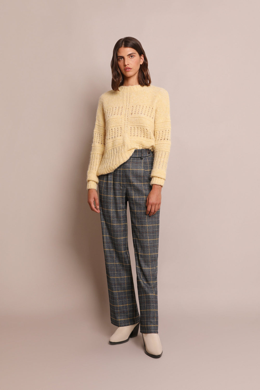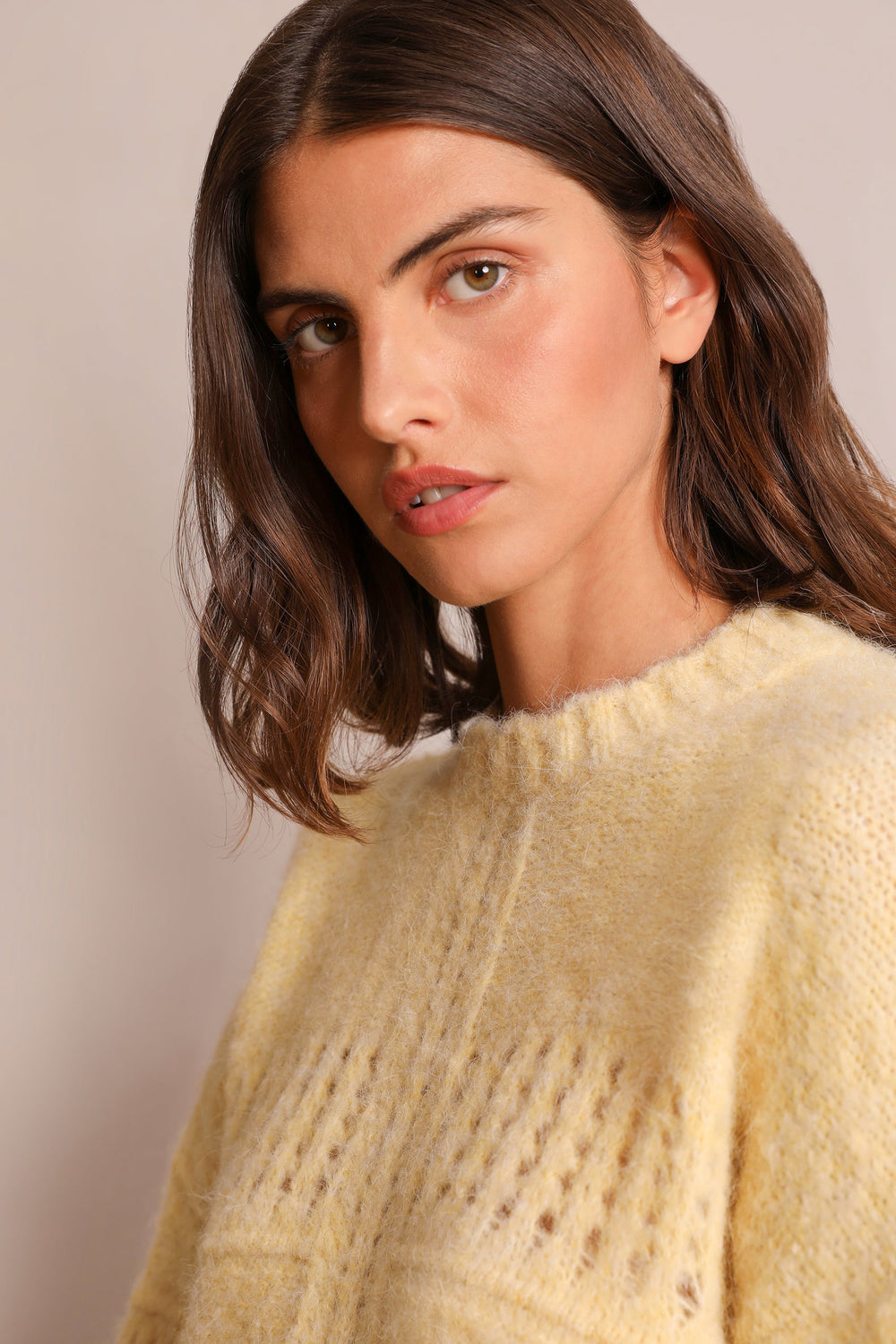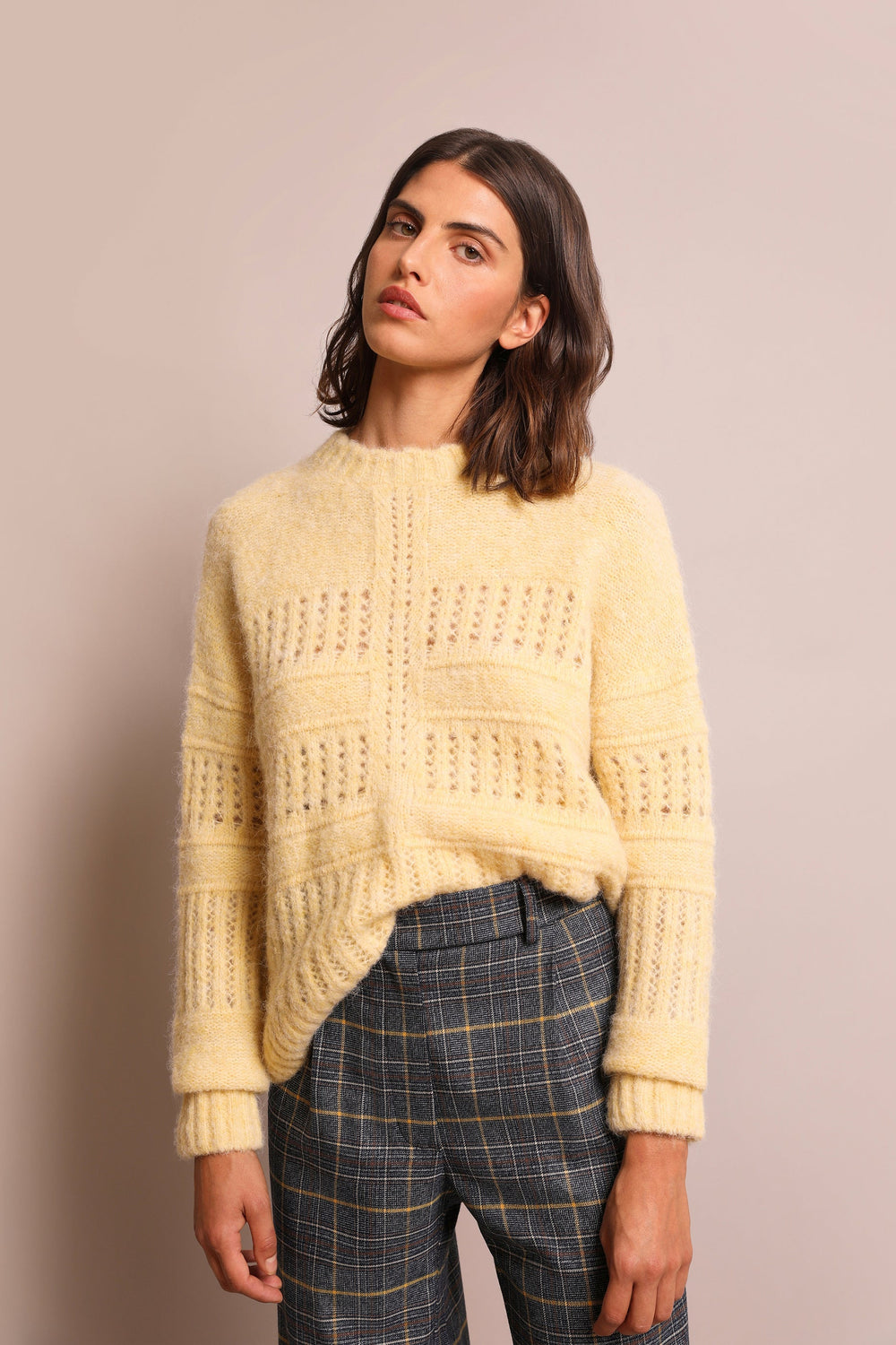 Die-cut sweater made of a wool, alpaca and recycled polyester blend. Regular fit, round neck and long sleeves.