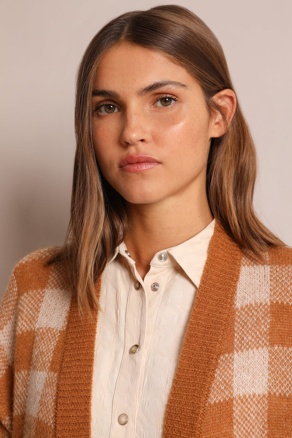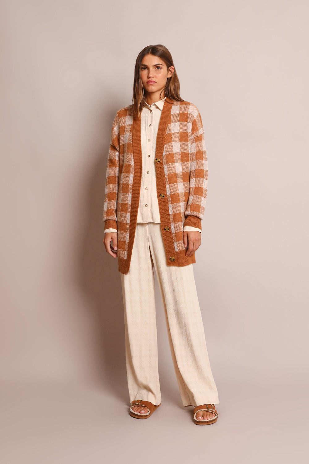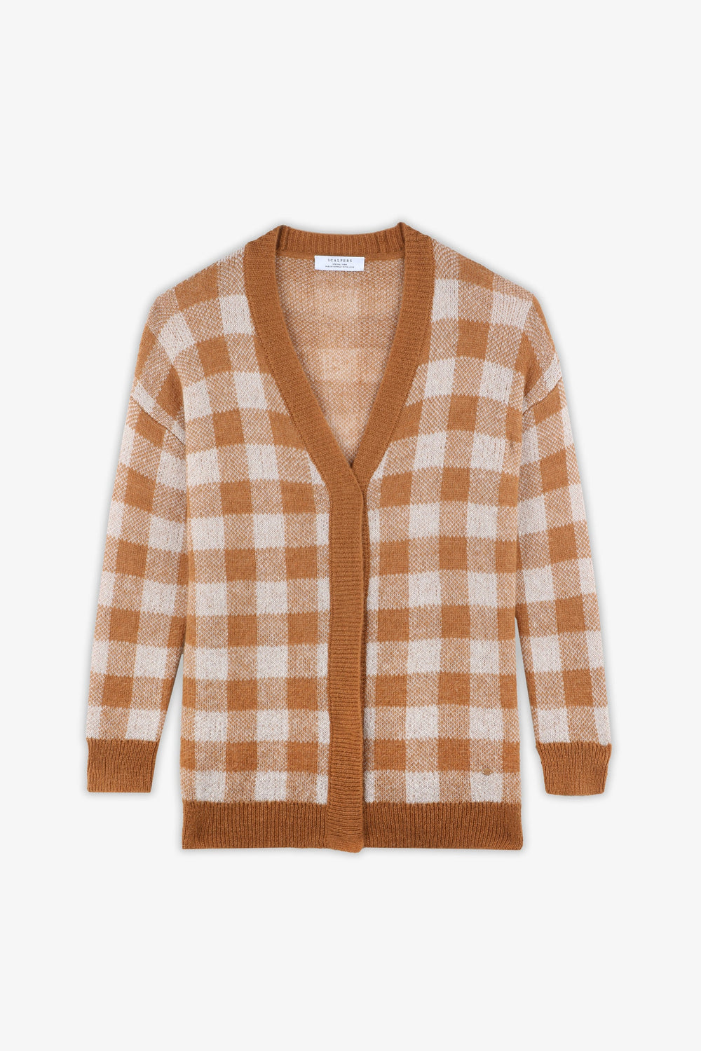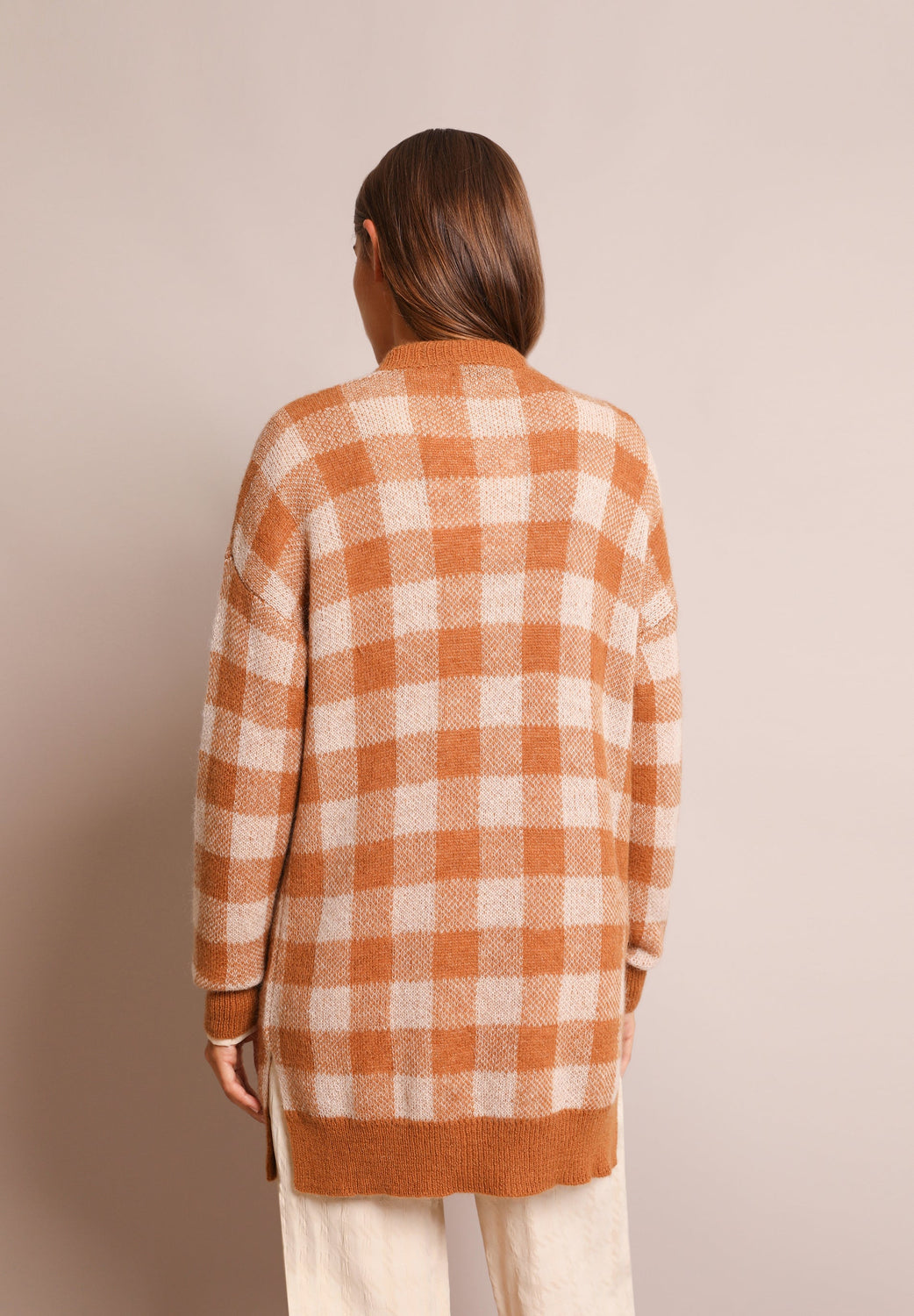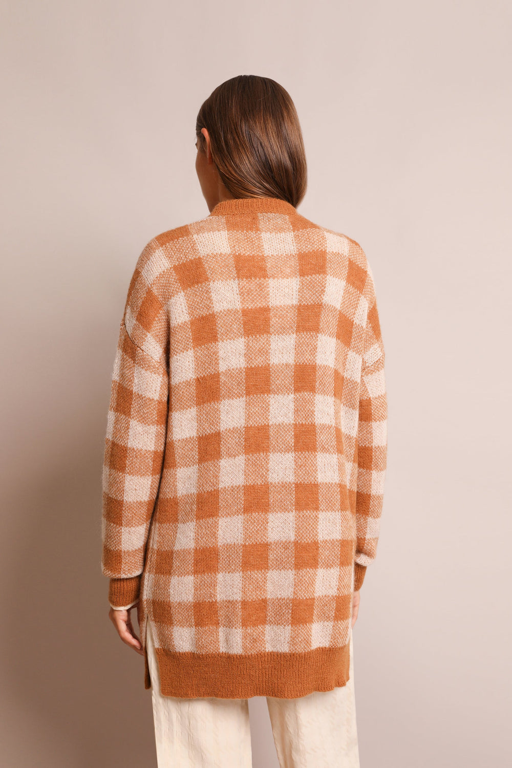 Long check cardigan in a wool and mohair blend. Regular fit, V-neck and button fastening. Long sleeves and side slits.