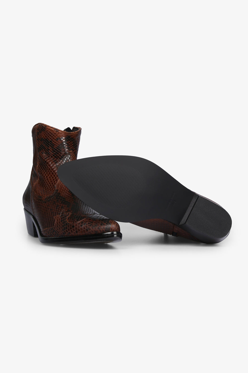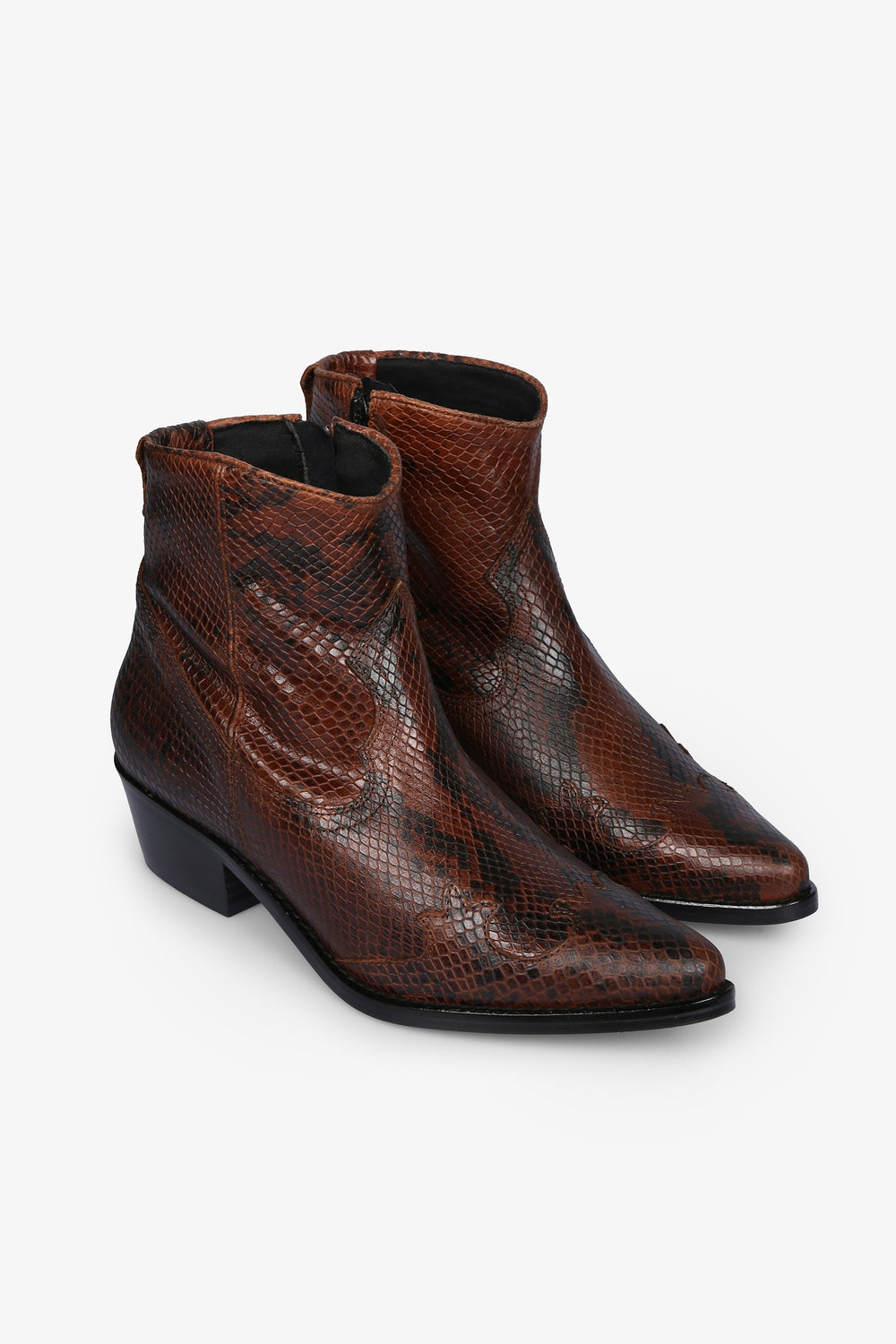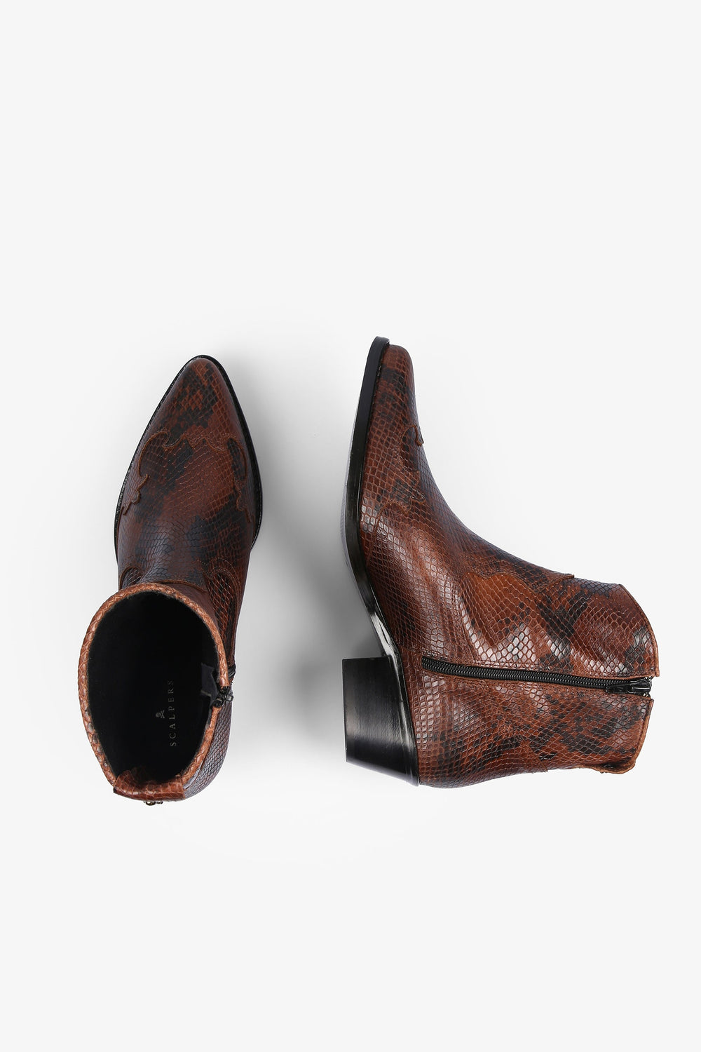 Cowboy ankle boots, made from 100% cowhide leather, zip fastening on the inside, pointed toe and topstitching detail.