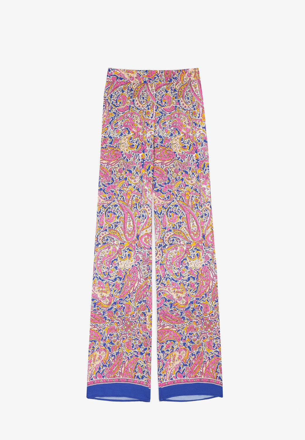 Printed flared trousers. Made of flowing fabric. Slim fit with high waist. Zip and snap button fastening. Side pockets.