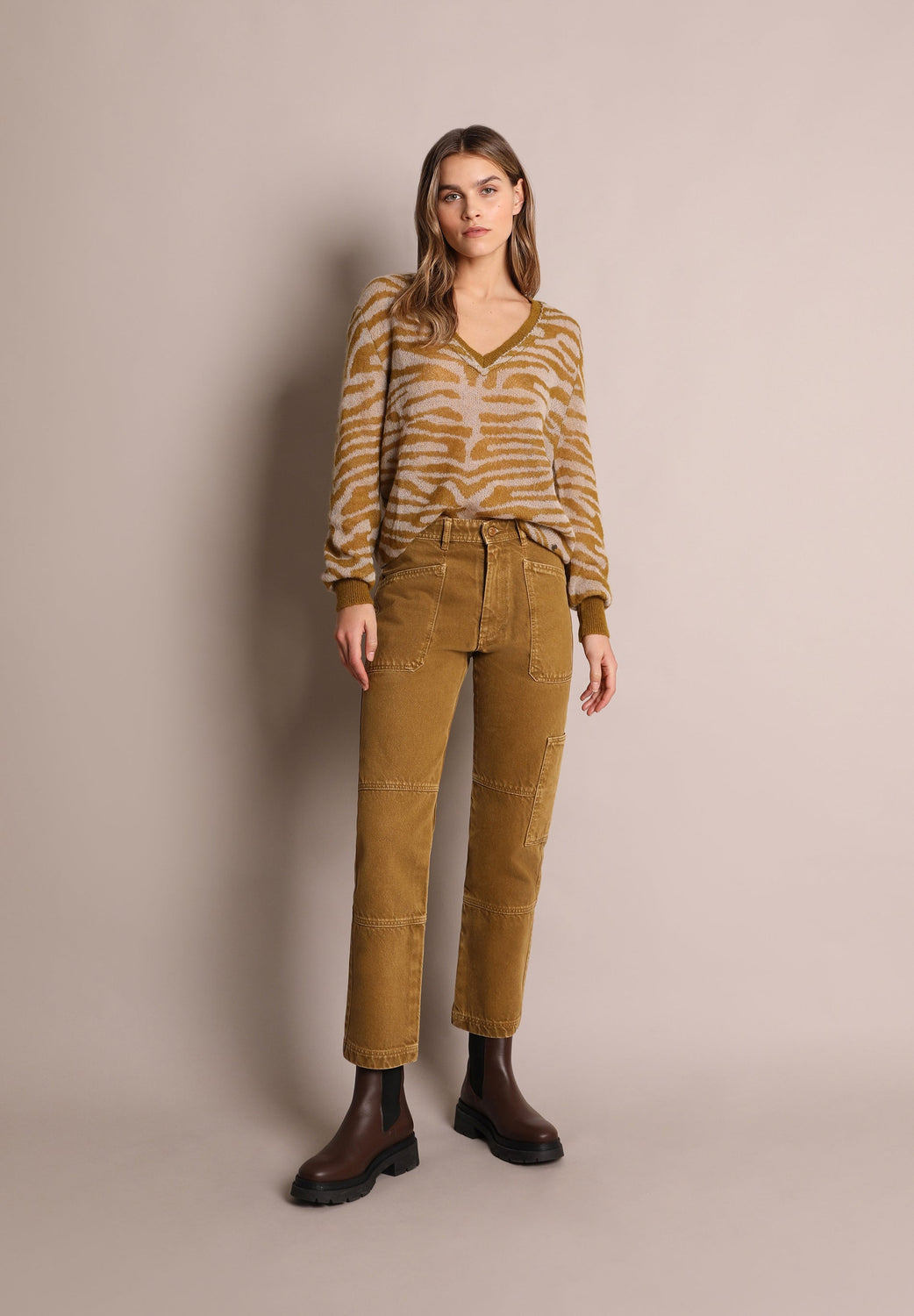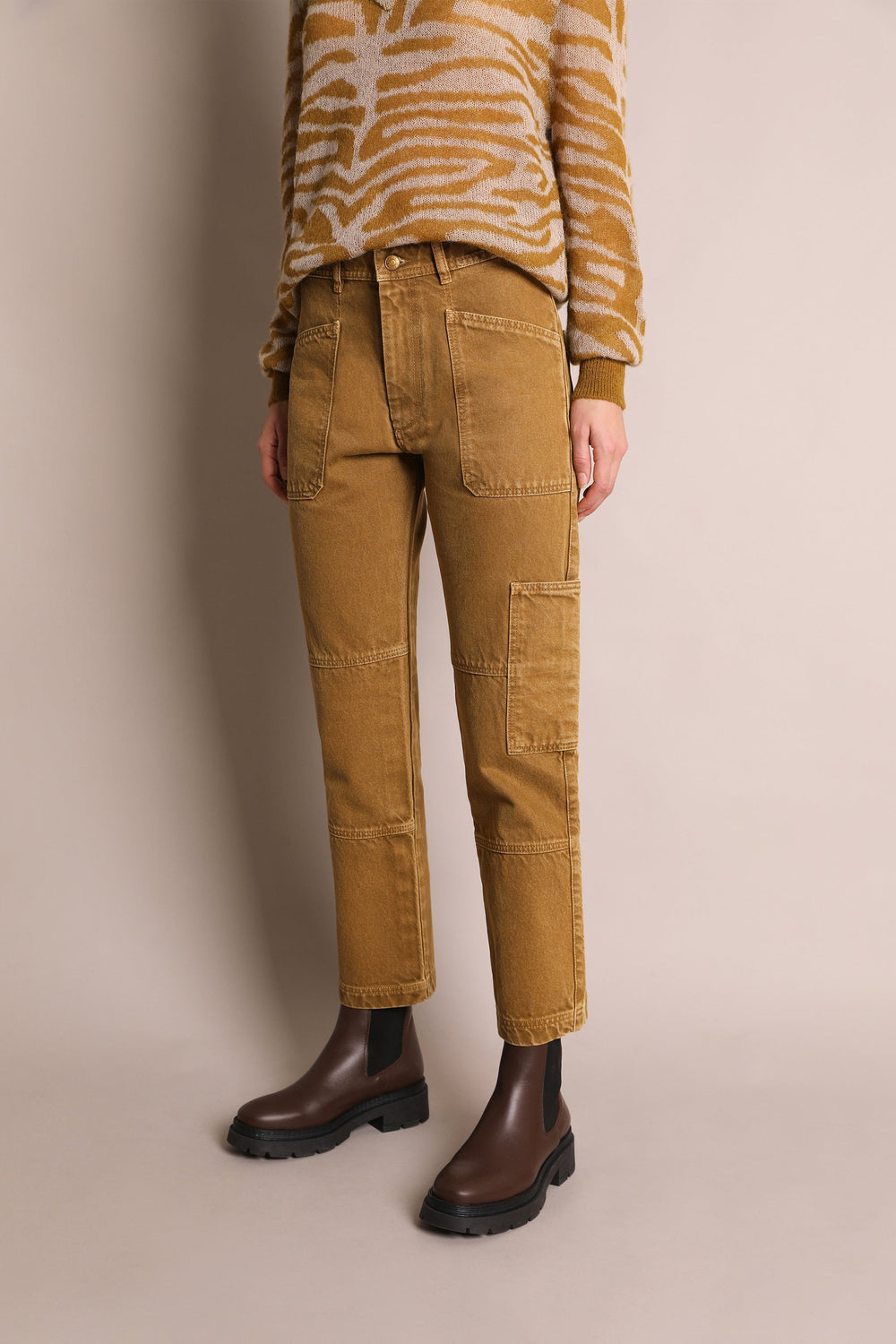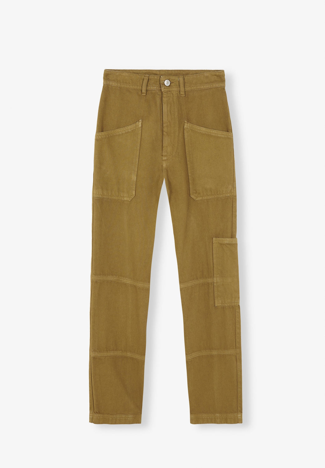 Denim cargo trousers. Made from 100% cotton, a zip fly and top button fastening, waistband with belt loops, knee high and knee low seams and multiple pockets.