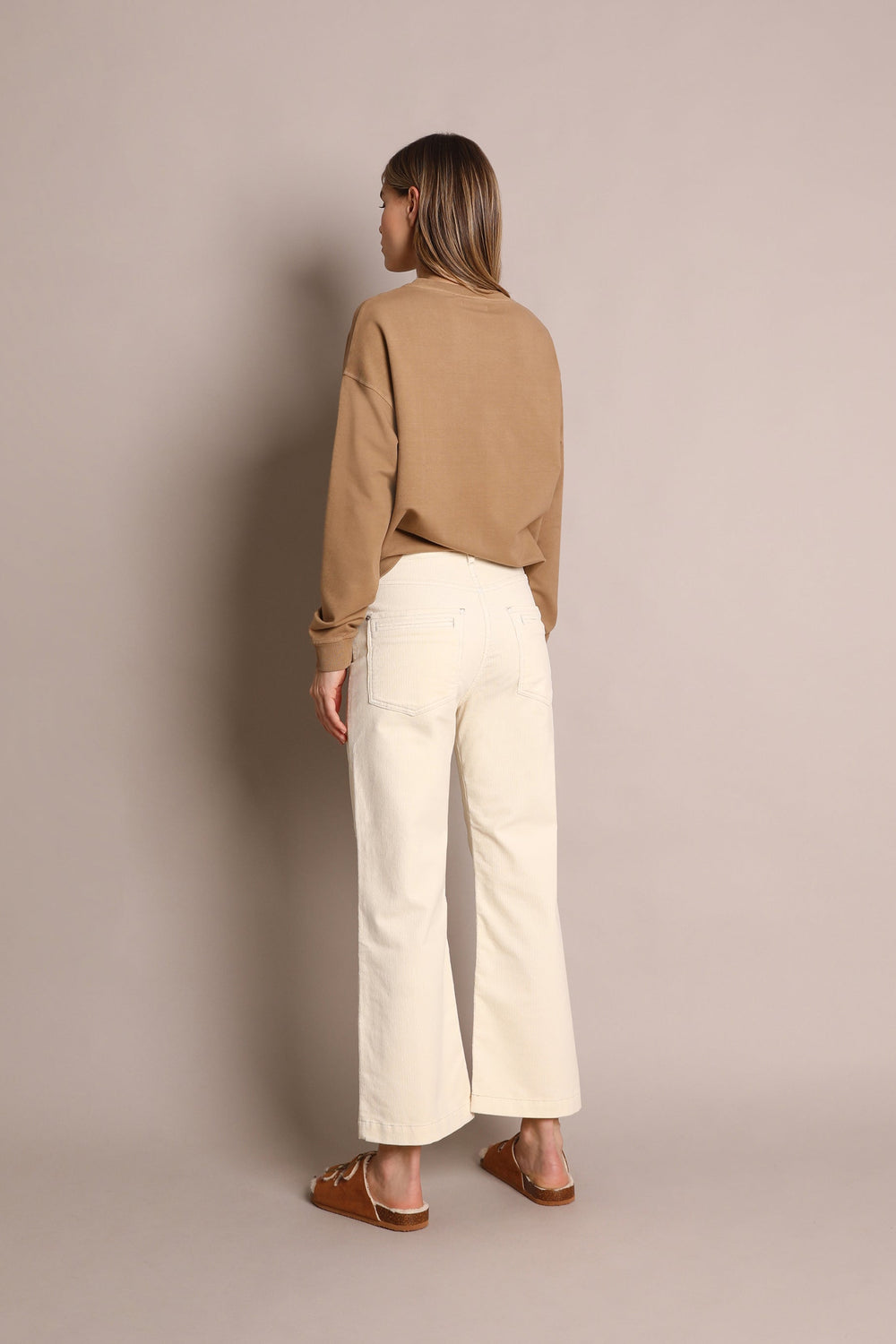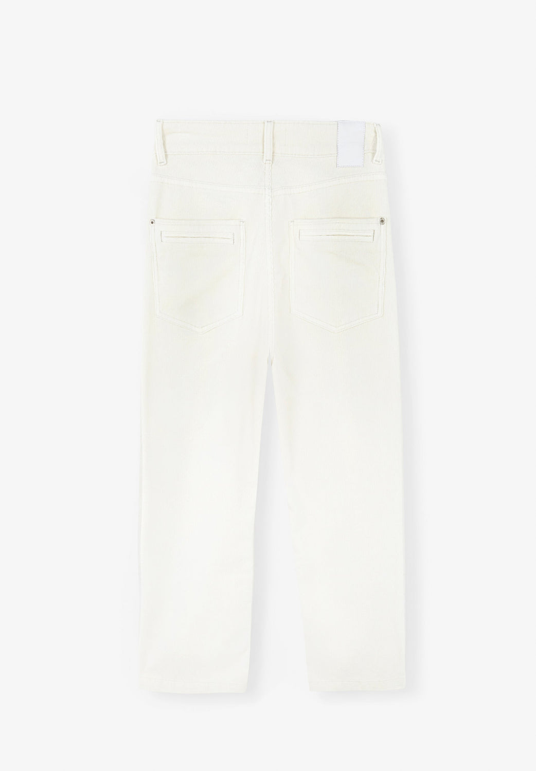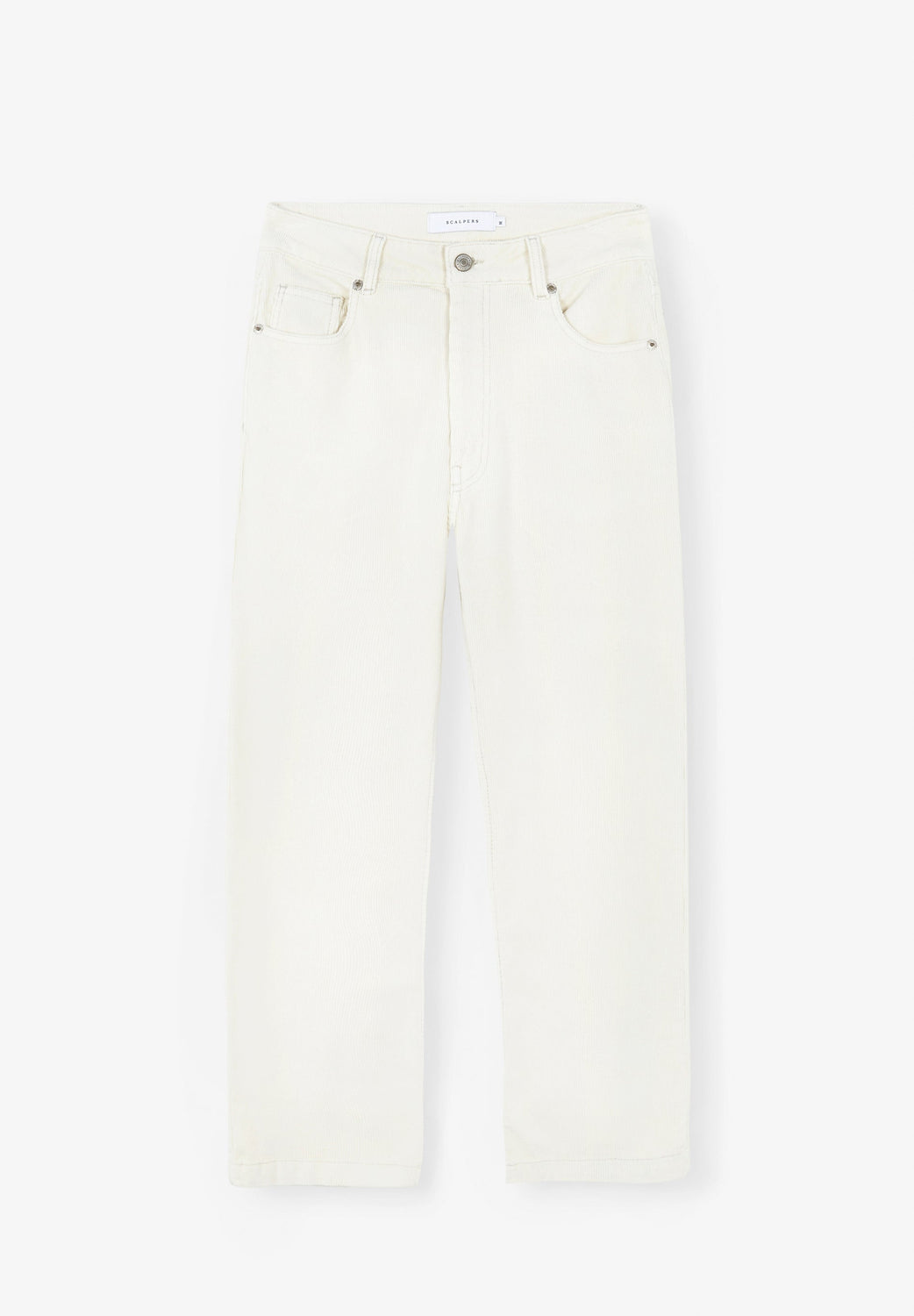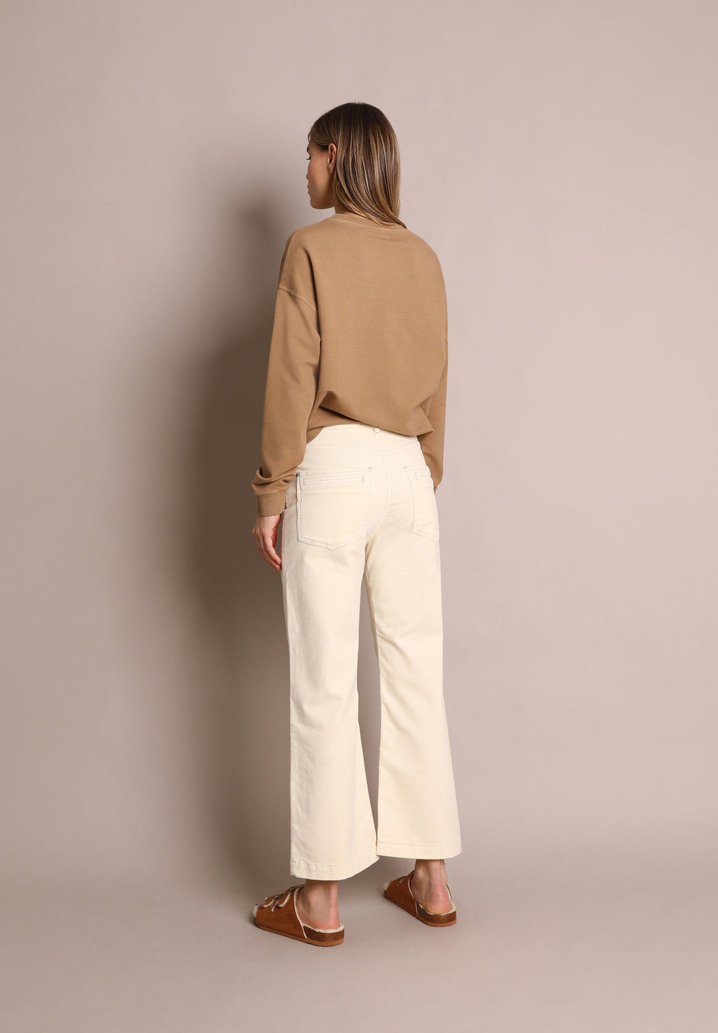 Corduroy trousers. Made of a slightly stretchy cotton blend, high waist culotte fit, zip and button fastening, side and back pockets and belt loops