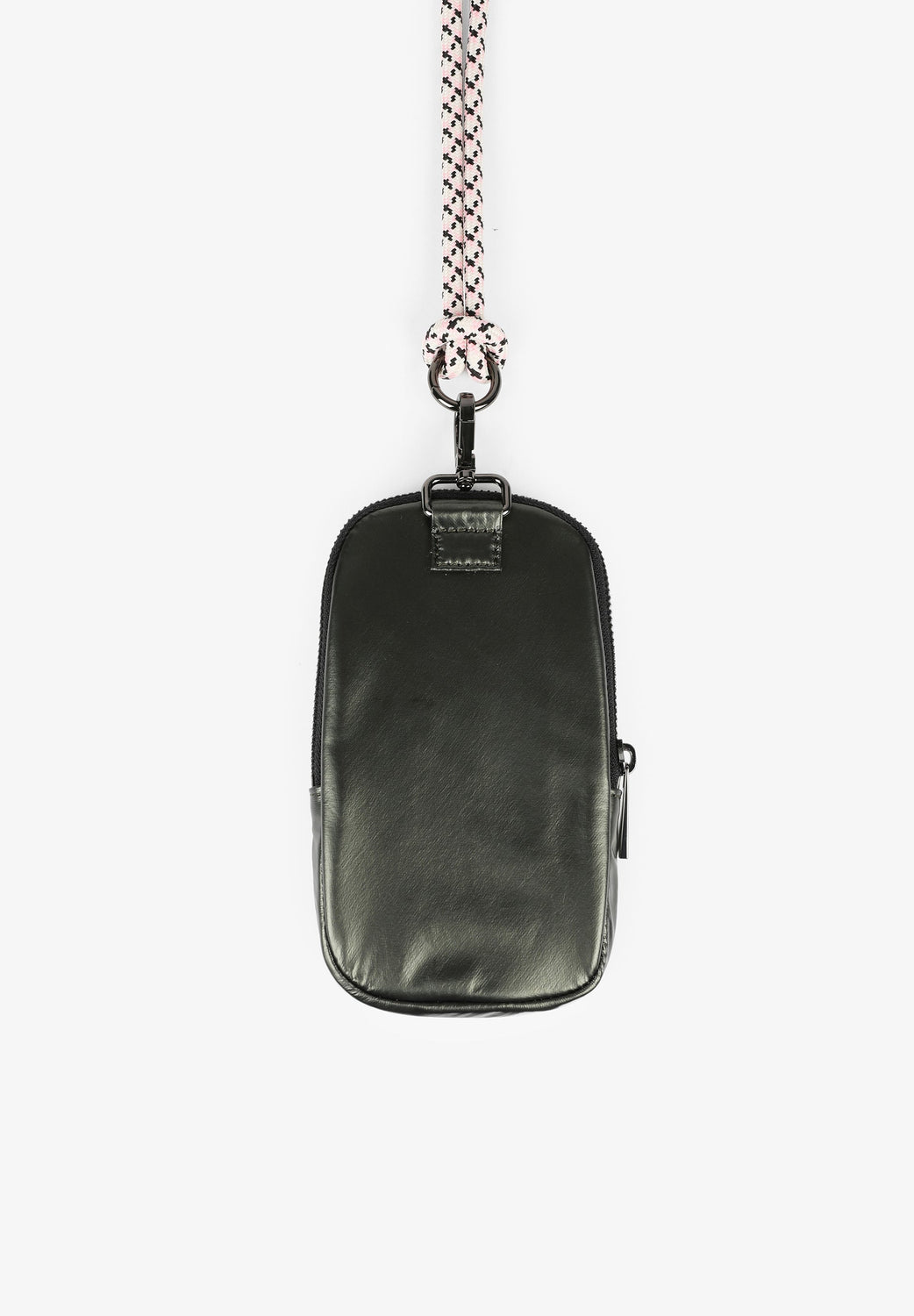 Mini mobile phone bag. Made from technical fabric, with a metallic effect, metal zip closure and metal skull on the front. Containing a carabiner with a cord. Height: 18.5 cm / Width: 12 cm / Depth: 2 cm
