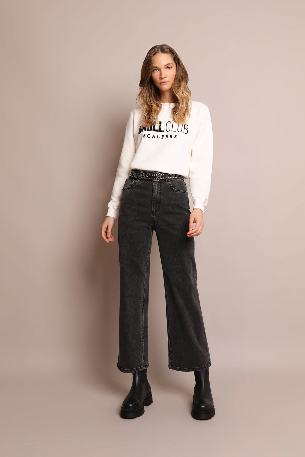 Faded jeans in a slightly stretchy cotton blend. Culotte cut, top button and zip fly fastening, front and back pockets. Belt loops at the waist.