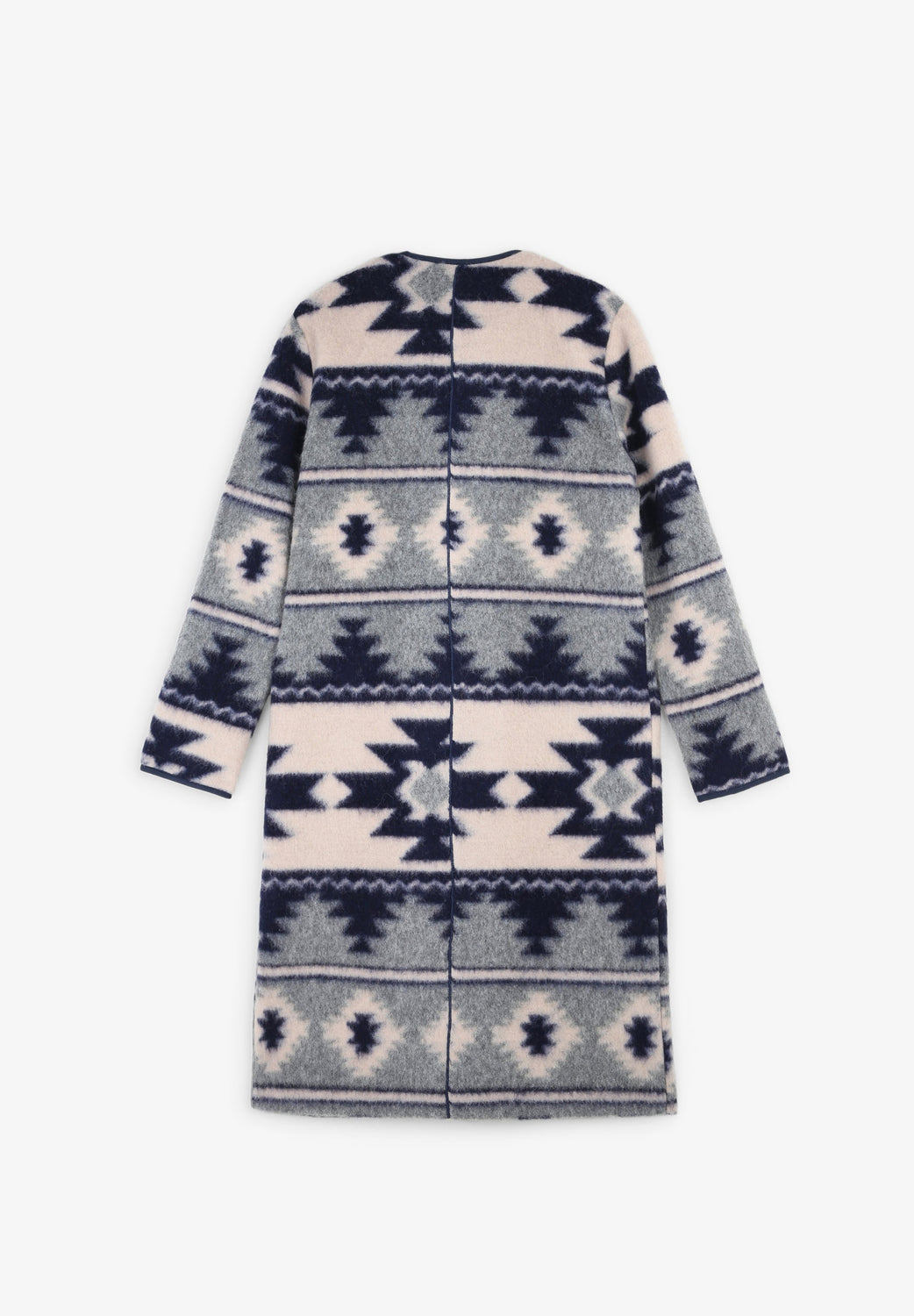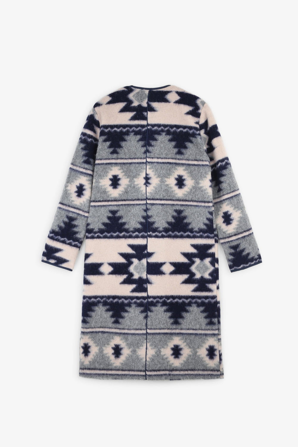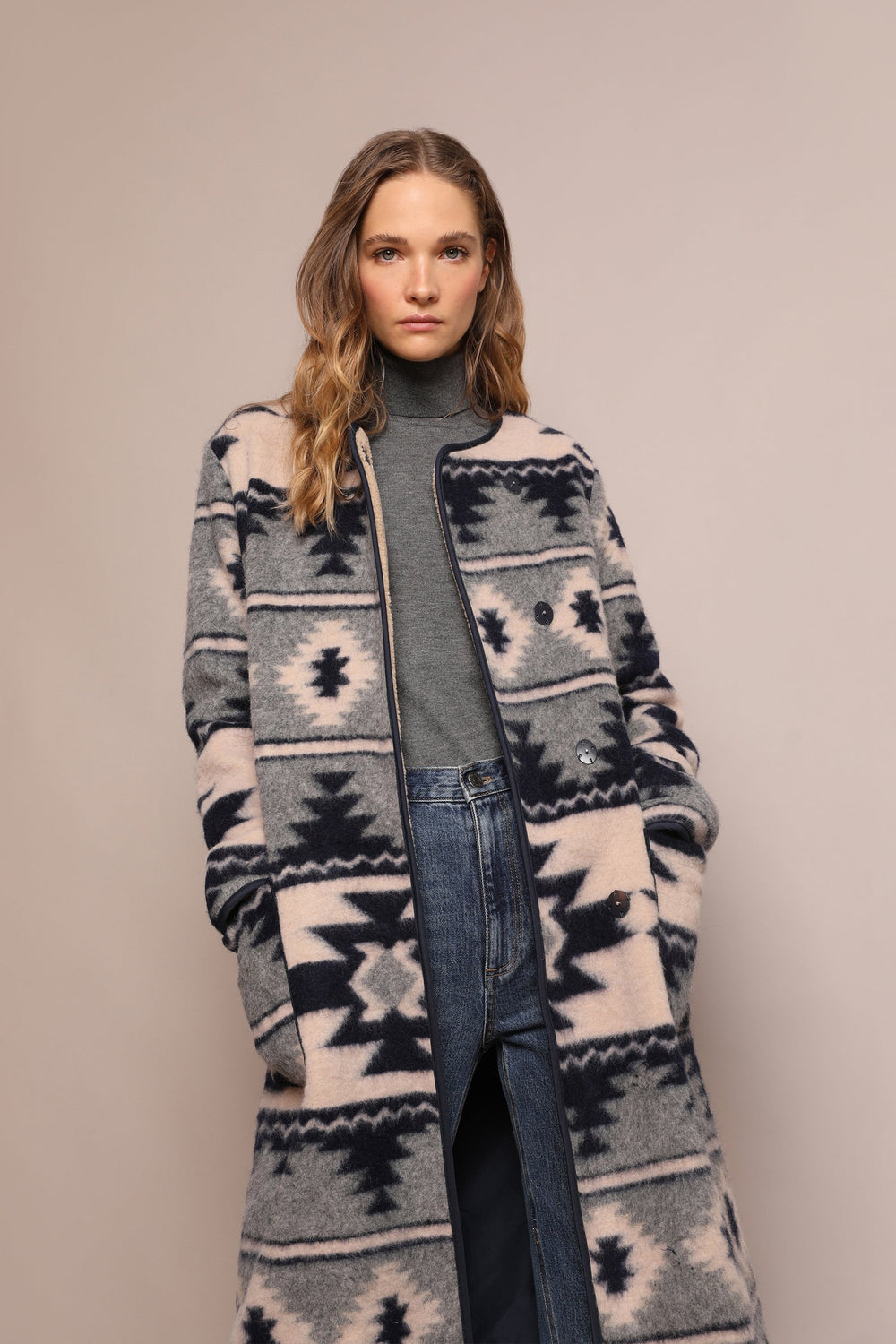 Long ethnic coat in a wool blend. Regular fit, round neck and snap button fastening. Long sleeves and patch pockets.