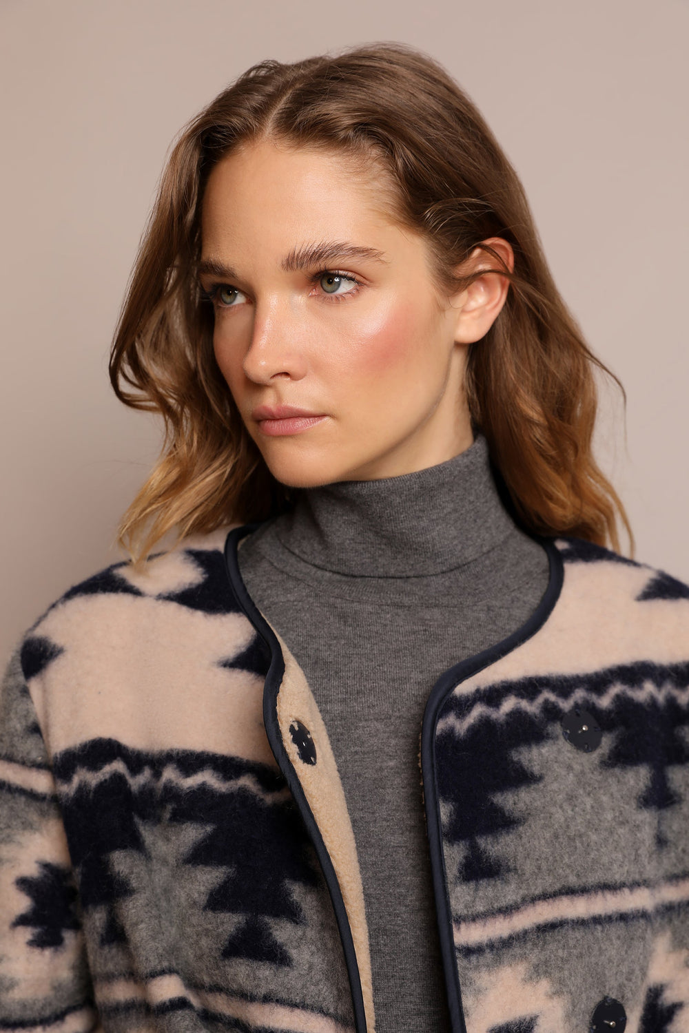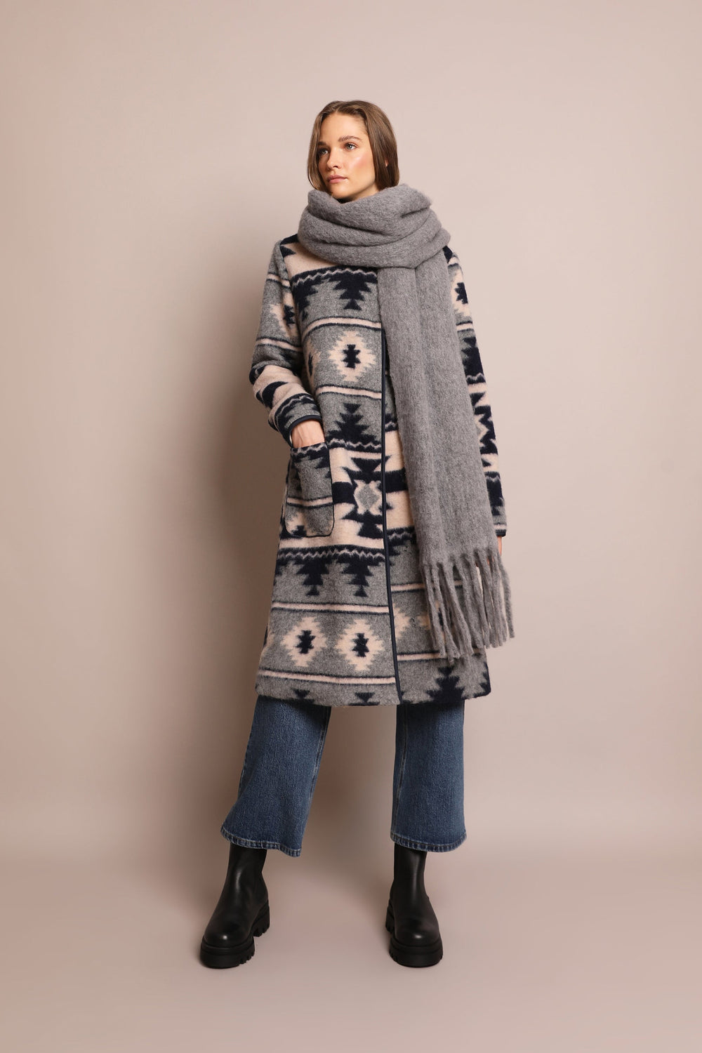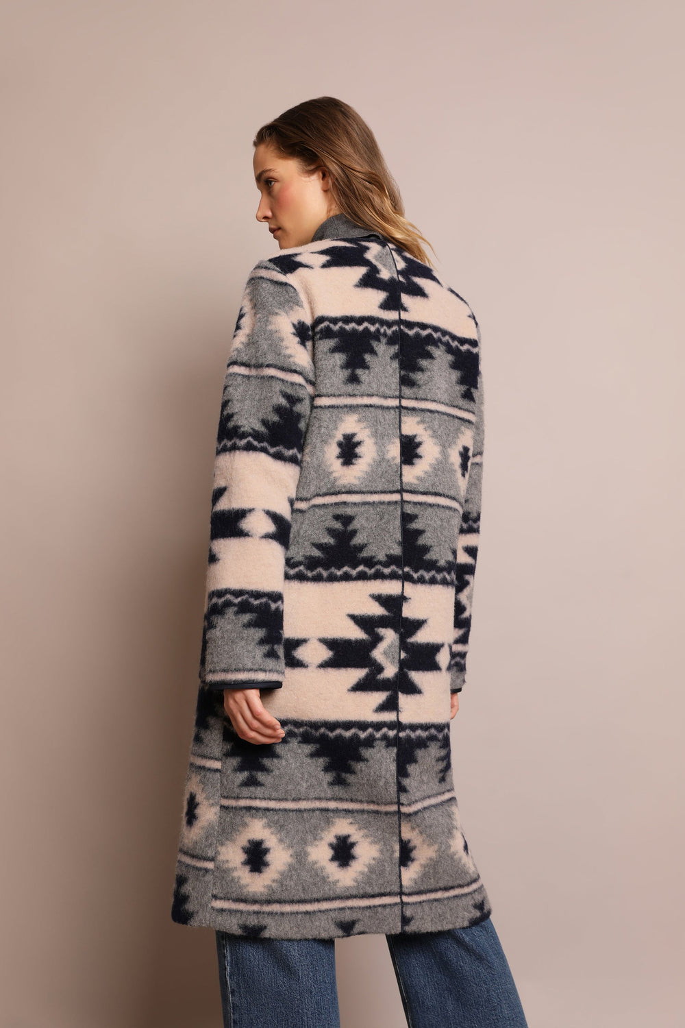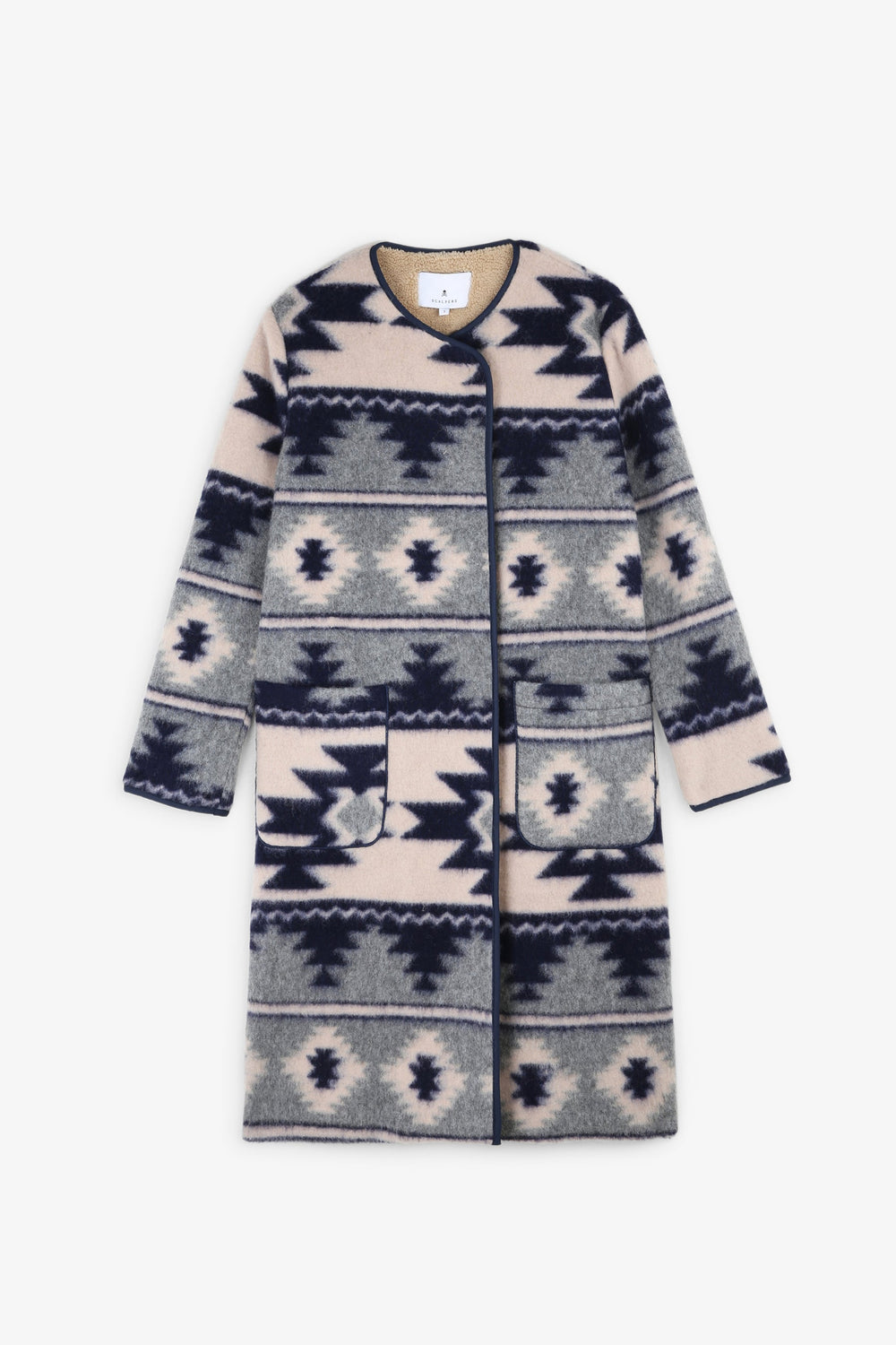 Long ethnic coat in a wool blend. Regular fit, round neck and snap button fastening. Long sleeves and patch pockets.