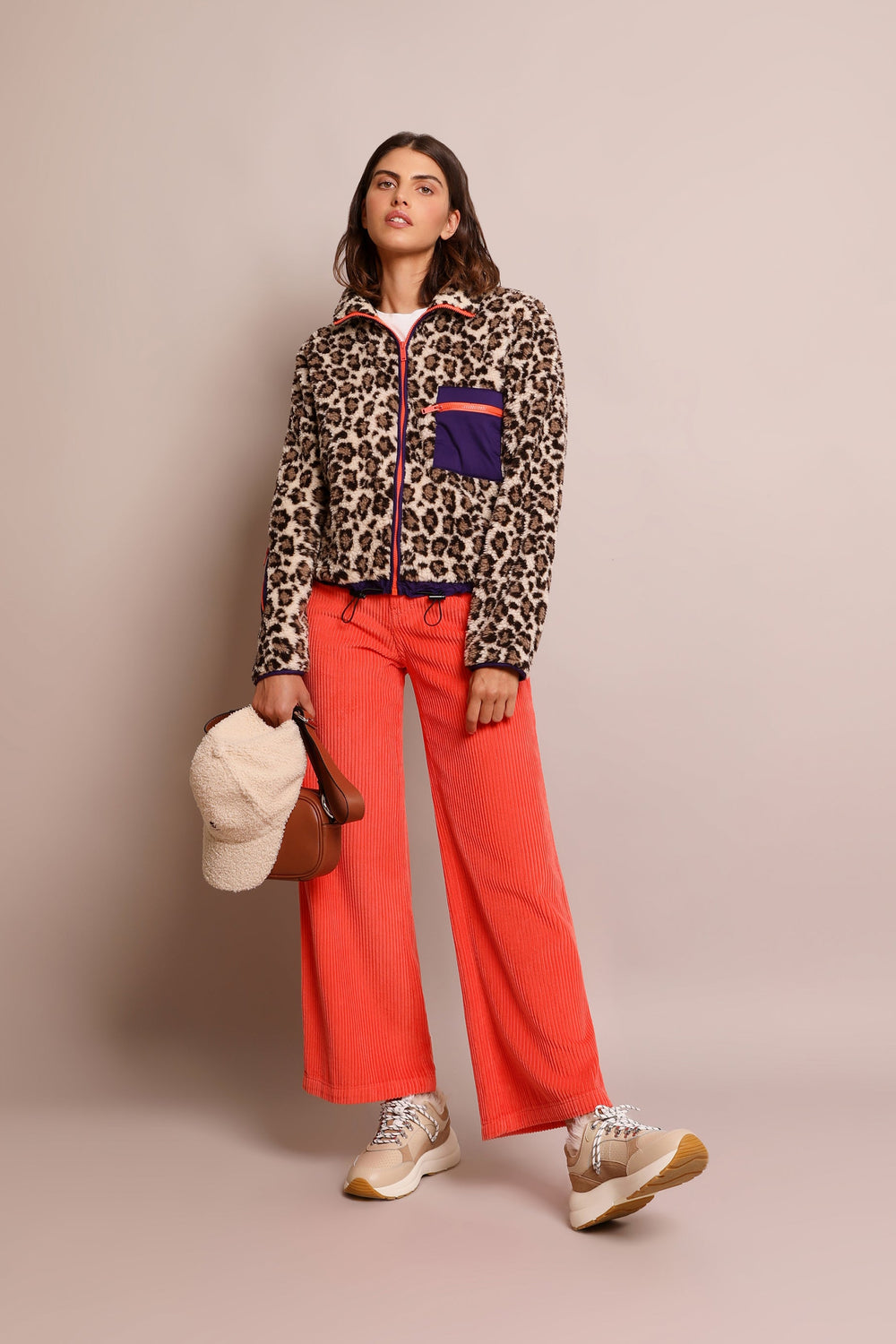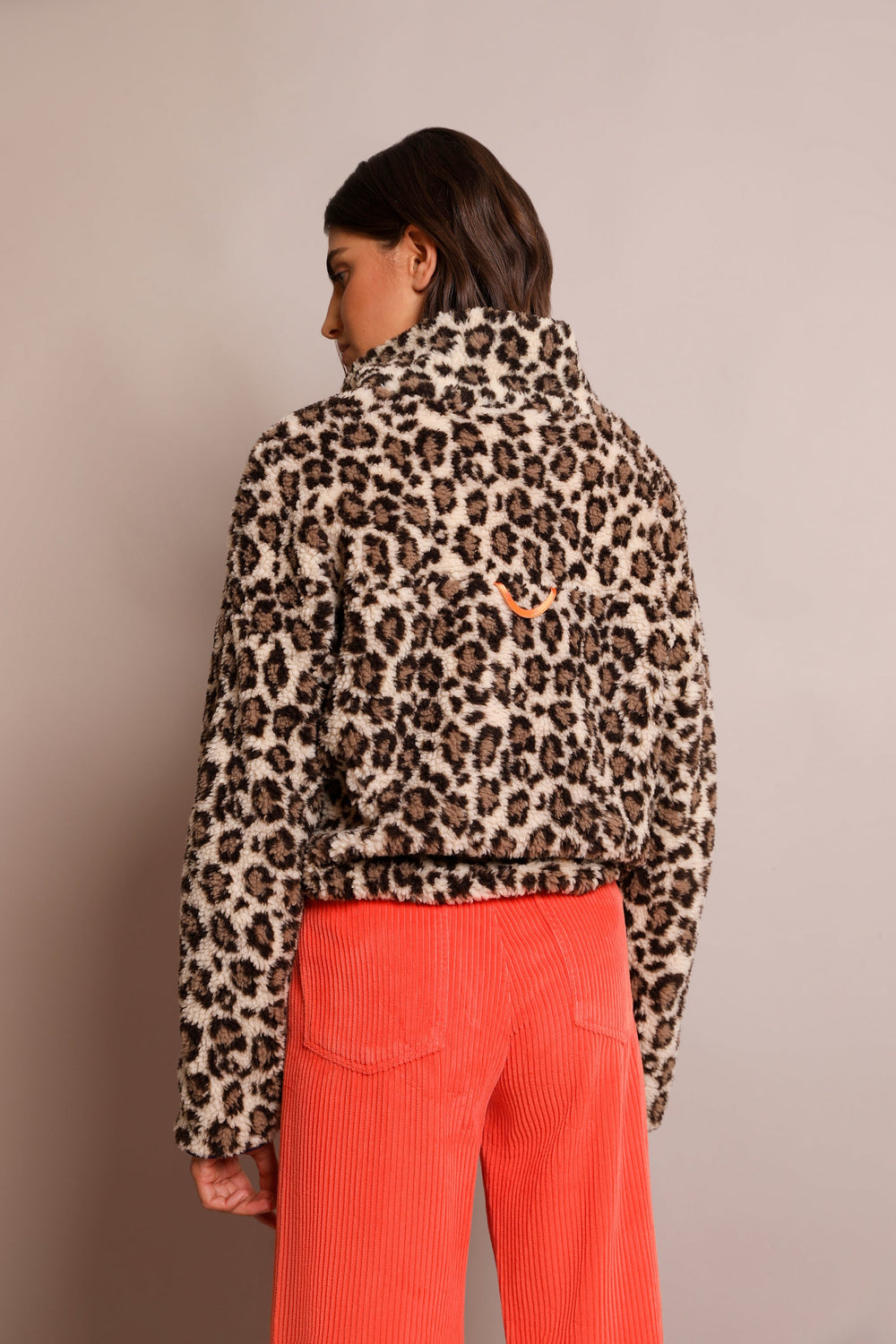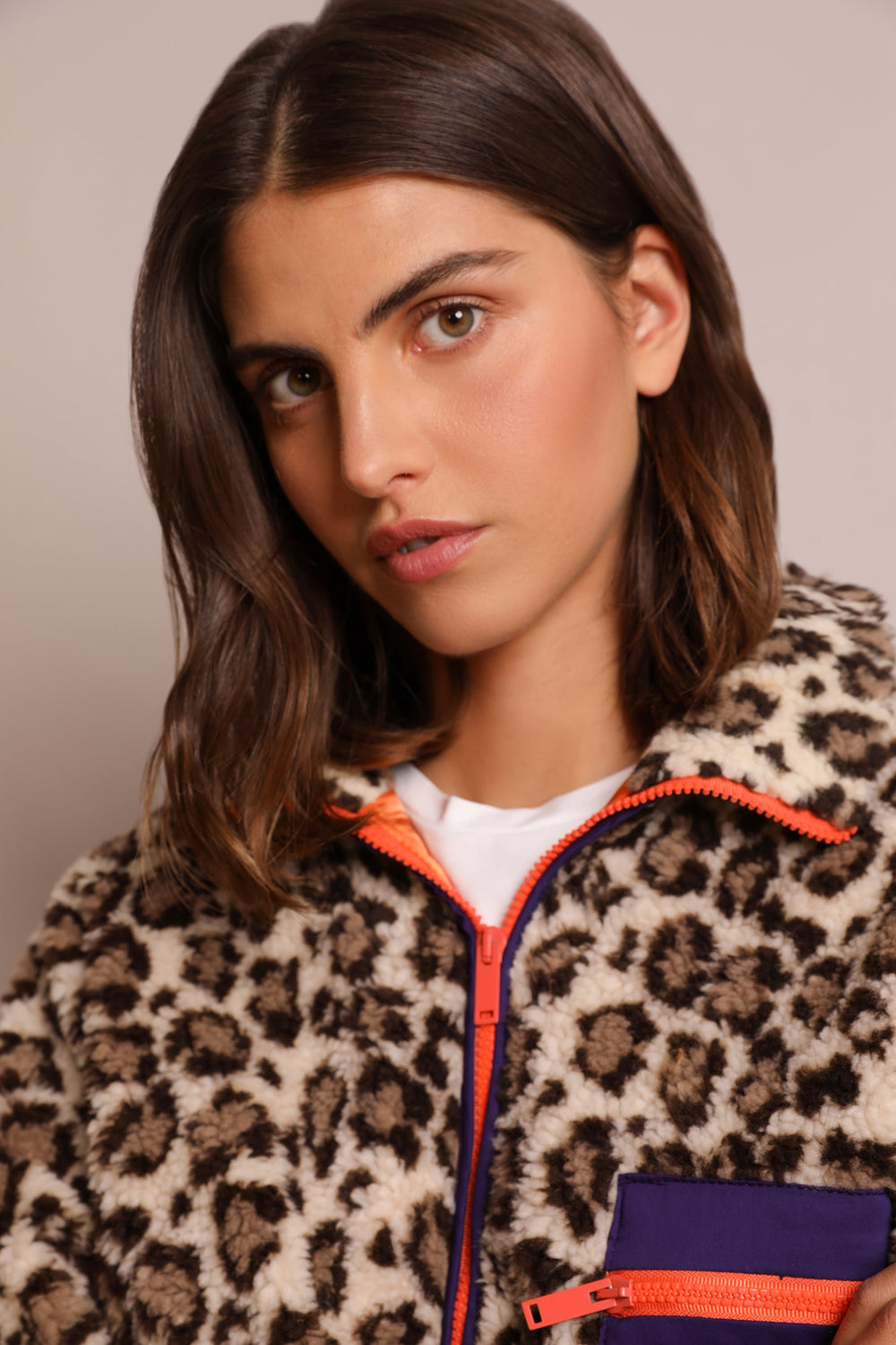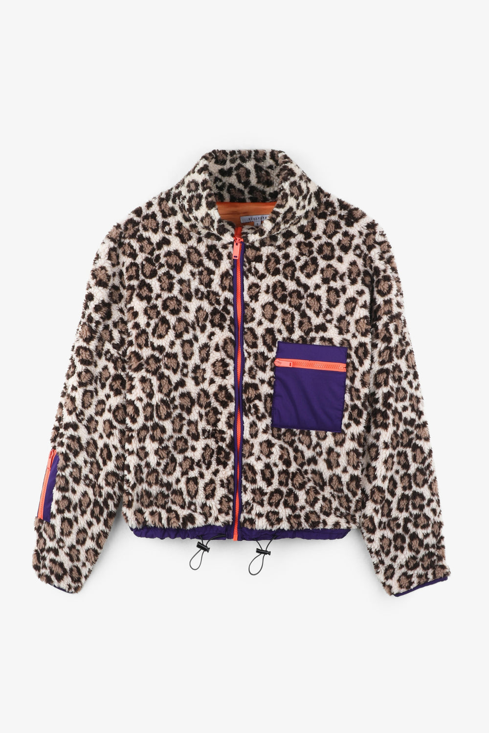 Fleece jacket with animal print, made from shearling fabric. Regular fit, high collar and contrast zip fastening. Long sleeves and contrast front zip pocket. Contrast lining.
