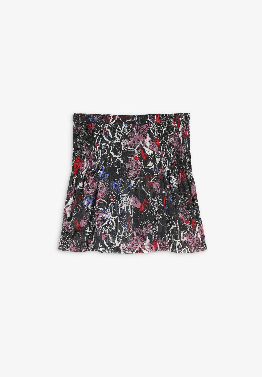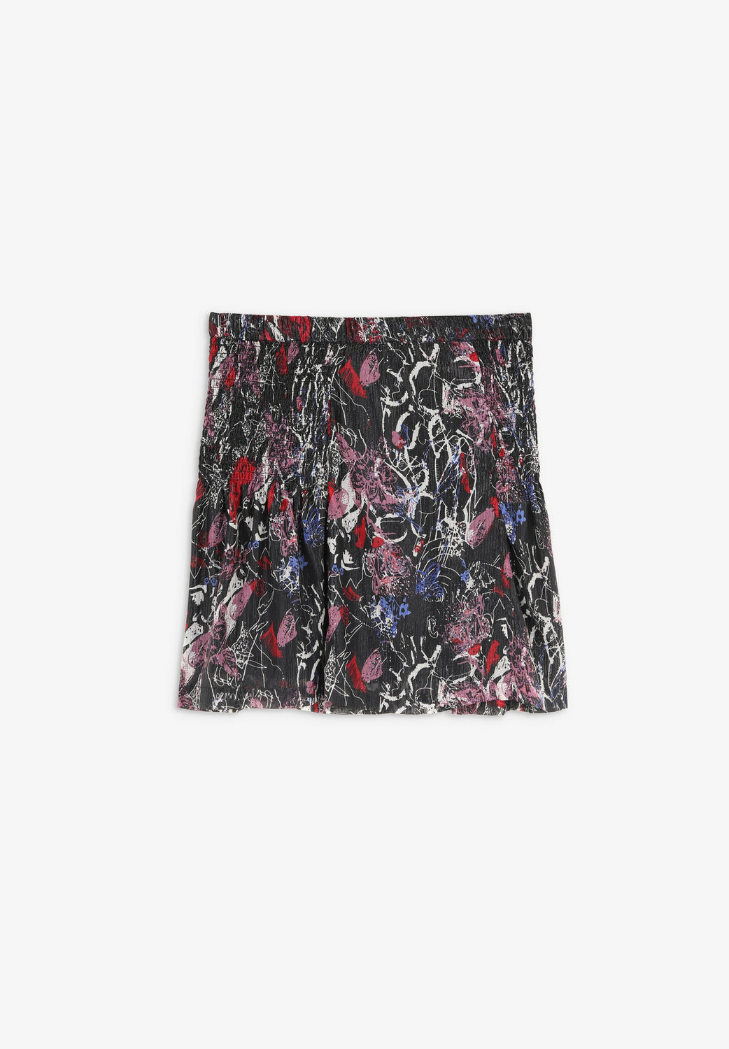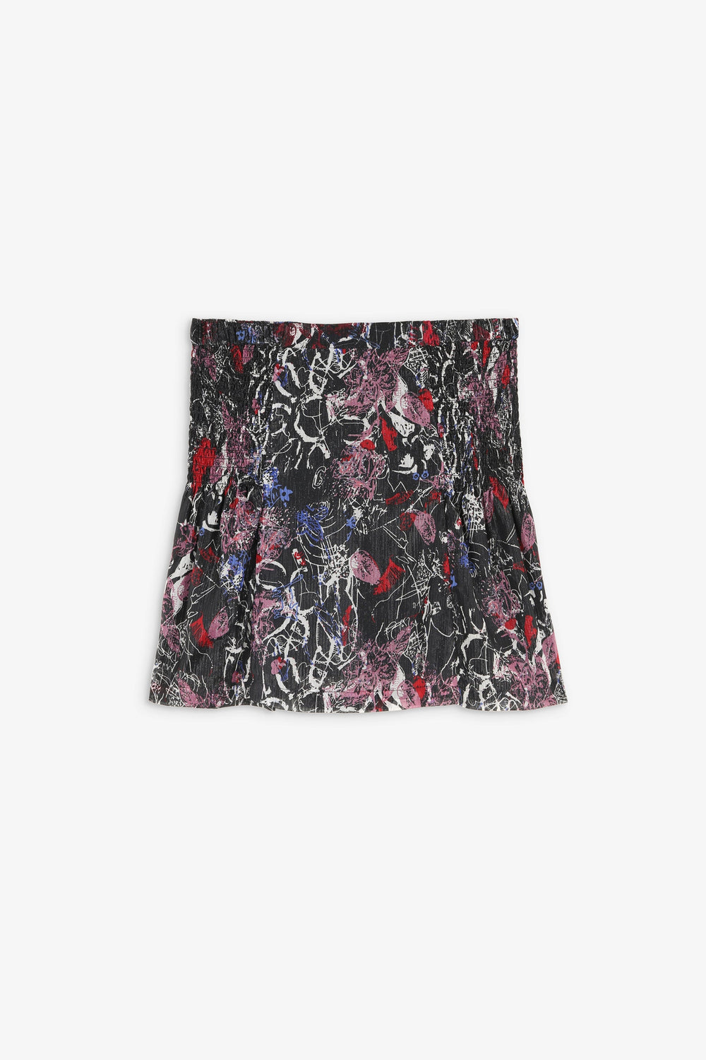 Mini skirt with print, made with metallic thread. Smocking on the sides and hem with ruffles.