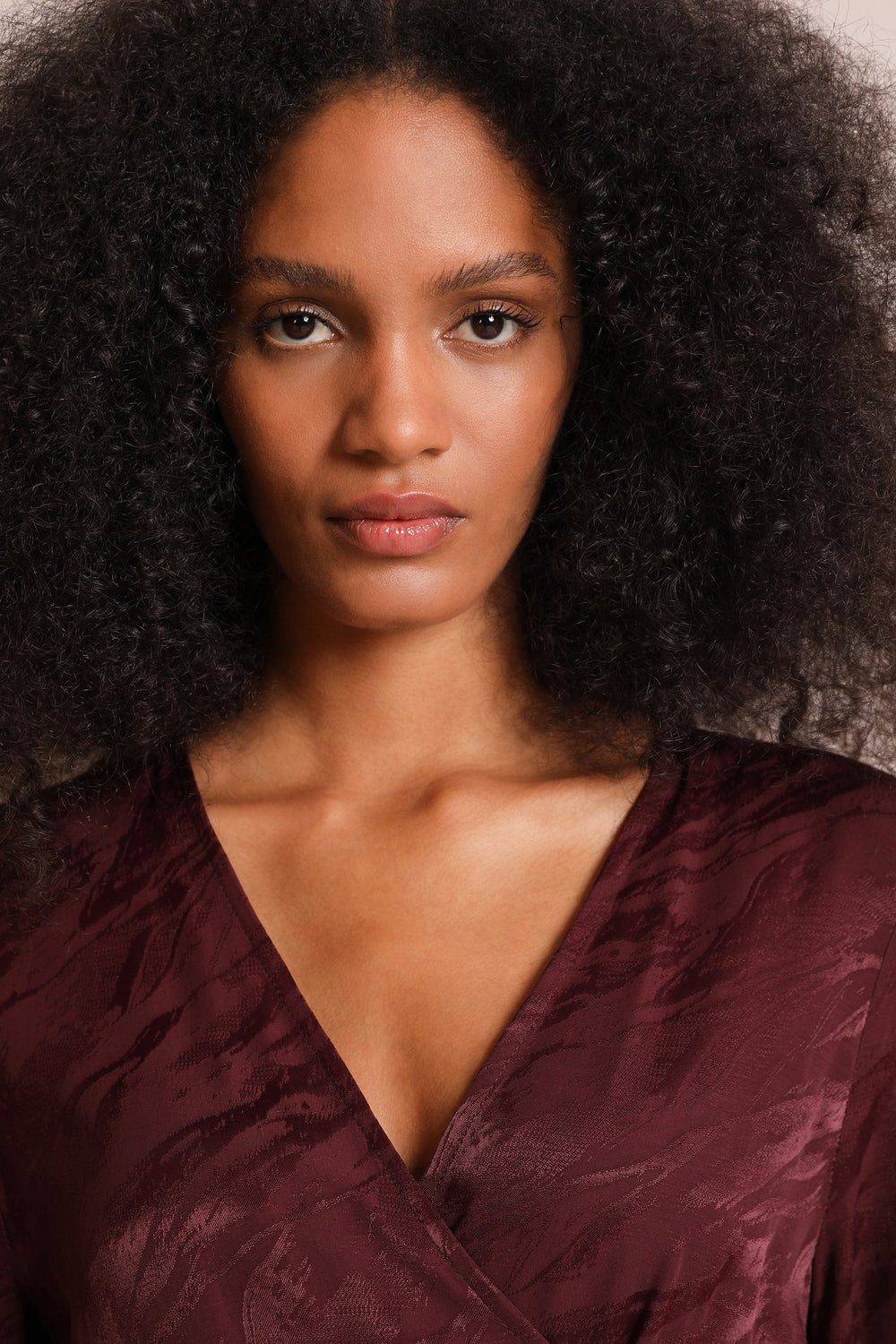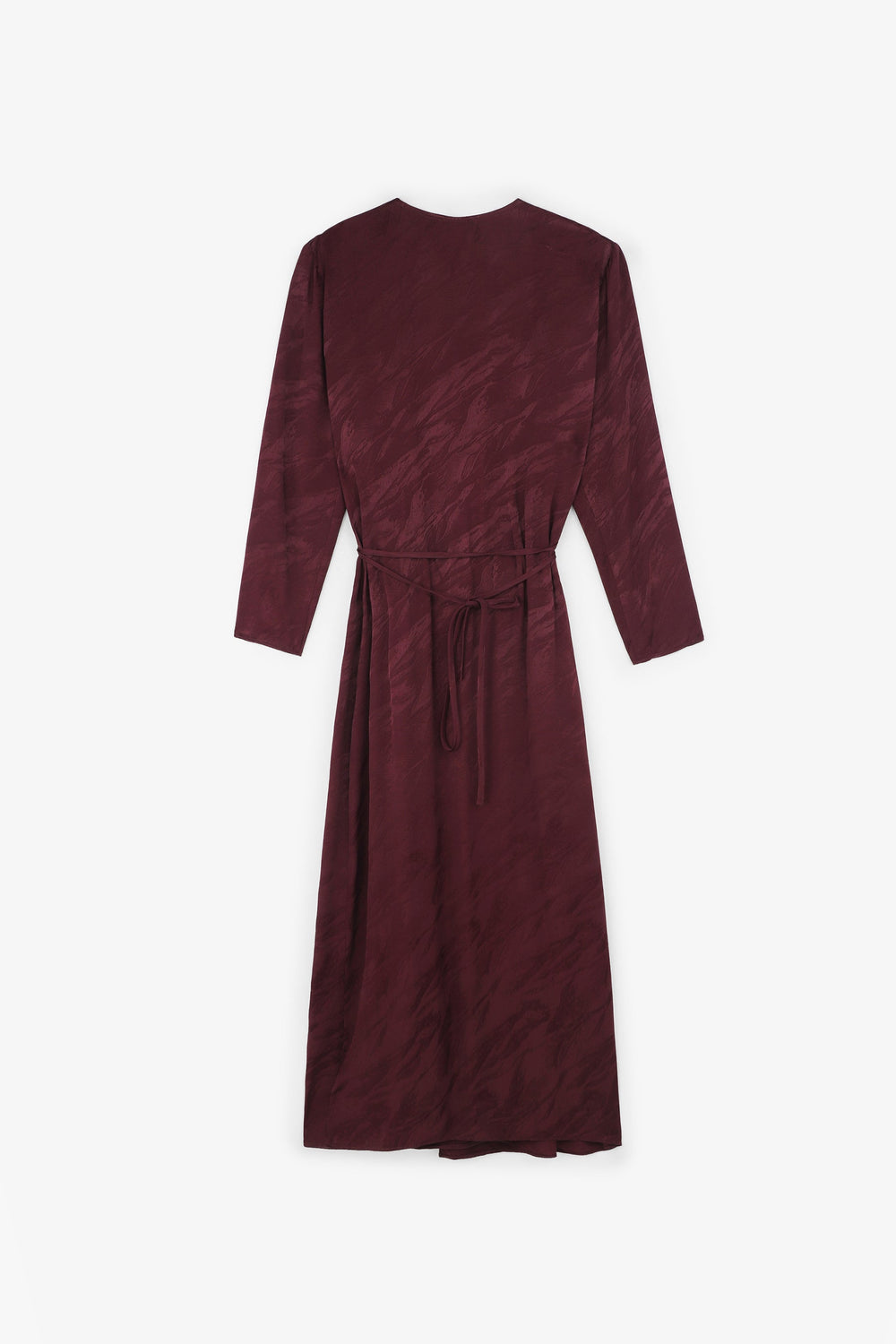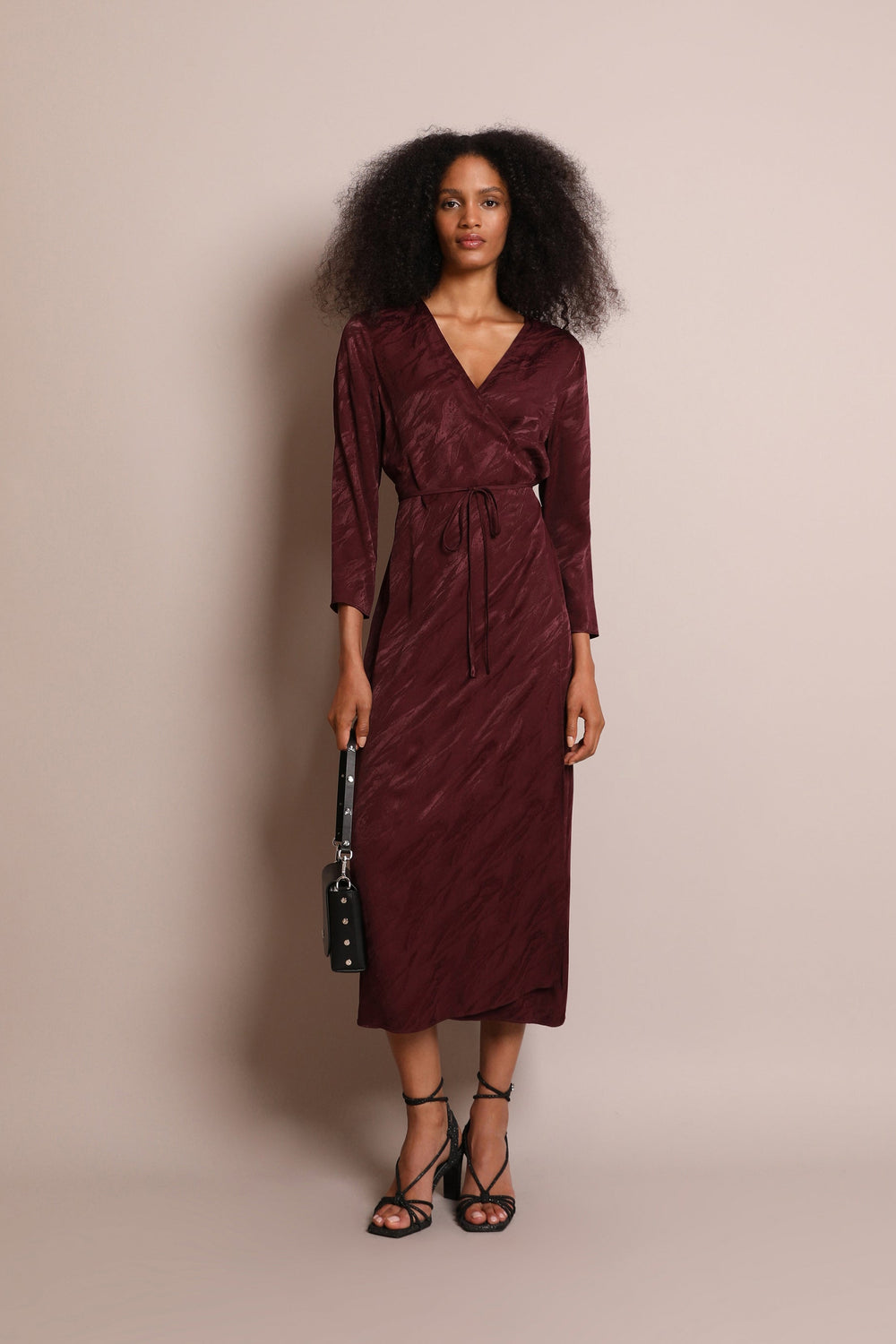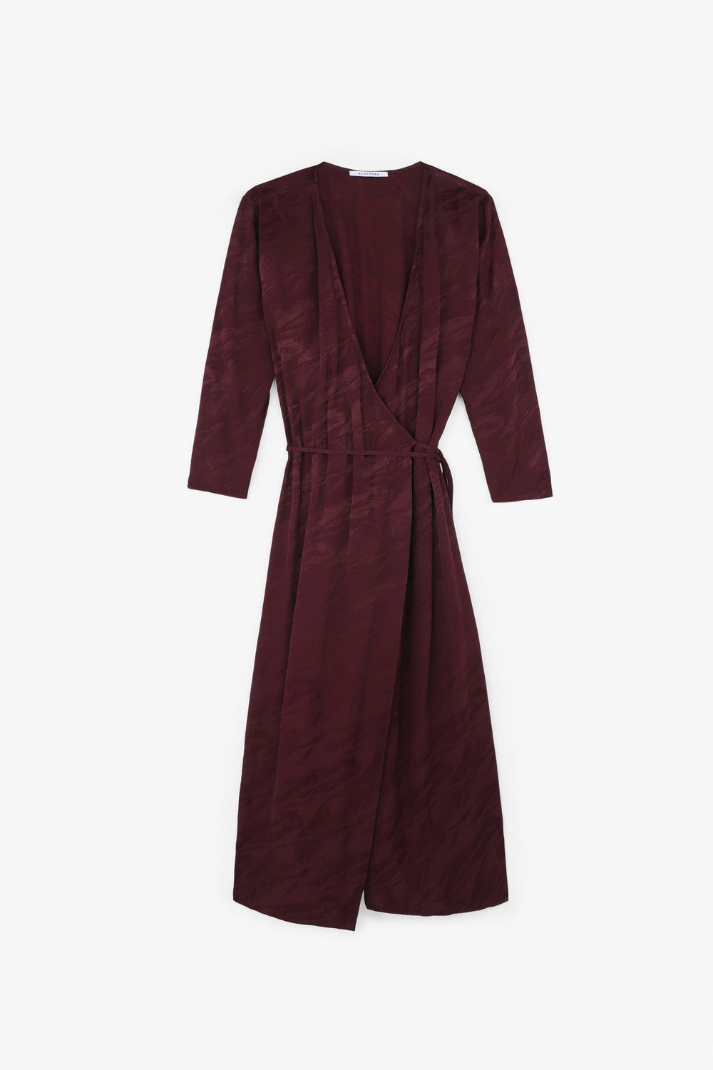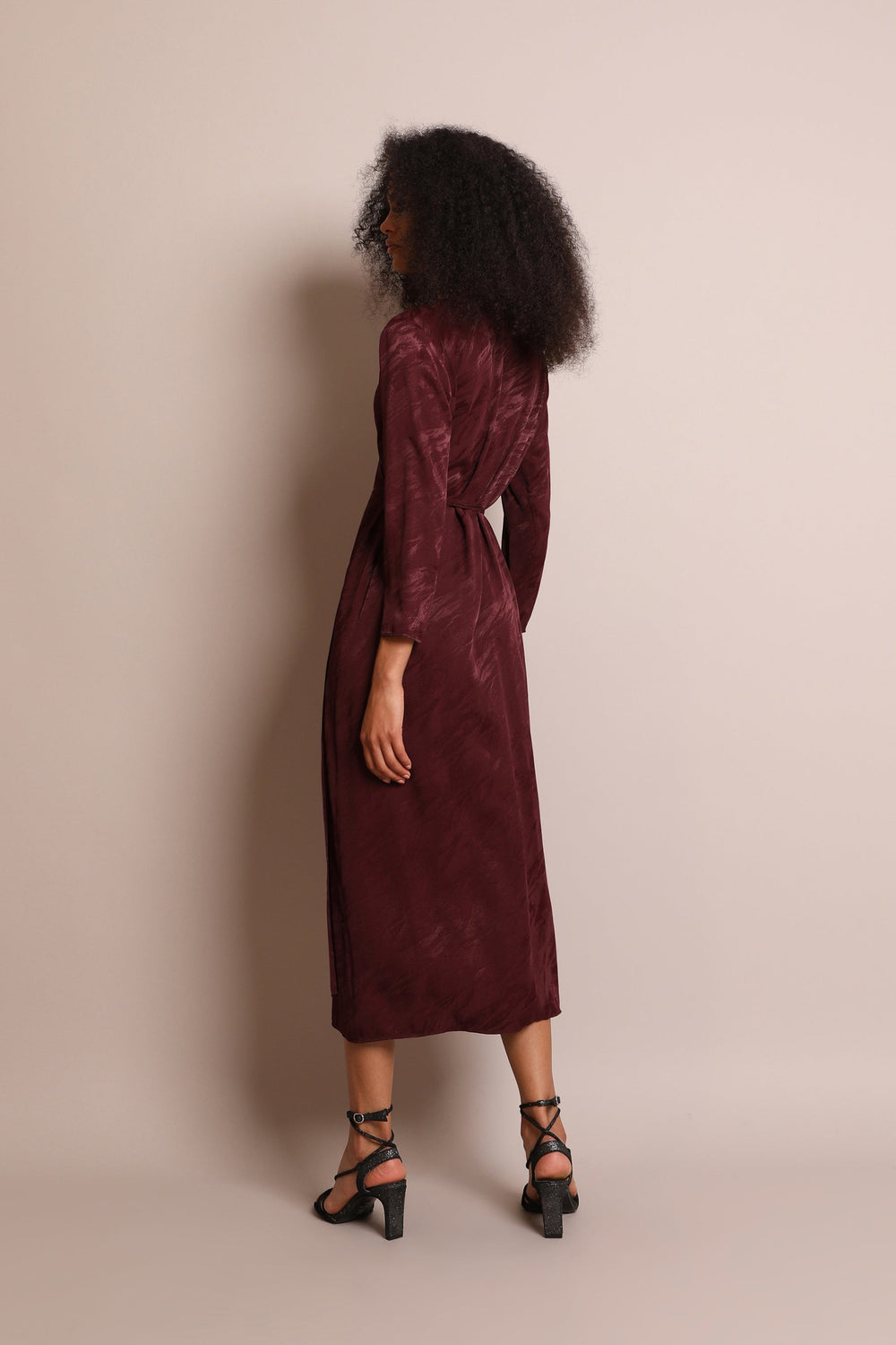 Midi dress made from jacquard loose-fitting fabric. Regular fit, featuring a V-neck crossover fastening with a bow. Long sleeves.