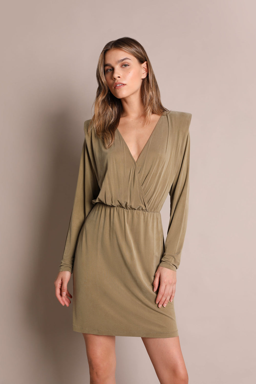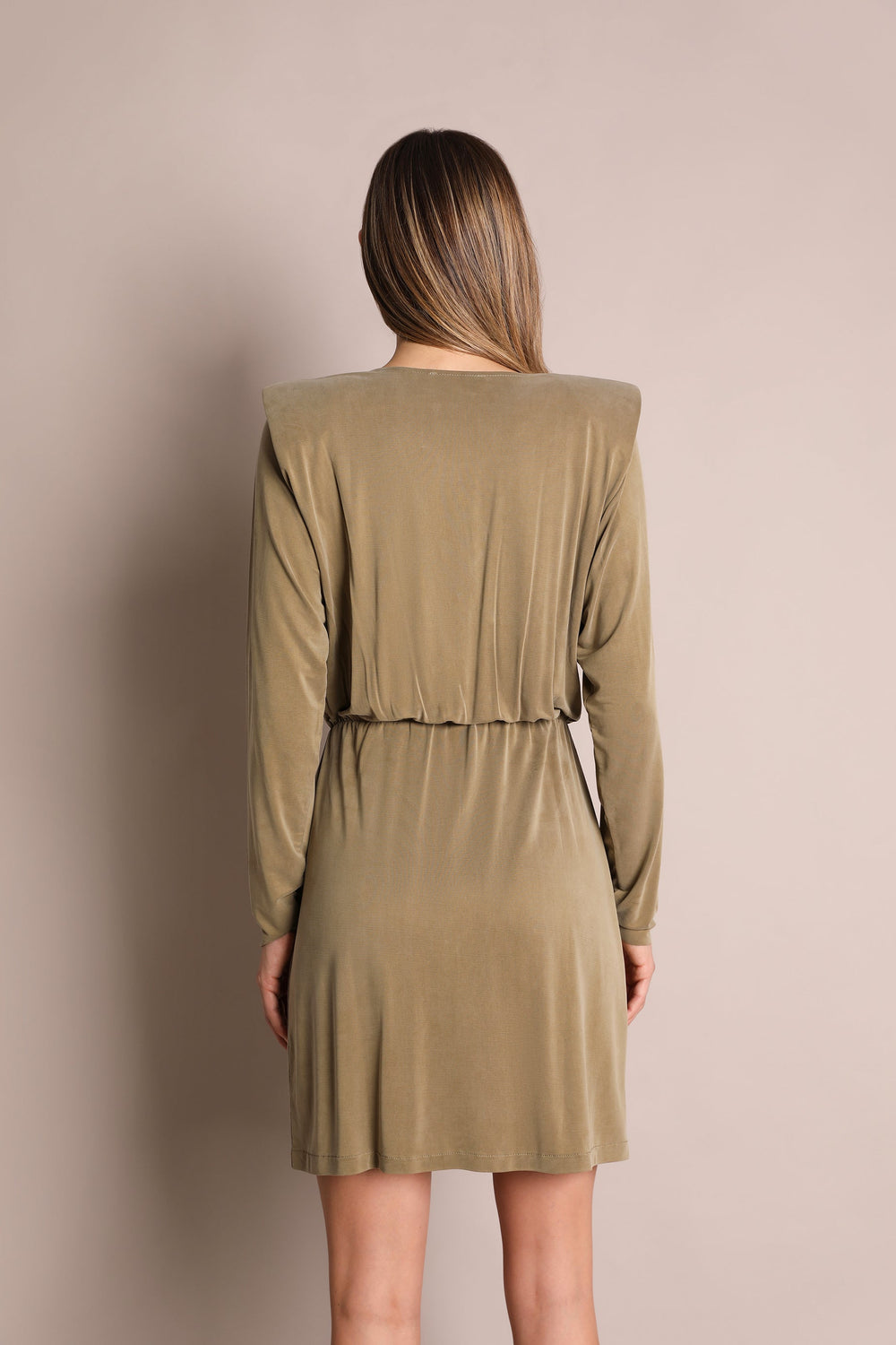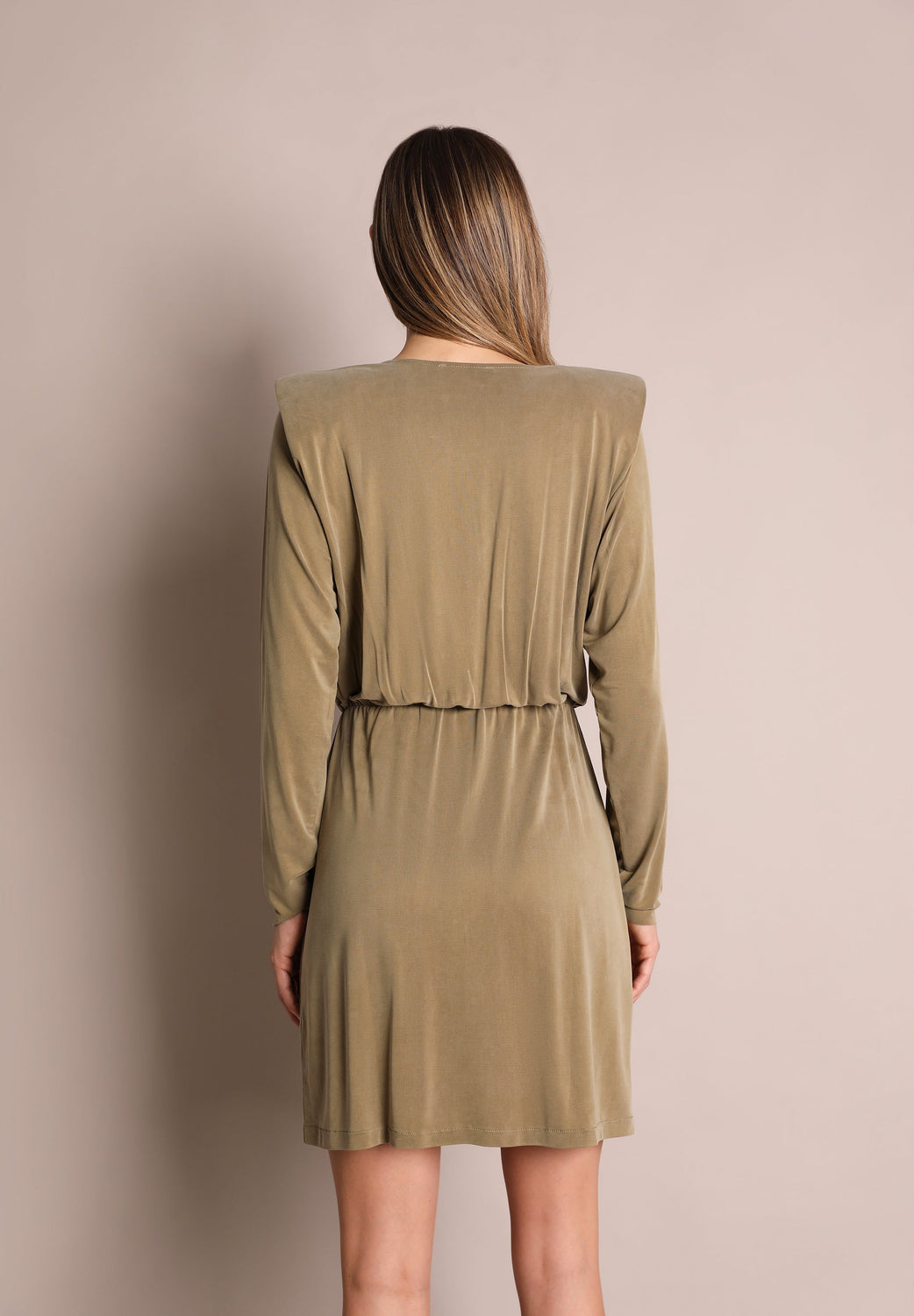 Mini dress. Made from a cupro fabric blend, regular fit, crossover V-neckline, long sleeves with shoulder pads and cut-out waist.