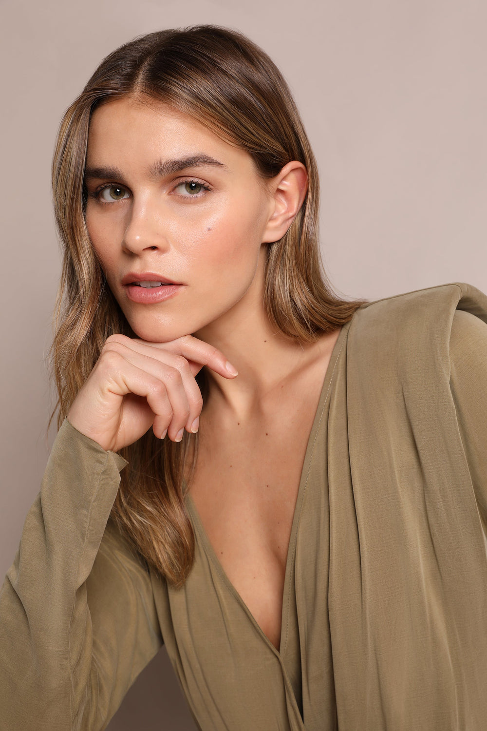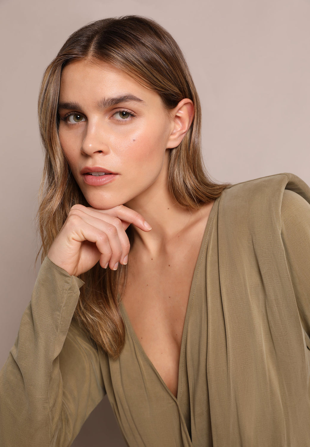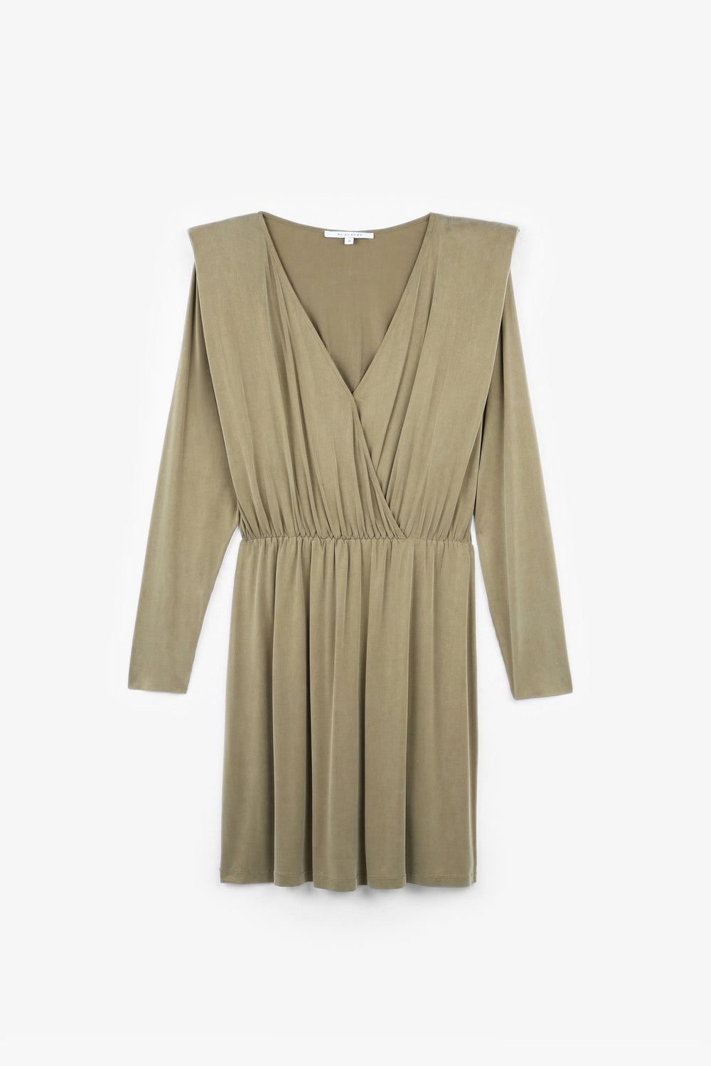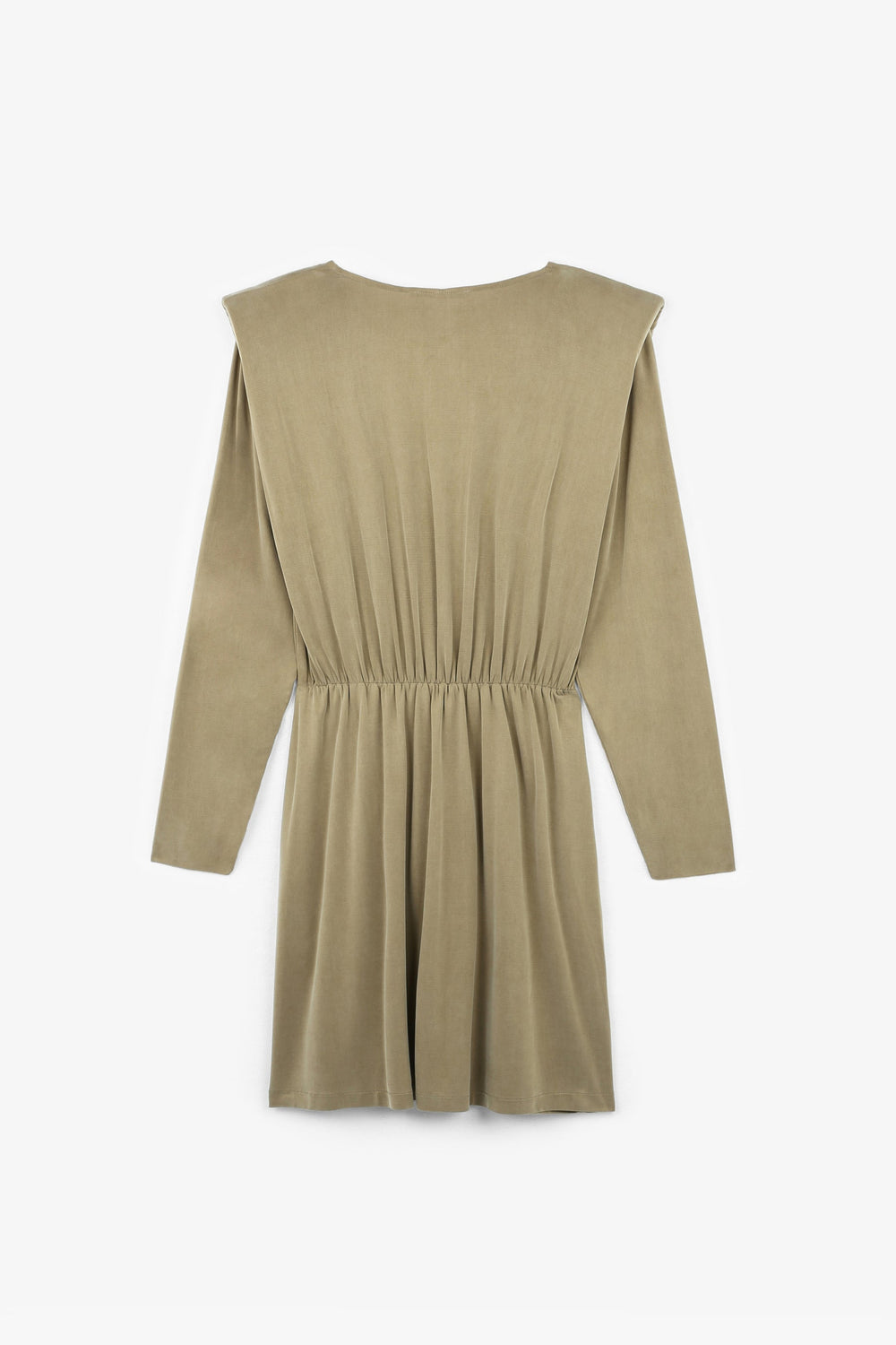 Mini dress. Made from a cupro fabric blend, regular fit, crossover V-neckline, long sleeves with shoulder pads and cut-out waist.