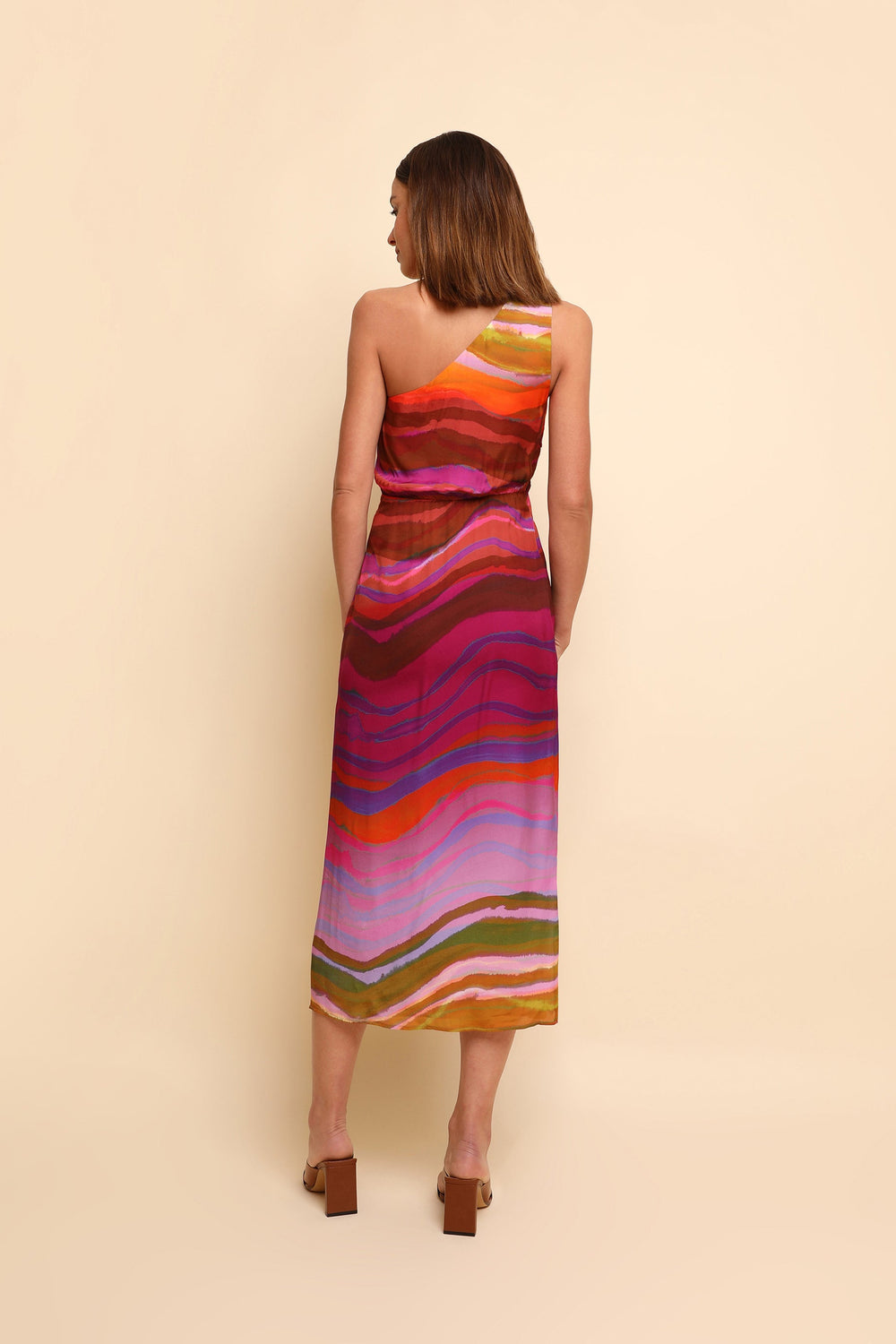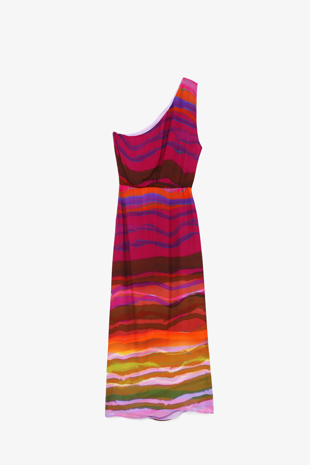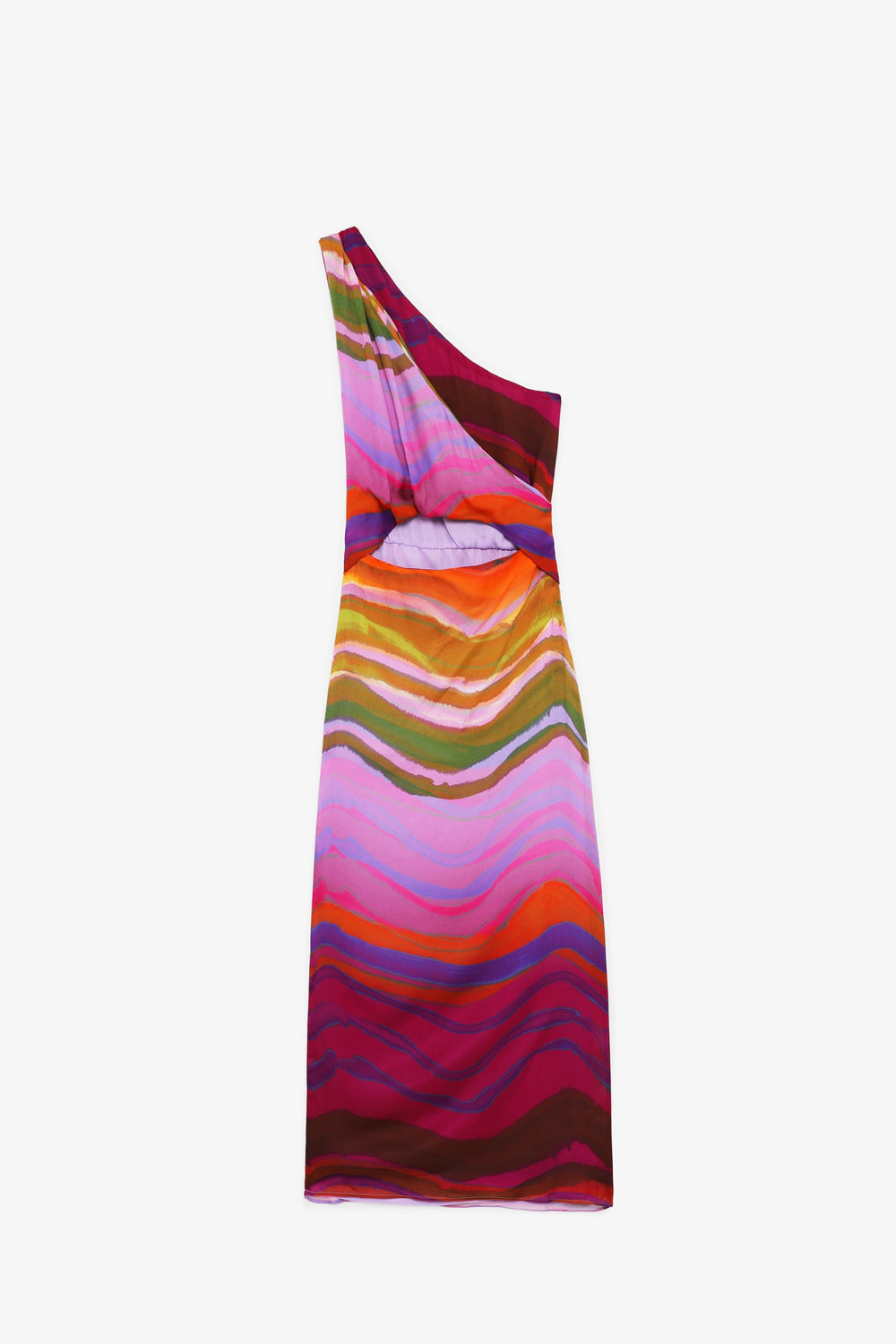 Satin midi dress made of flowing fabric. Slim fit, asymmetric neckline and zip fastening. Front slit.