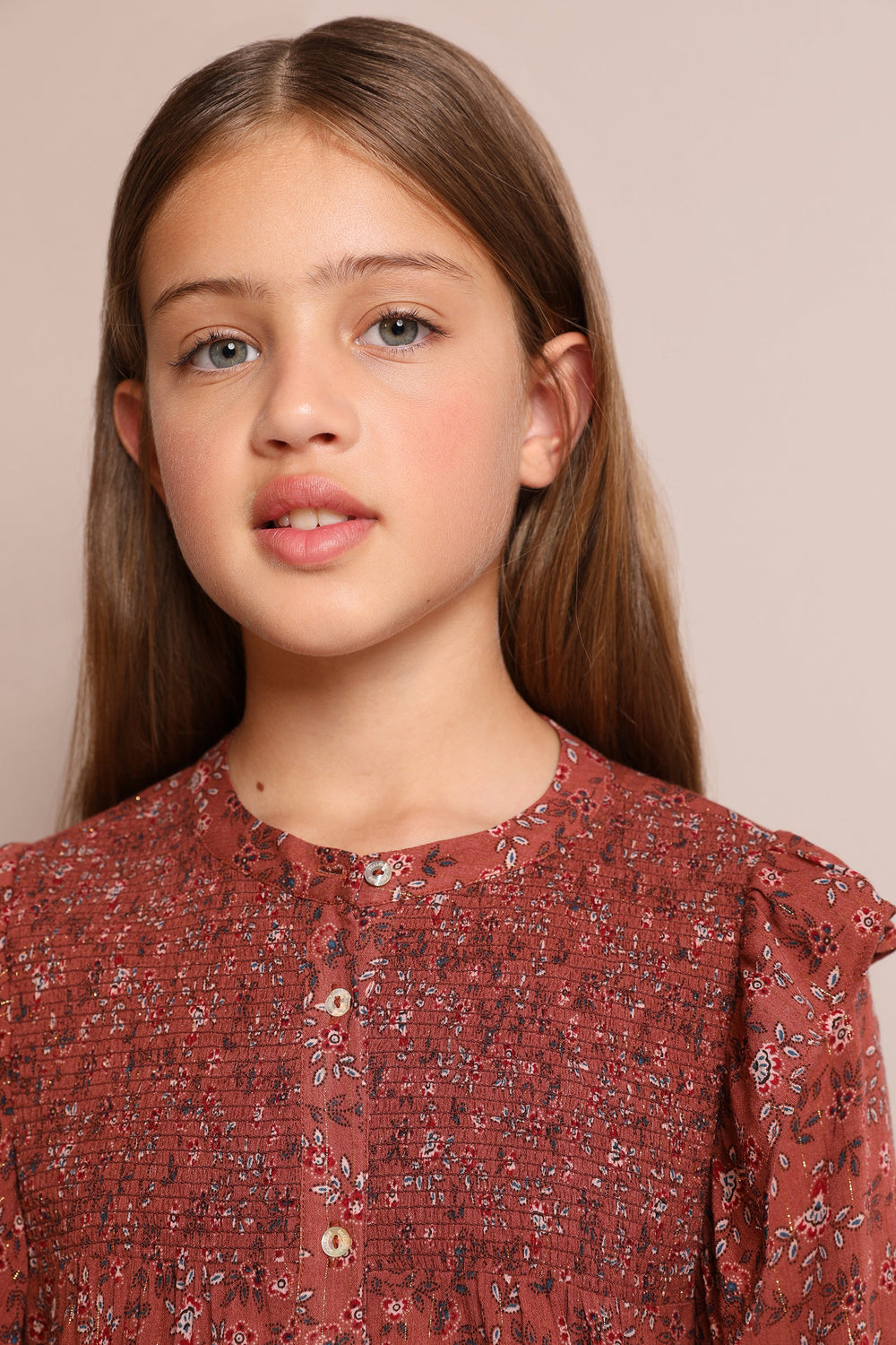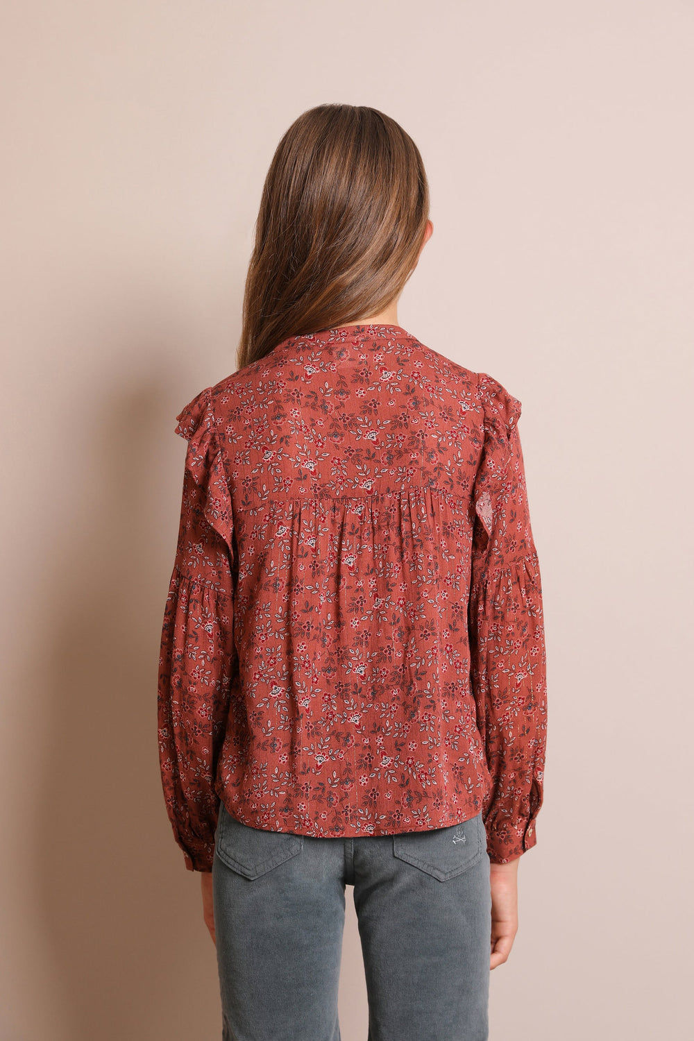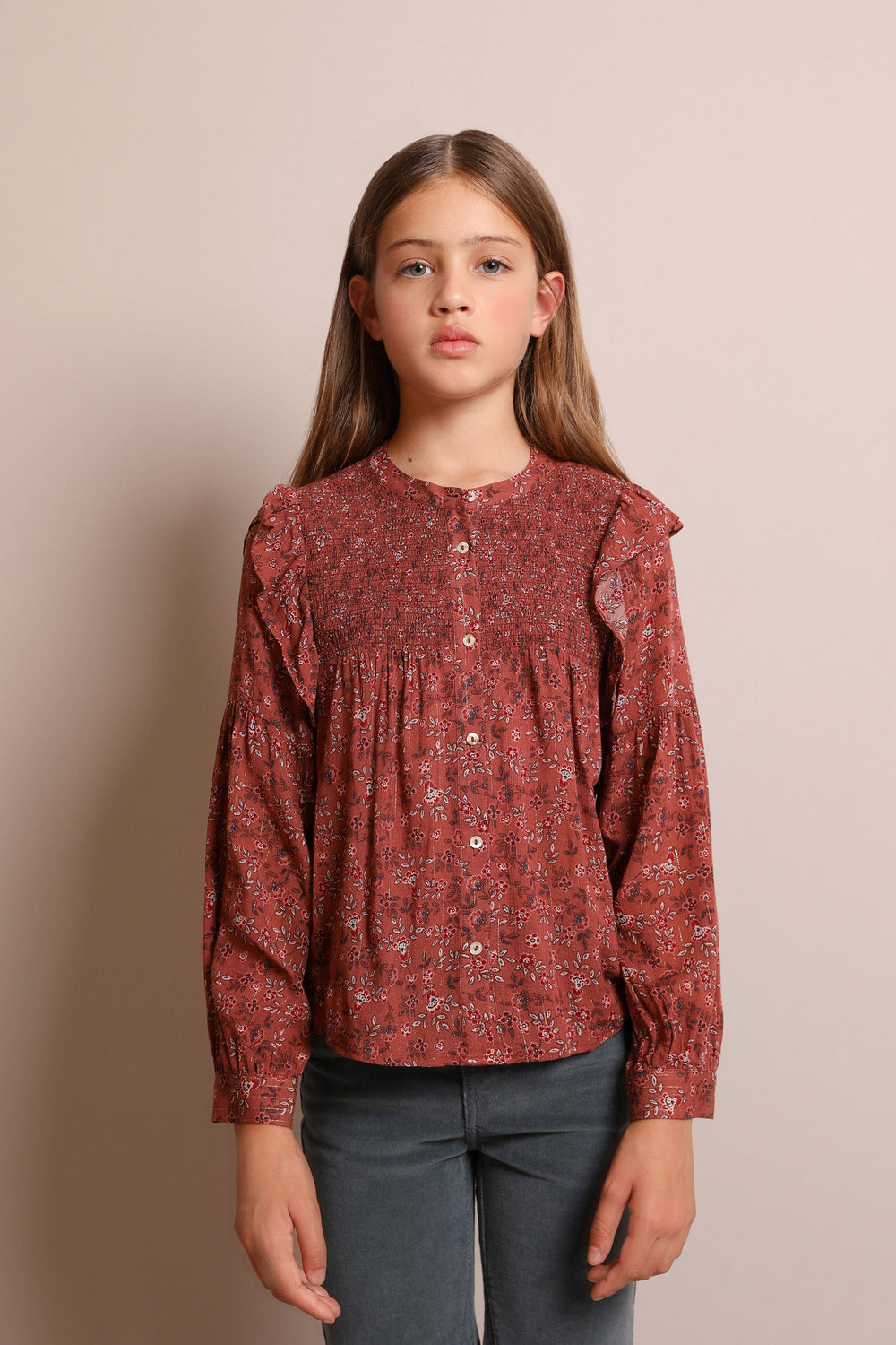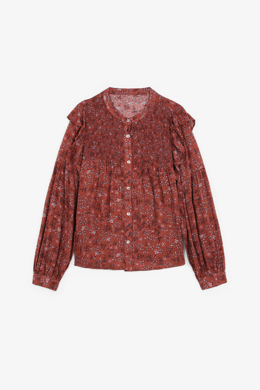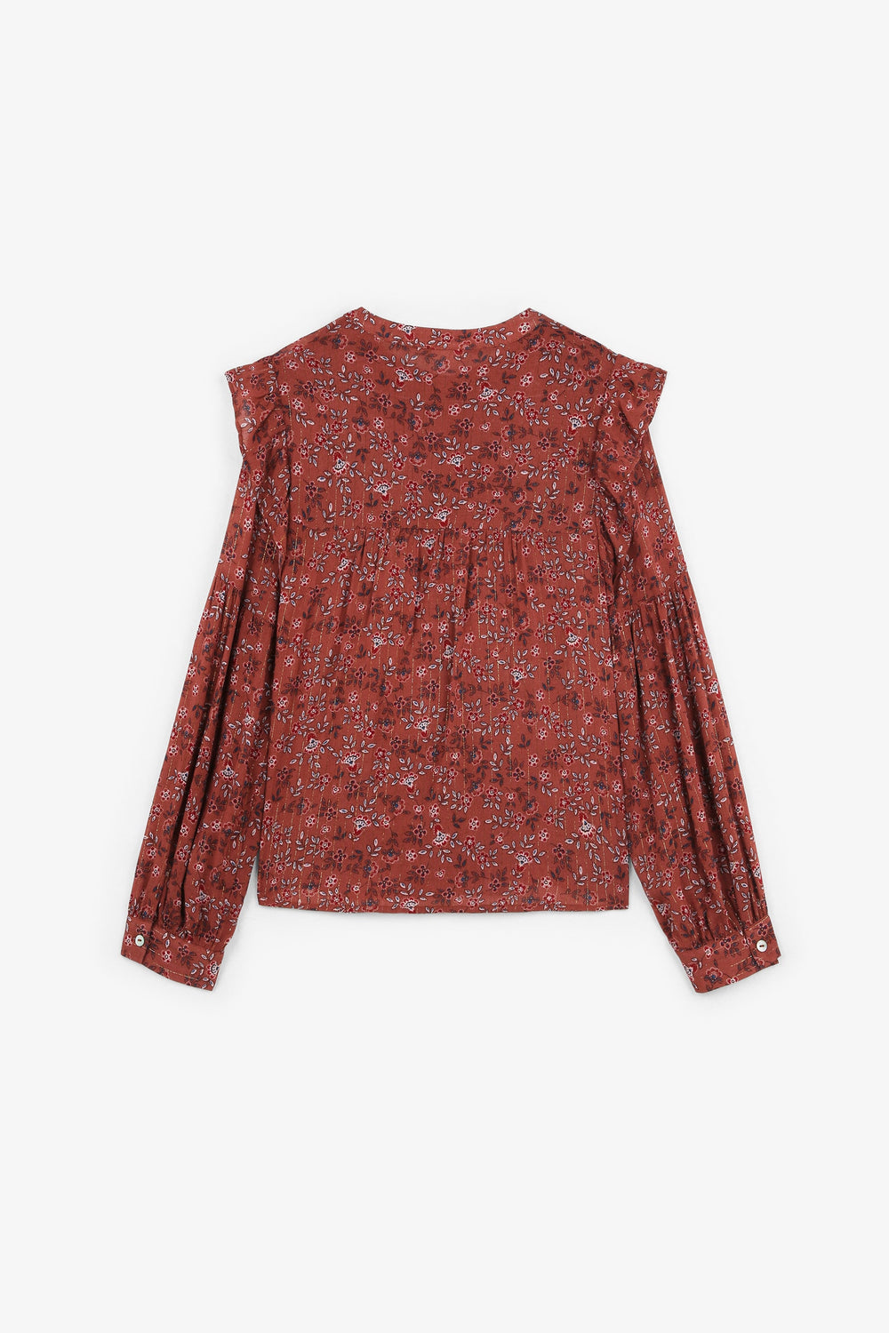Printed blouse with lurex thread. Made from loose-fitting fabric, regular fit, round neck, long sleeves with cuffs, ruffles on the shoulders and wasp nest effect detail on the front and upper back.