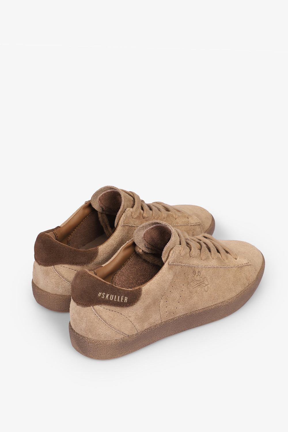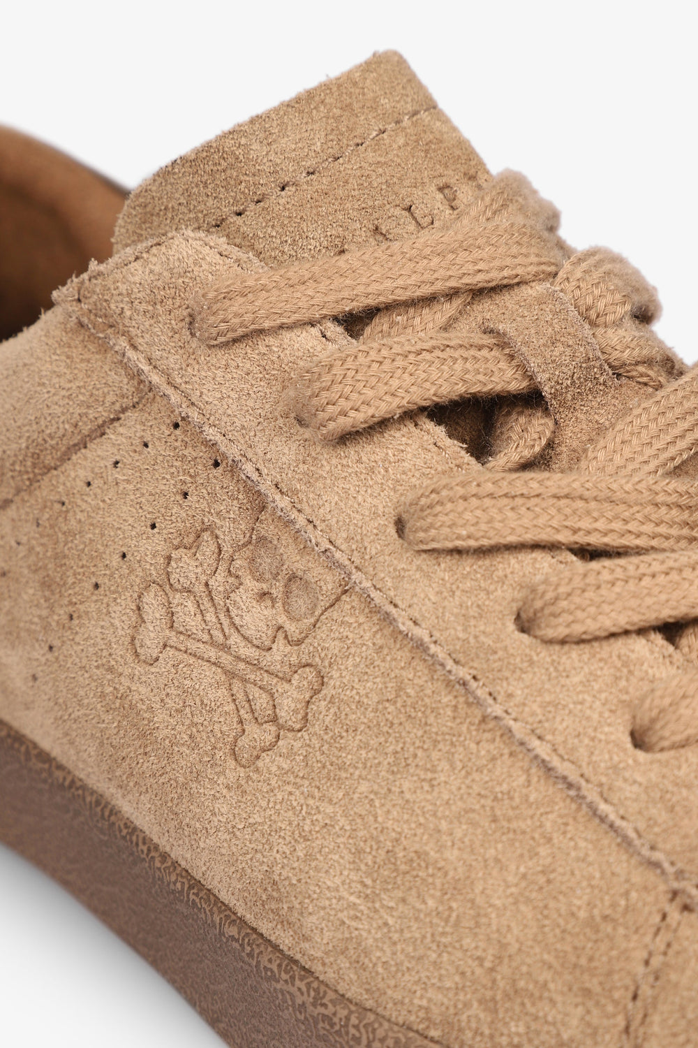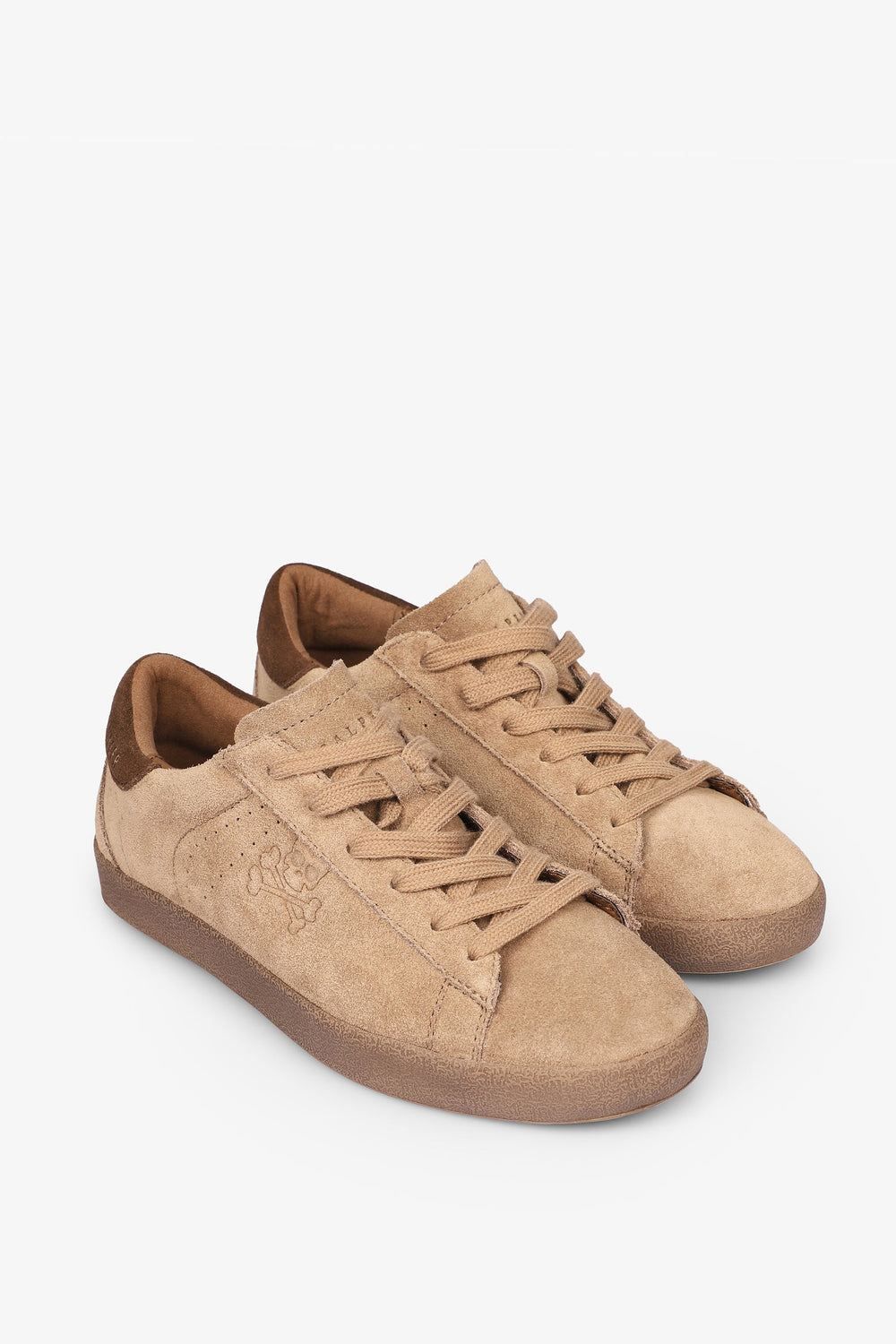 Low top sneakers made from leather and finished in suede. Matching lace-up fastening, rubber soles and perforated skull details on the sides.