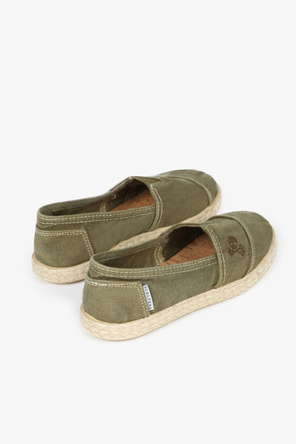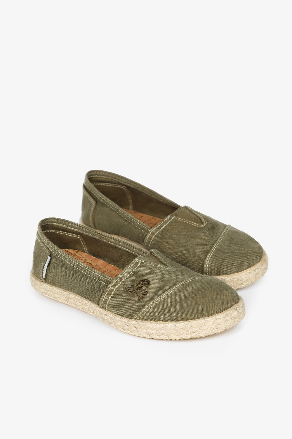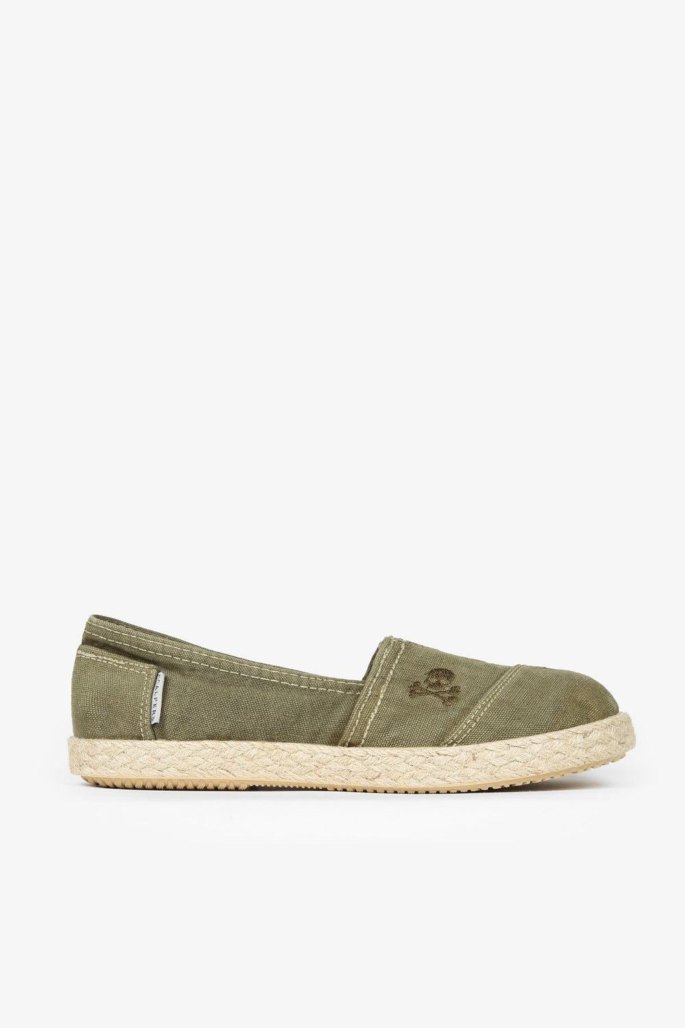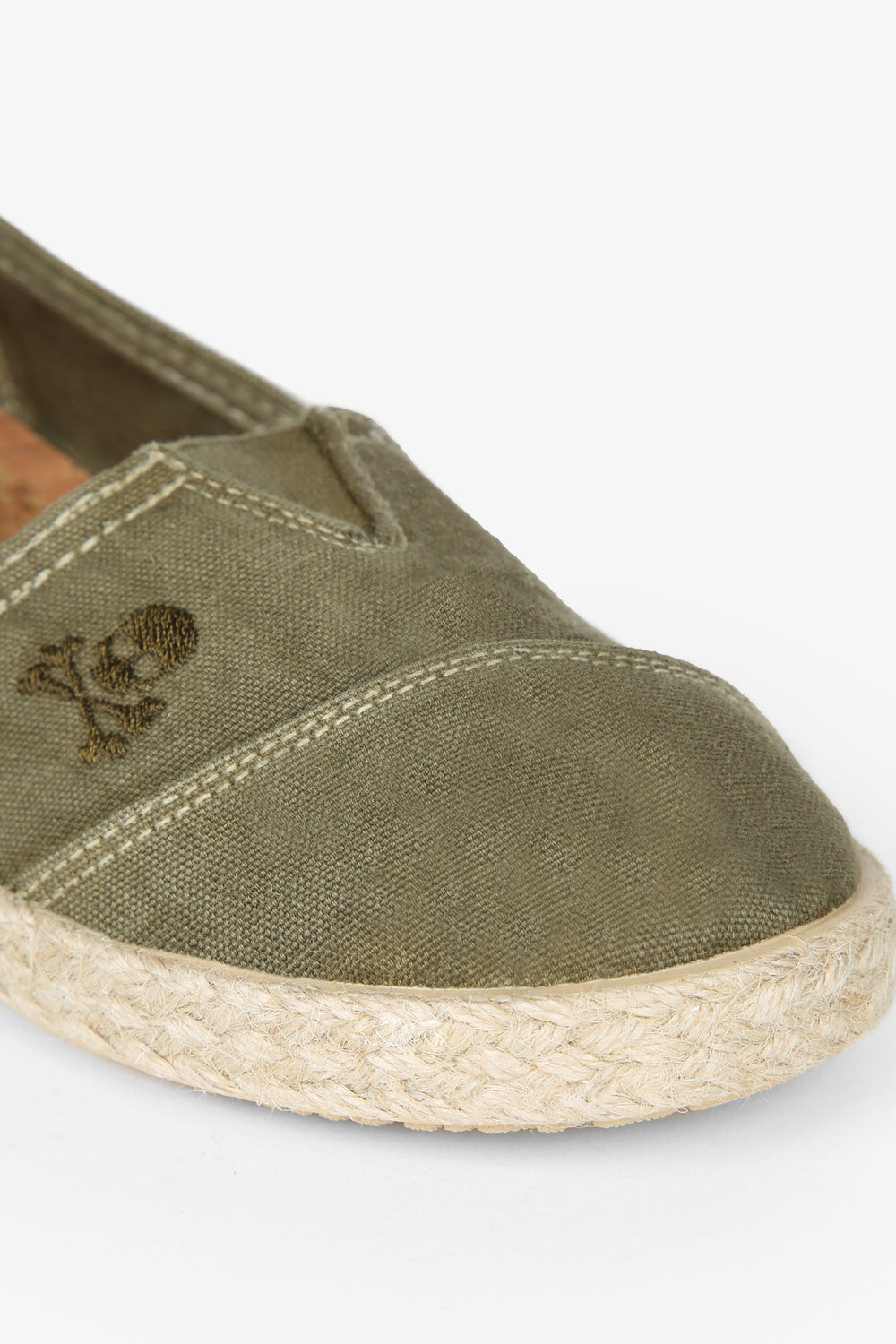 Canvas espadrilles made of 100% recycled cotton. Esparto grass and rubber sole with embroidered skull detail and label.