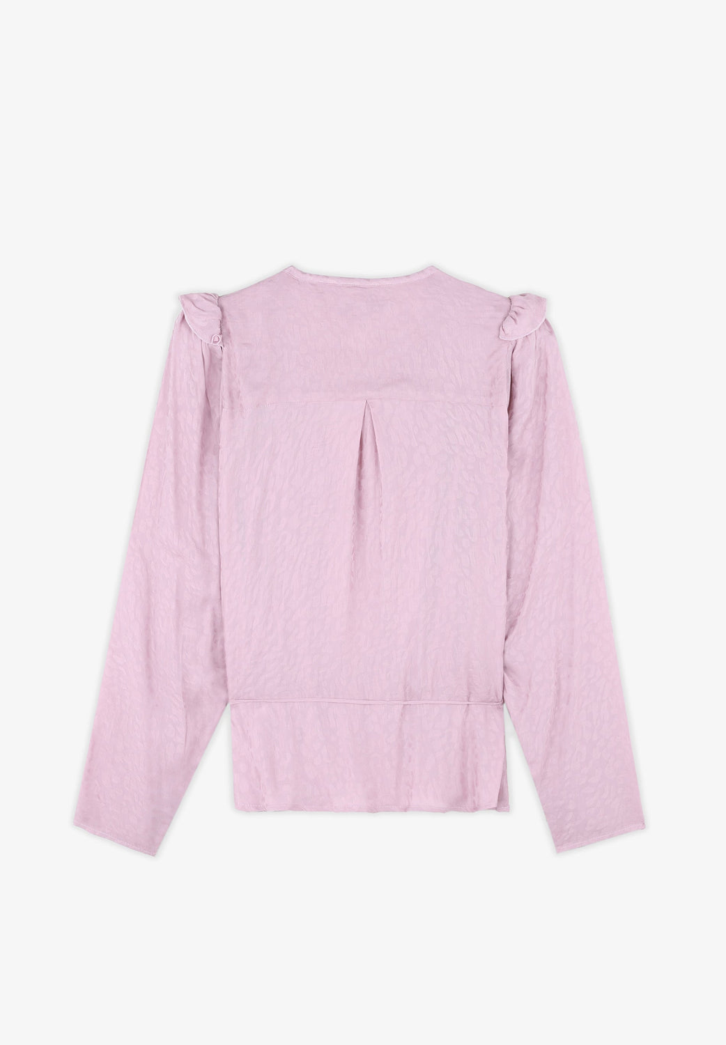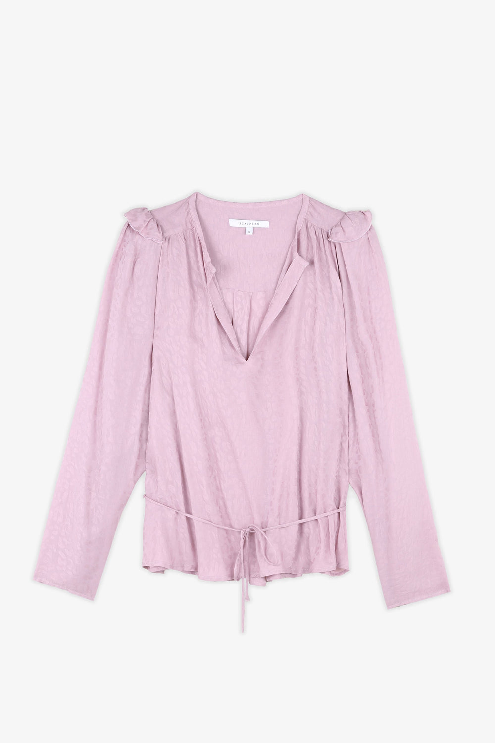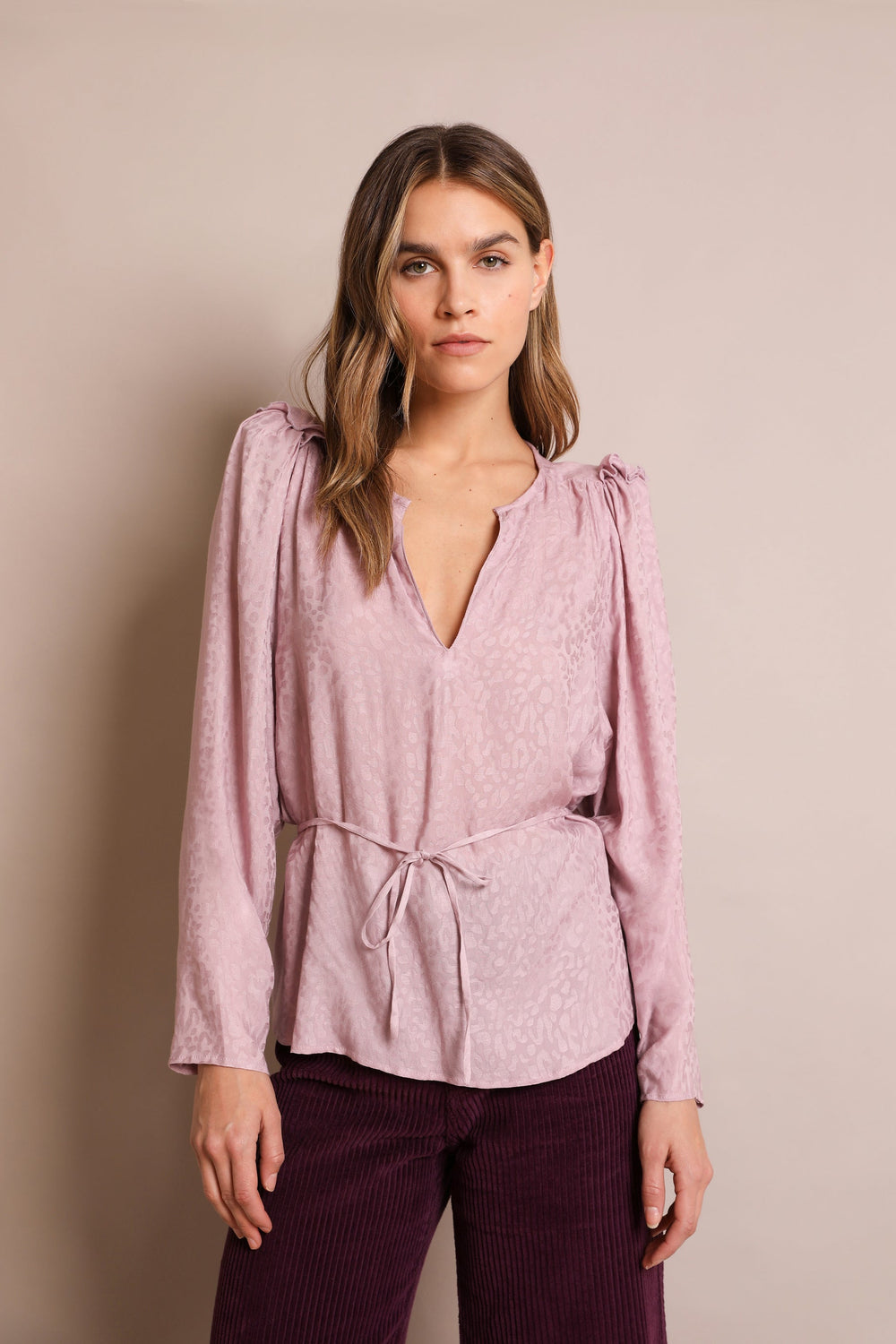 Blouse with animal print jacquard made from flowing fabric. Regular fit with a bow at the waist, a V-neck and long sleeves with button fastenings. Mini frill detail on the shoulders.