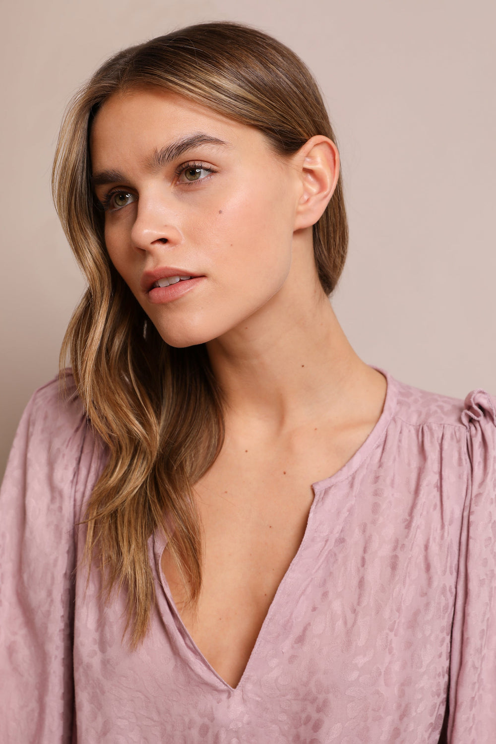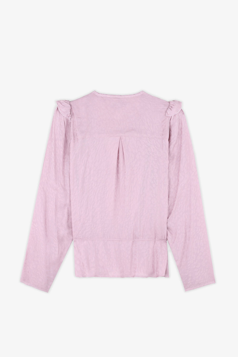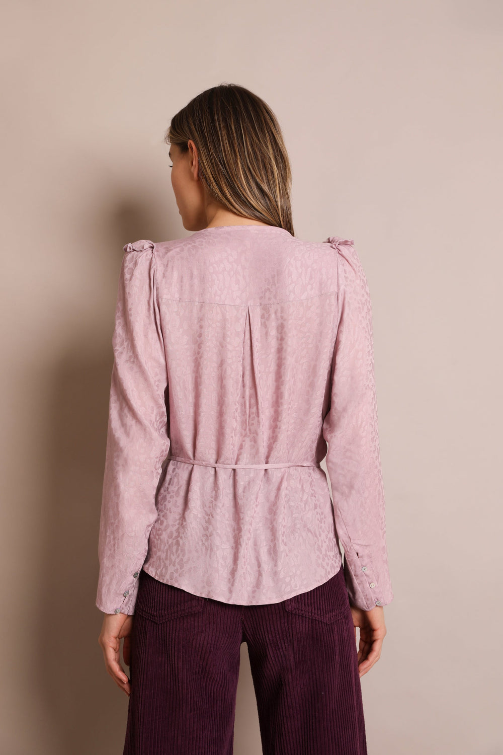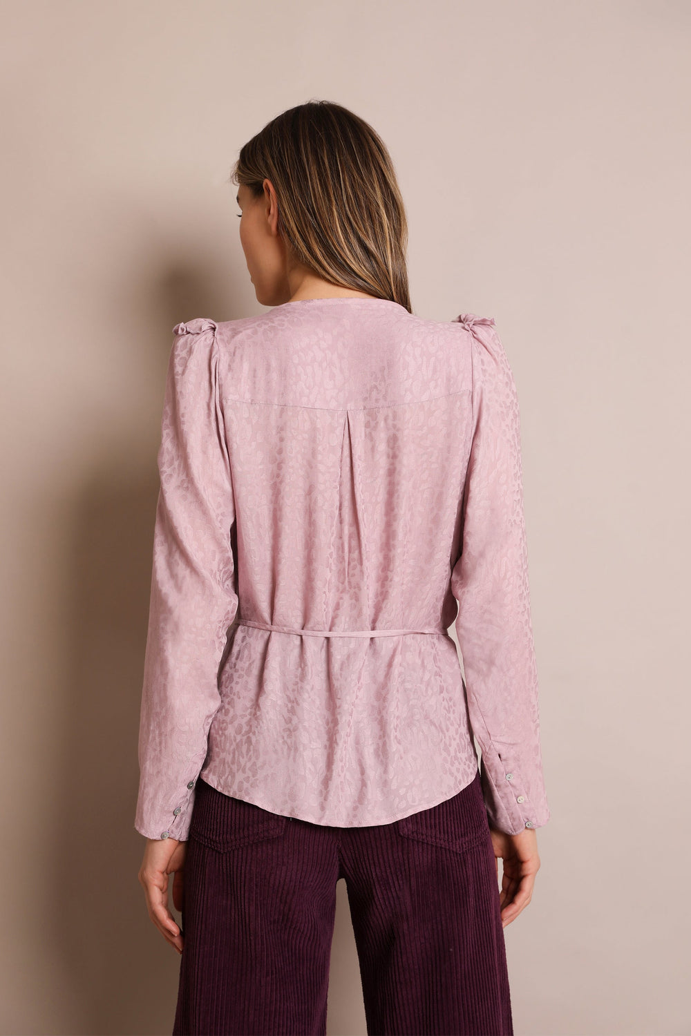 Blouse with animal print jacquard made from flowing fabric. Regular fit with a bow at the waist, a V-neck and long sleeves with button fastenings. Mini frill detail on the shoulders.