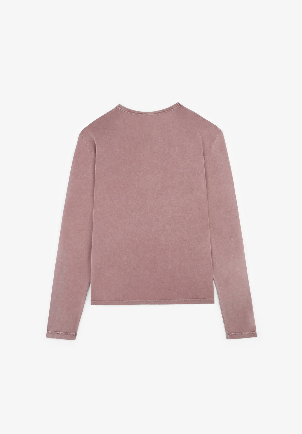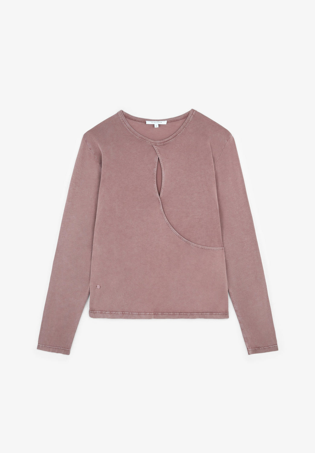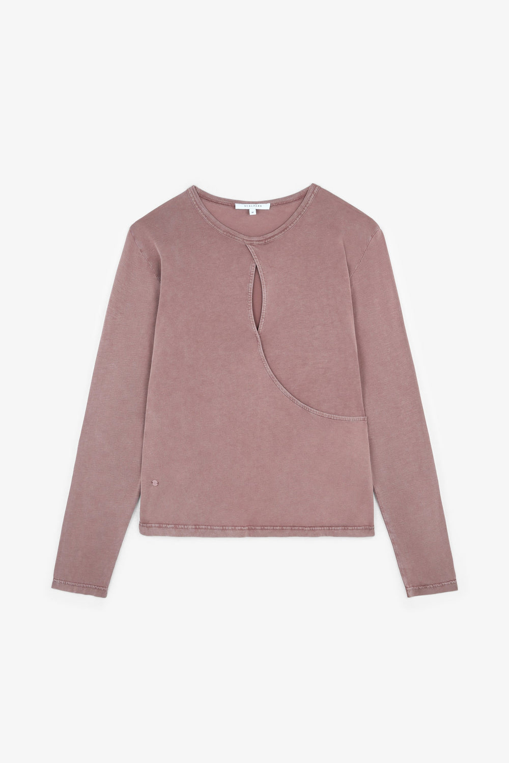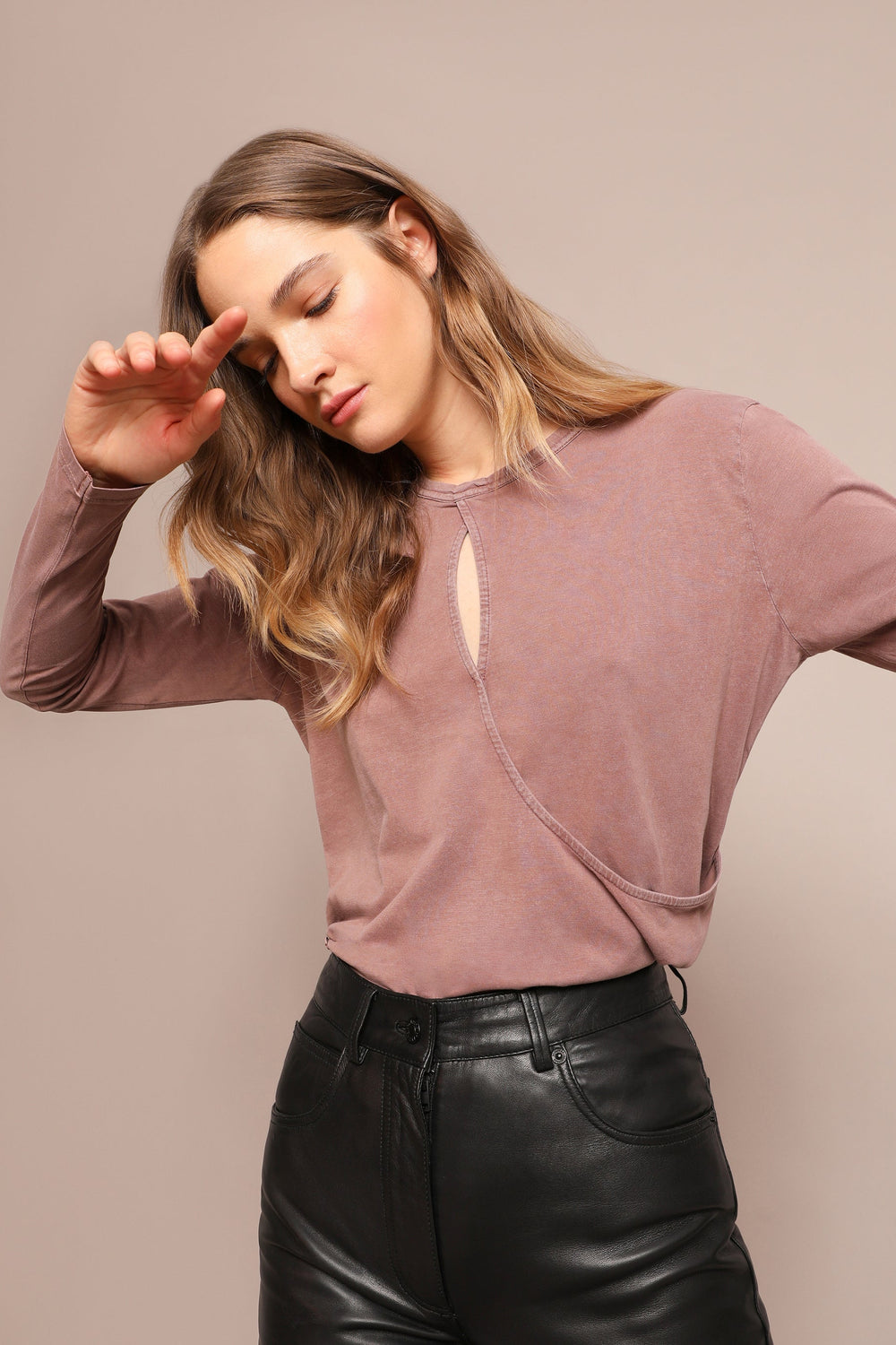 Faded T-shirt with a crossover detail on the front in an organic cotton blend. Regular fit, round neck and long sleeves. Cut-out at the neckline.