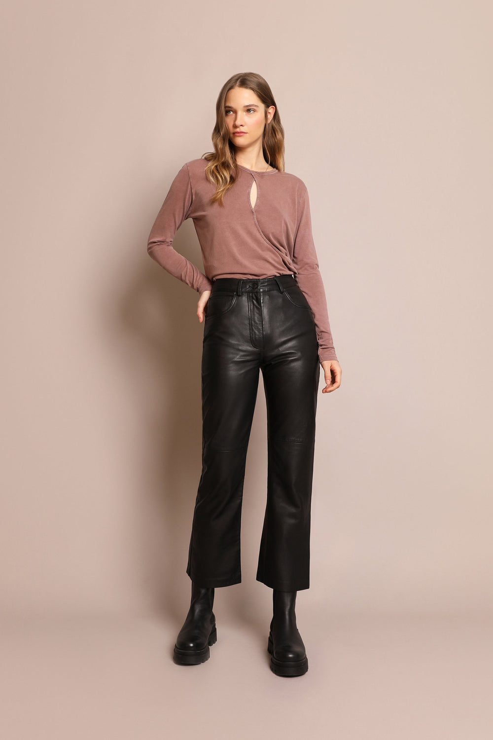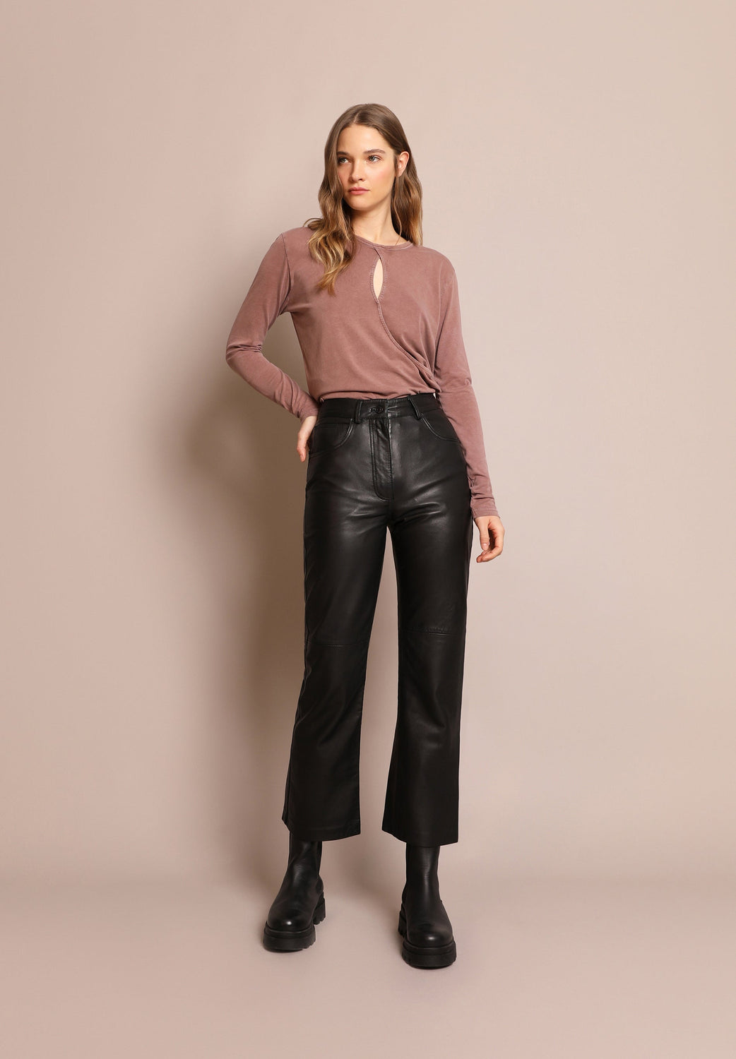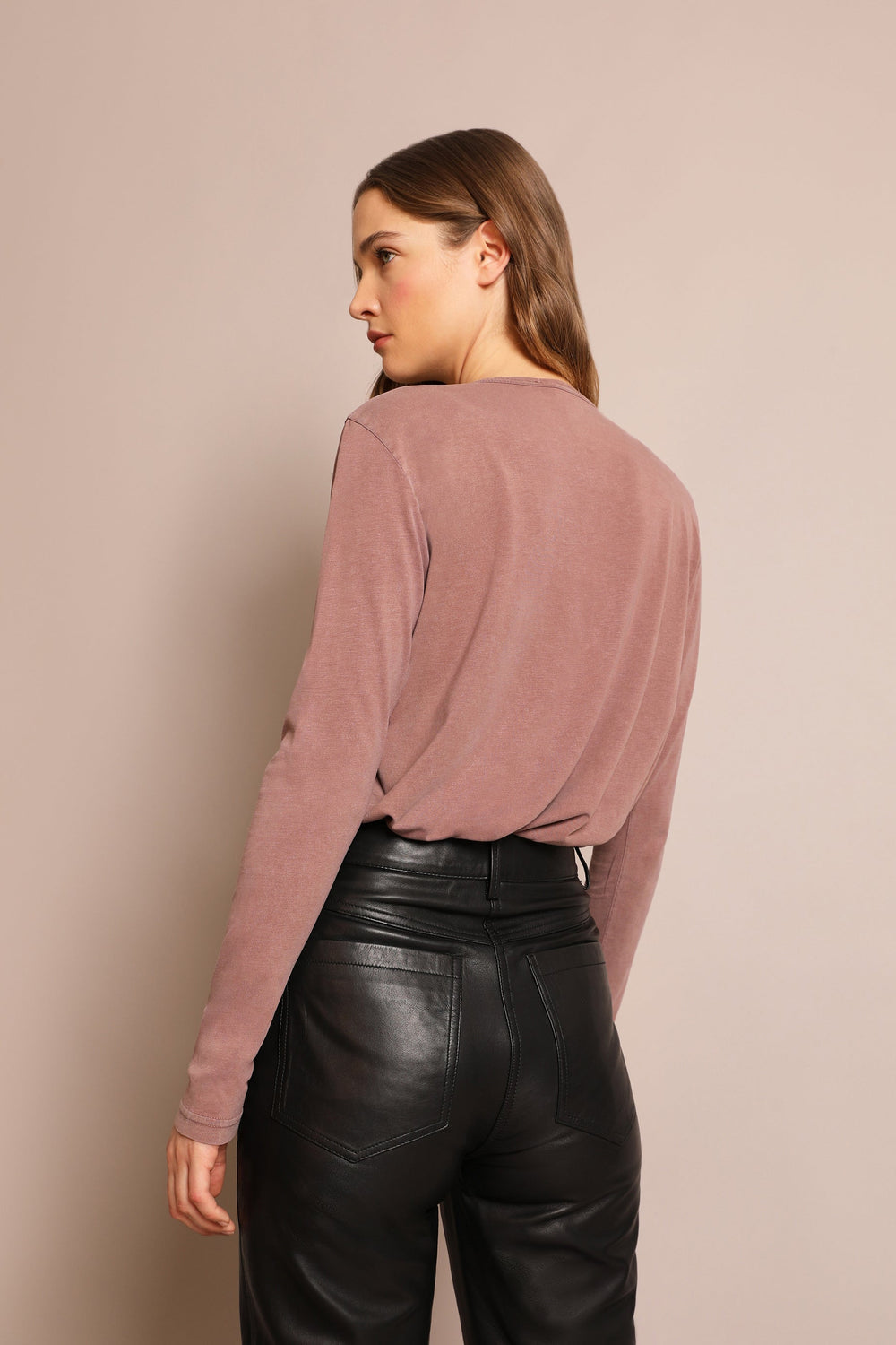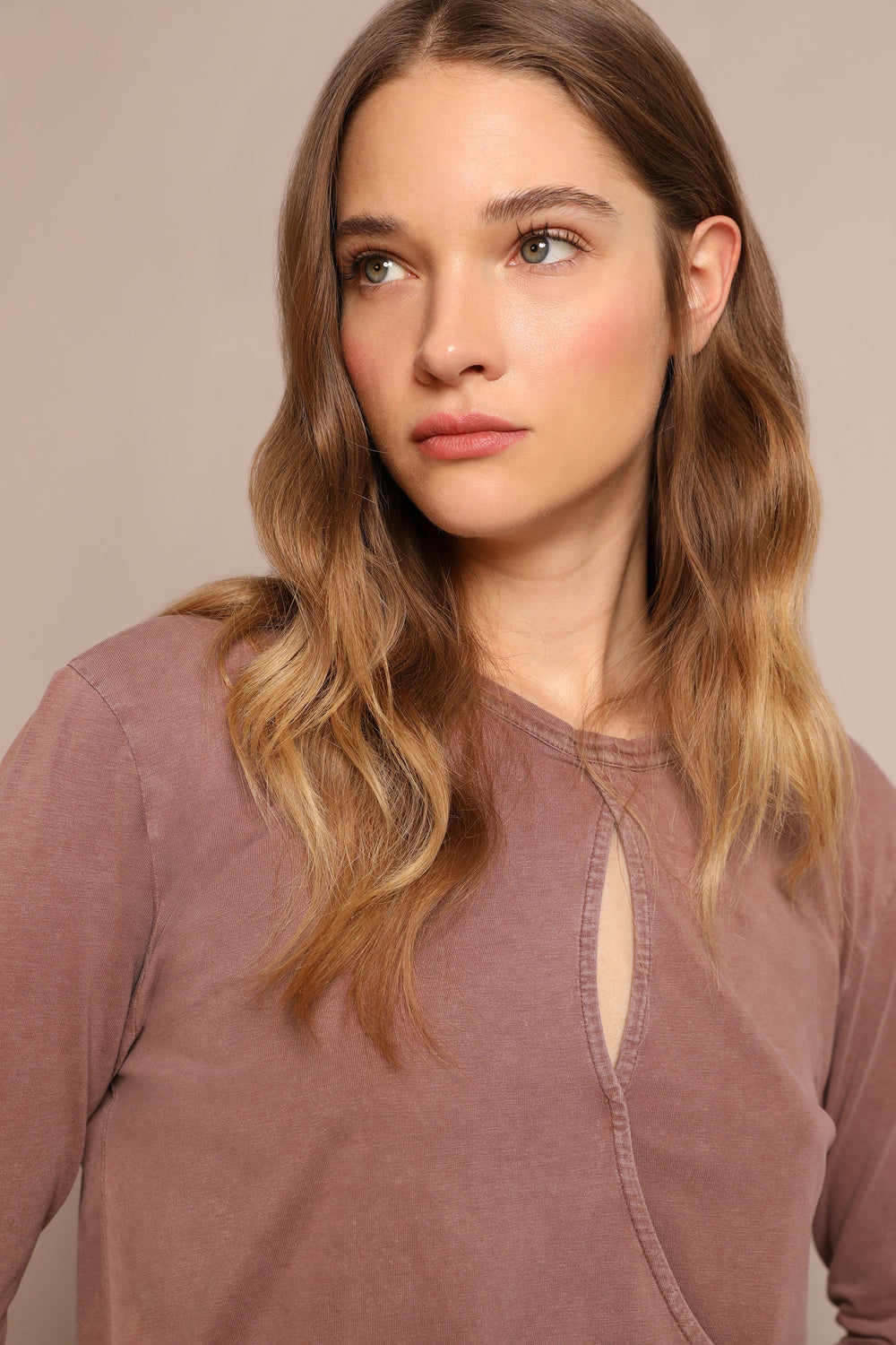 Faded T-shirt with a crossover detail on the front in an organic cotton blend. Regular fit, round neck and long sleeves. Cut-out at the neckline.