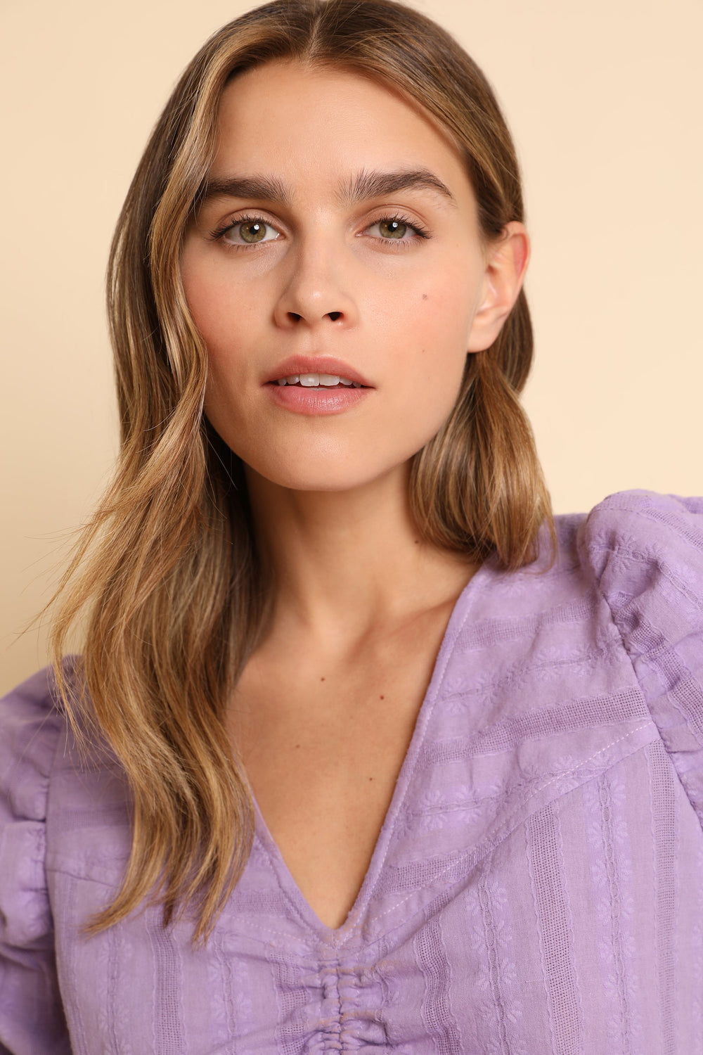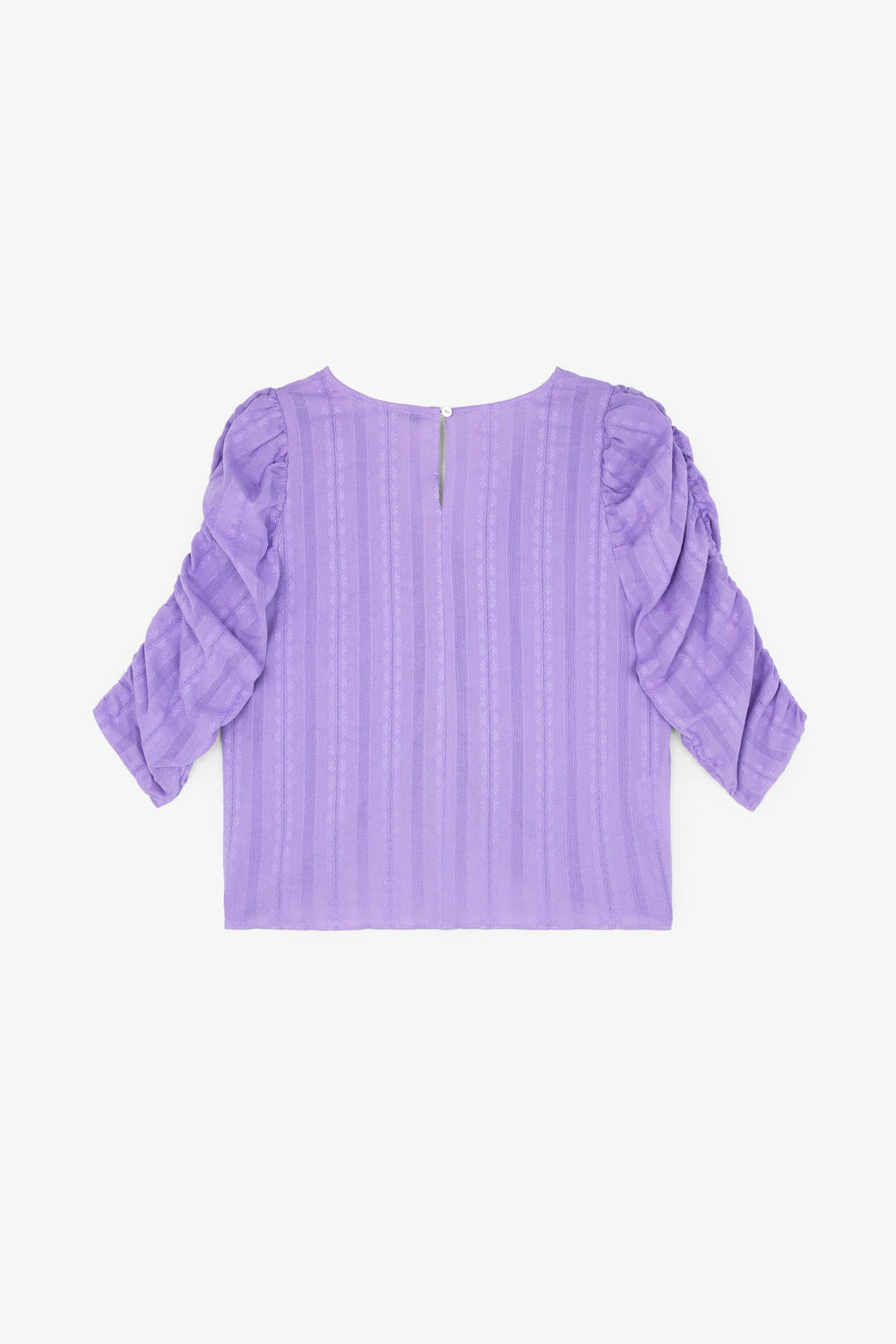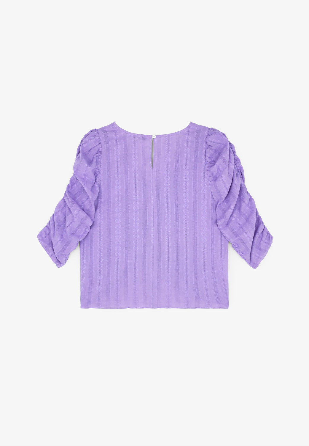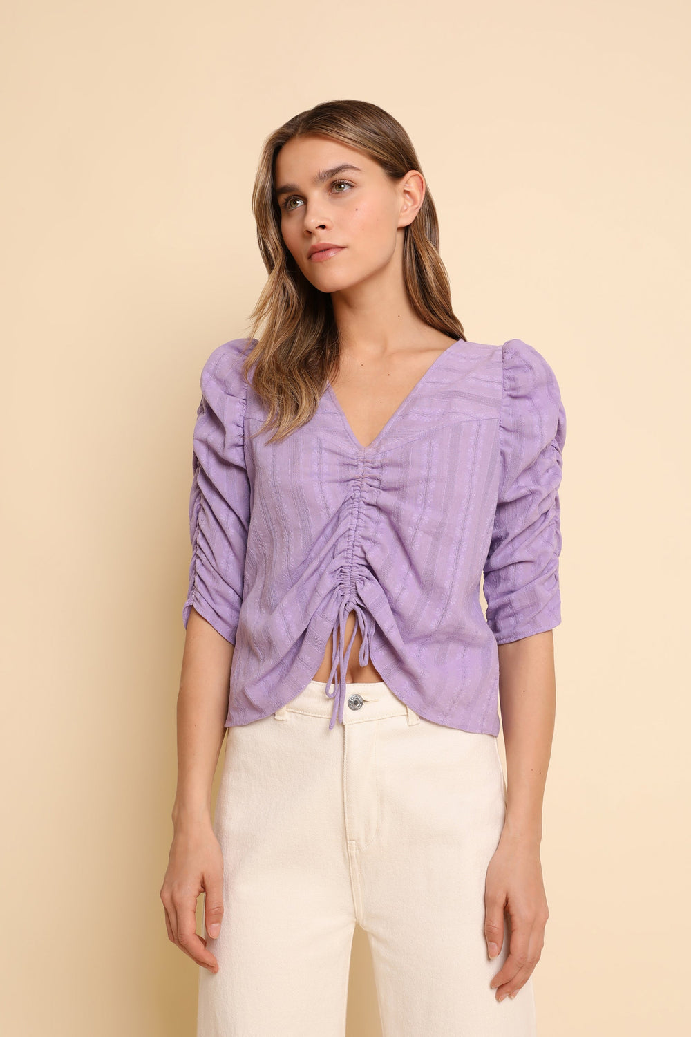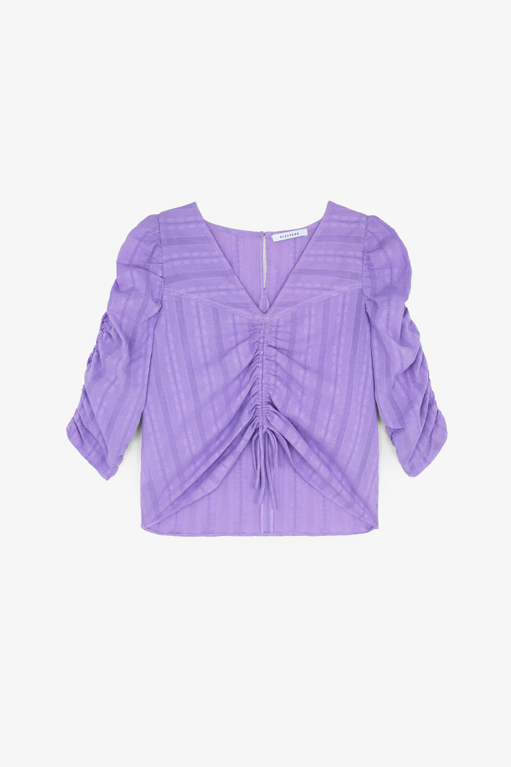 Striped blouse made of 100% cotton. Regular fit, V-neck and three quarter length puff sleeves. Adjustable front gathered detail.