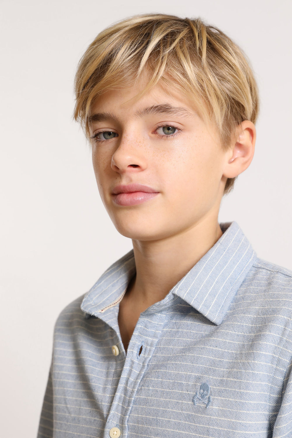 Striped denim shirt.