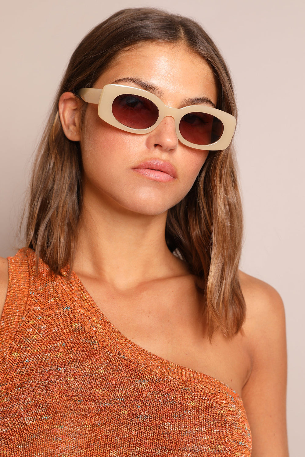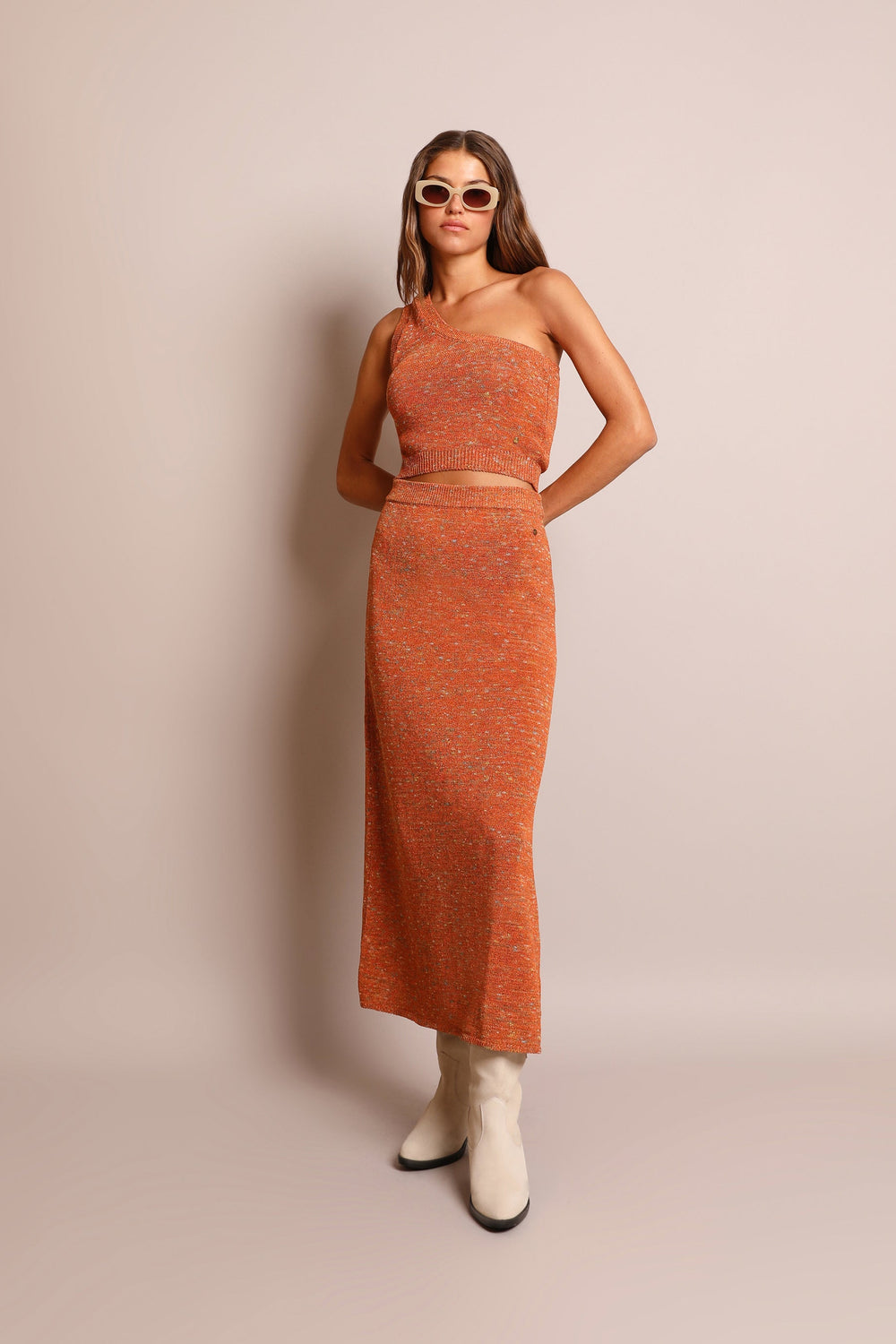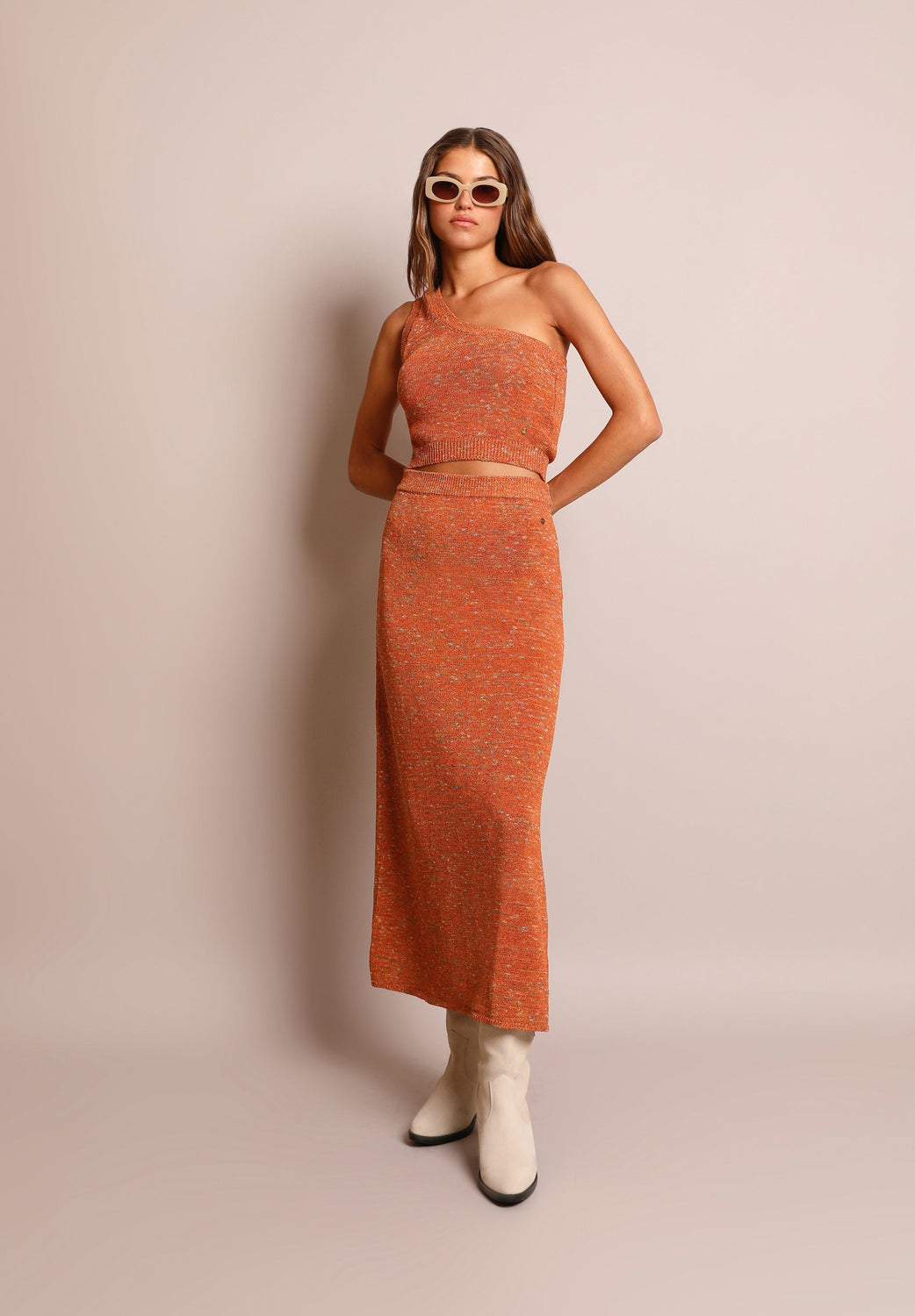 Knit top made from a slightly stretchy cotton blend fabric. Slim fit cropped cut and asymmetric neckline.