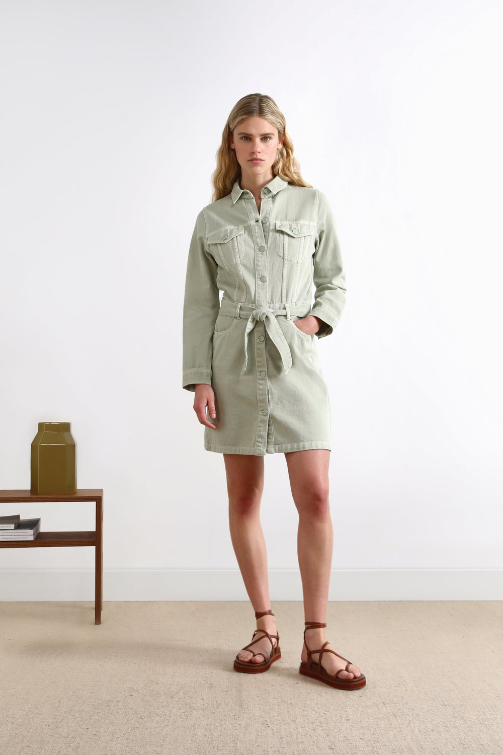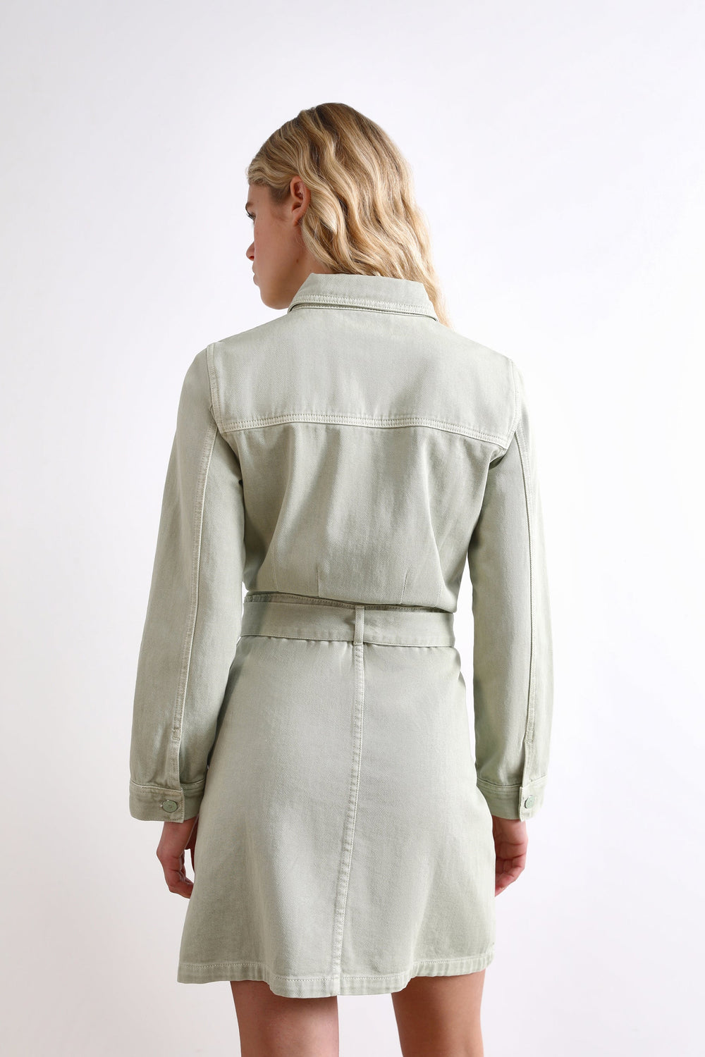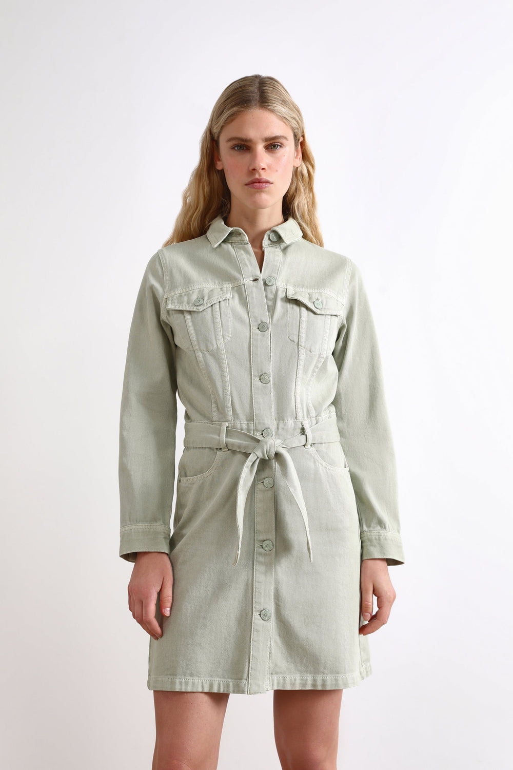 Denim dress with front bow.