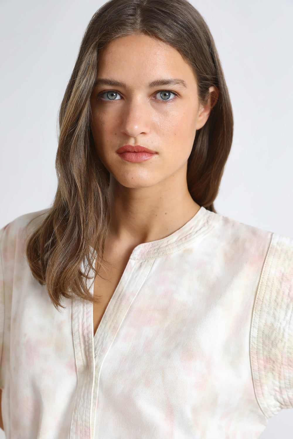 - Round neck top with V opening at the neckline