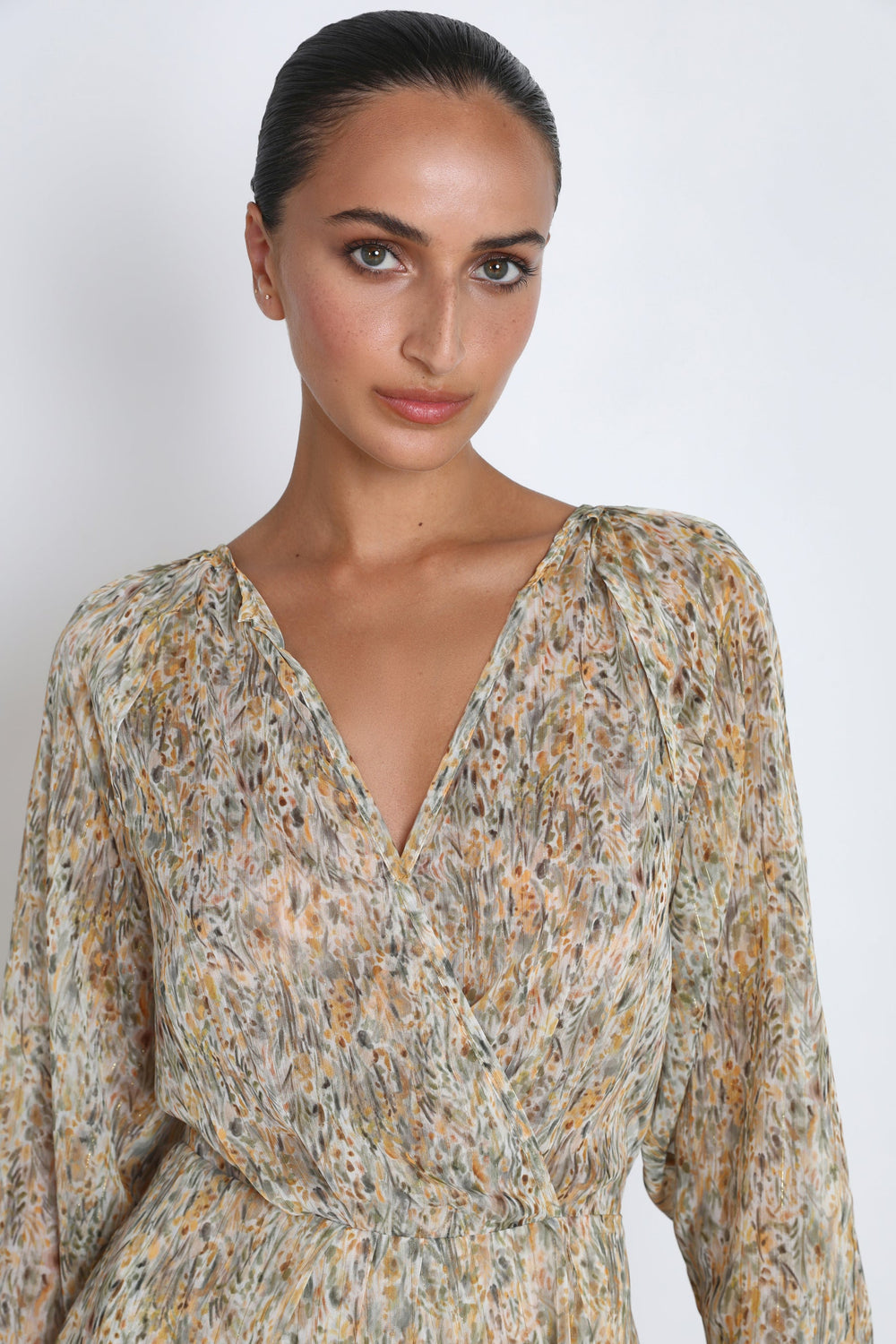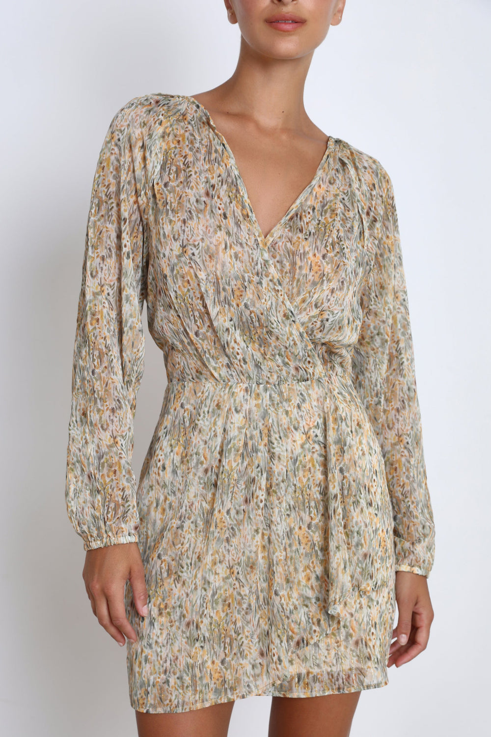 - Ruched detail on the skirt