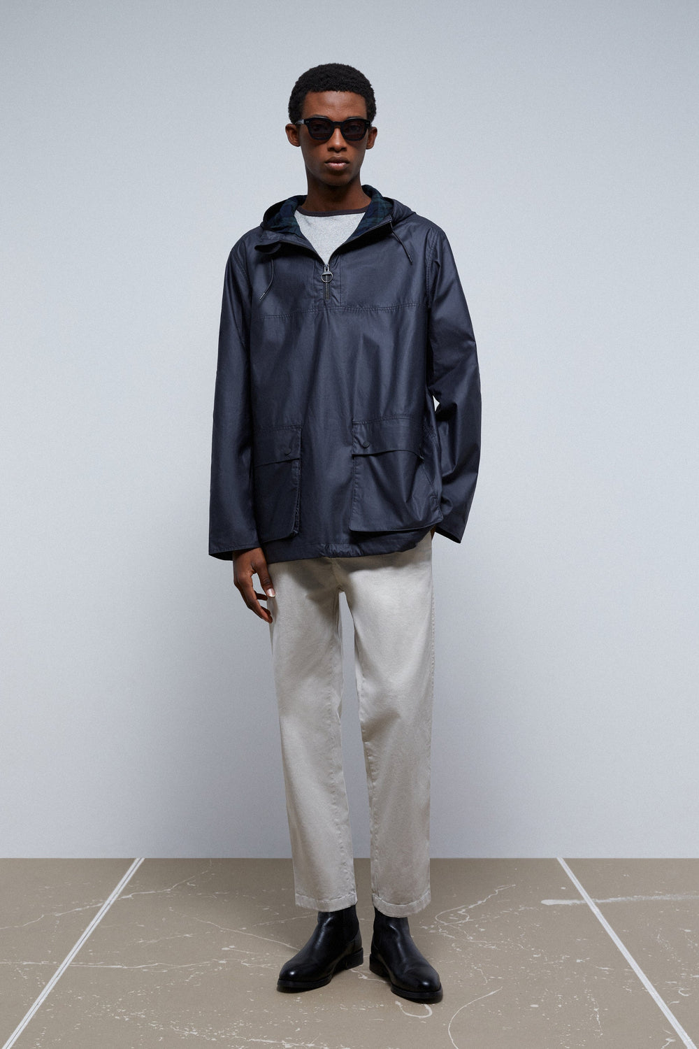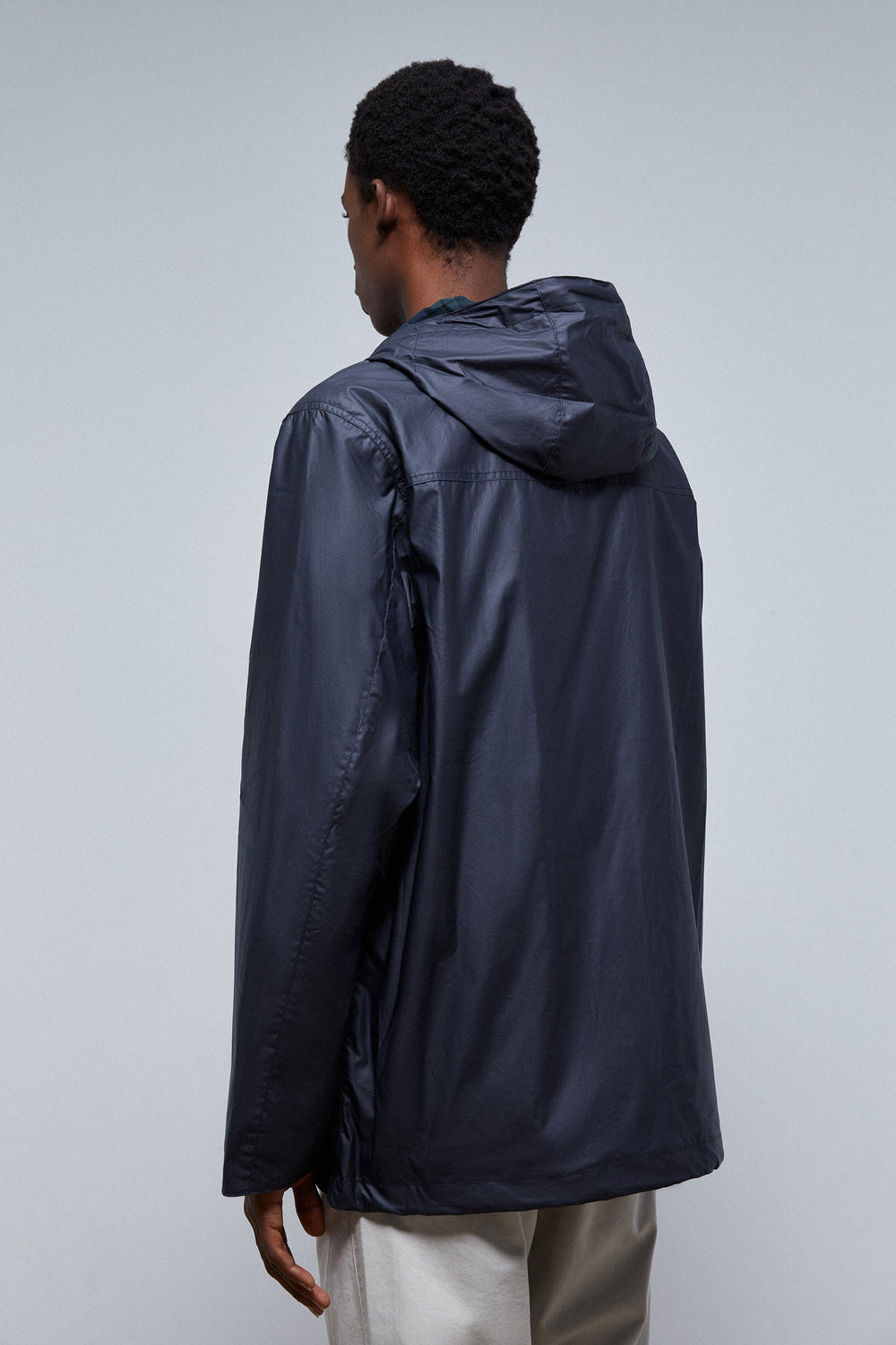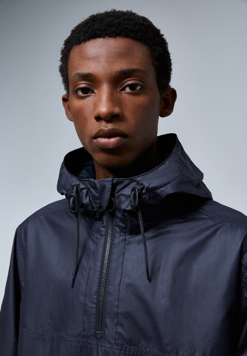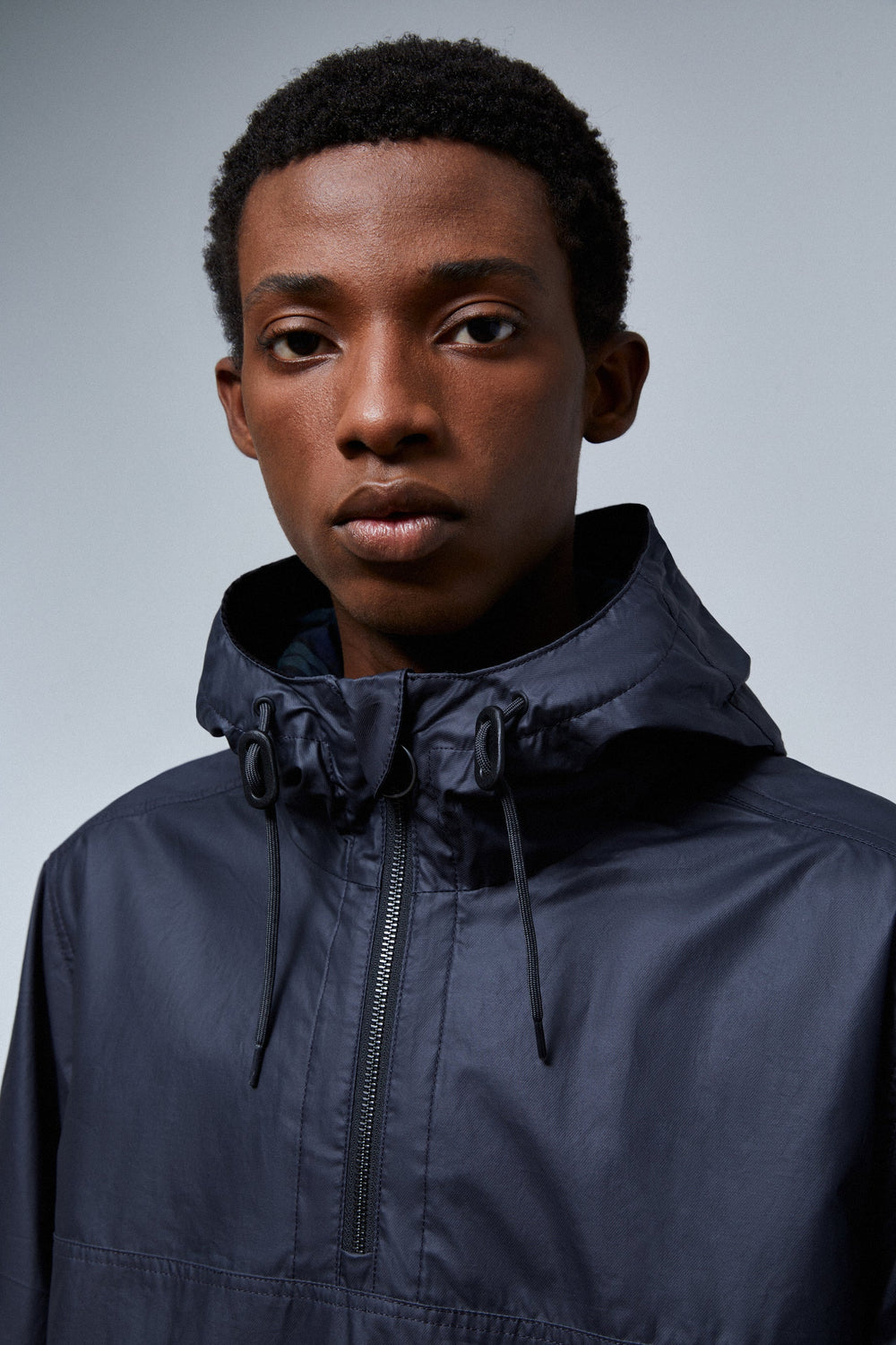 - Collar with zip and an adjustable drawstring hood