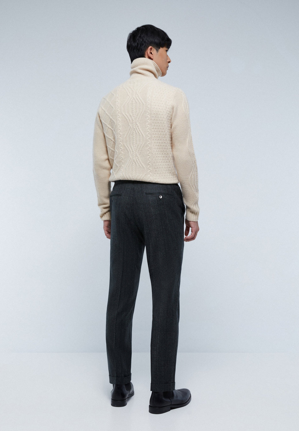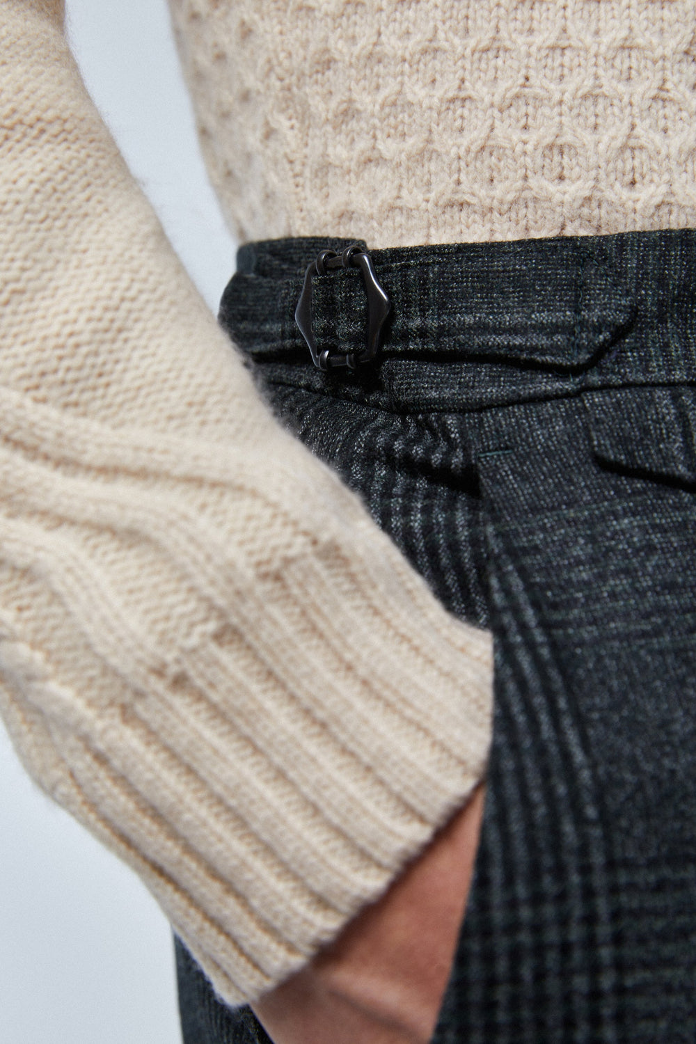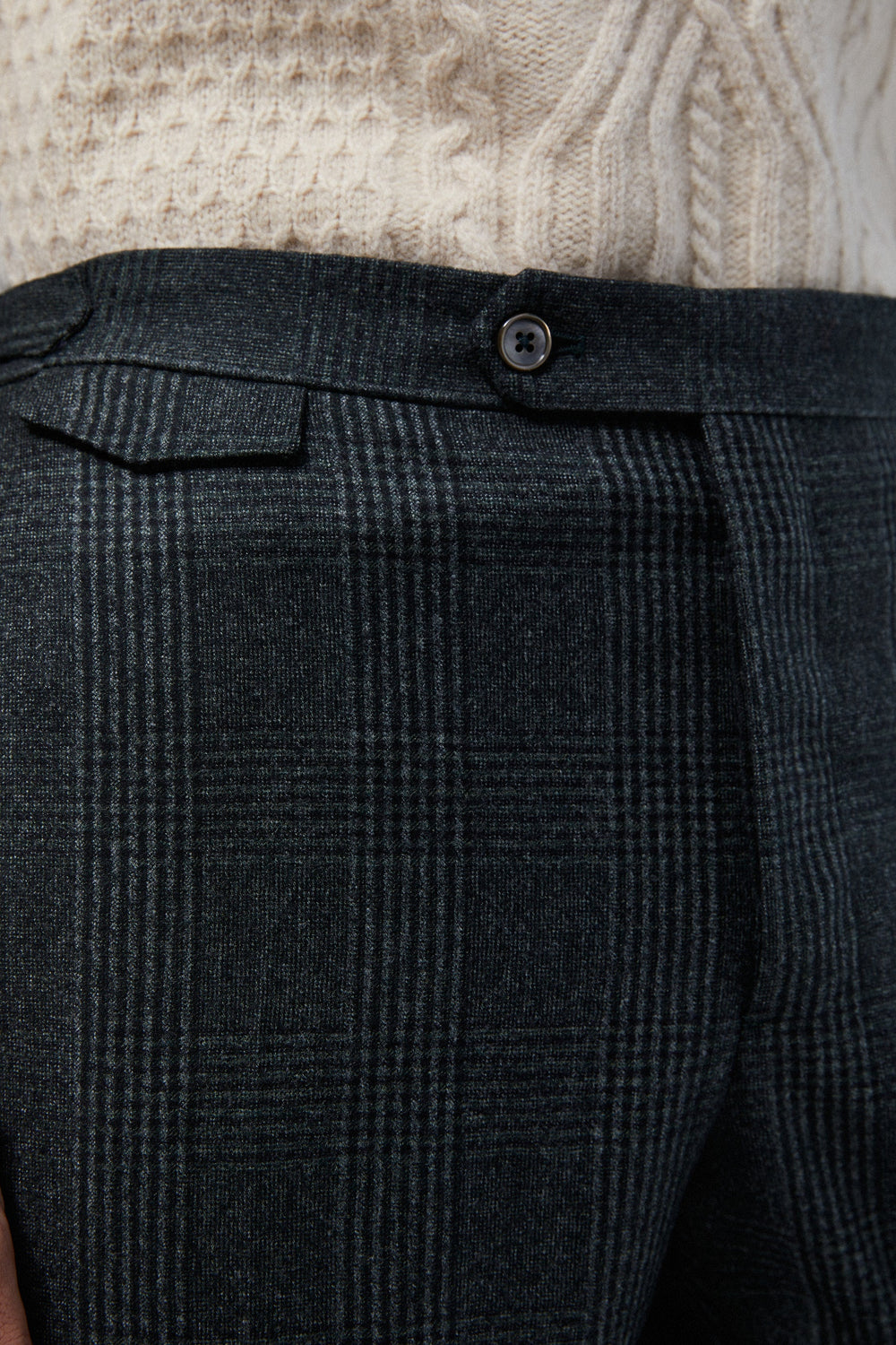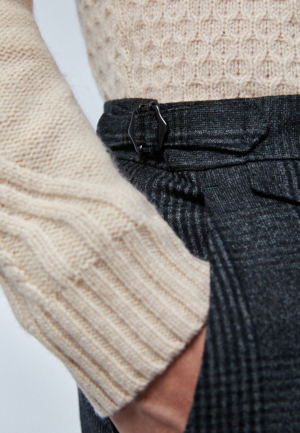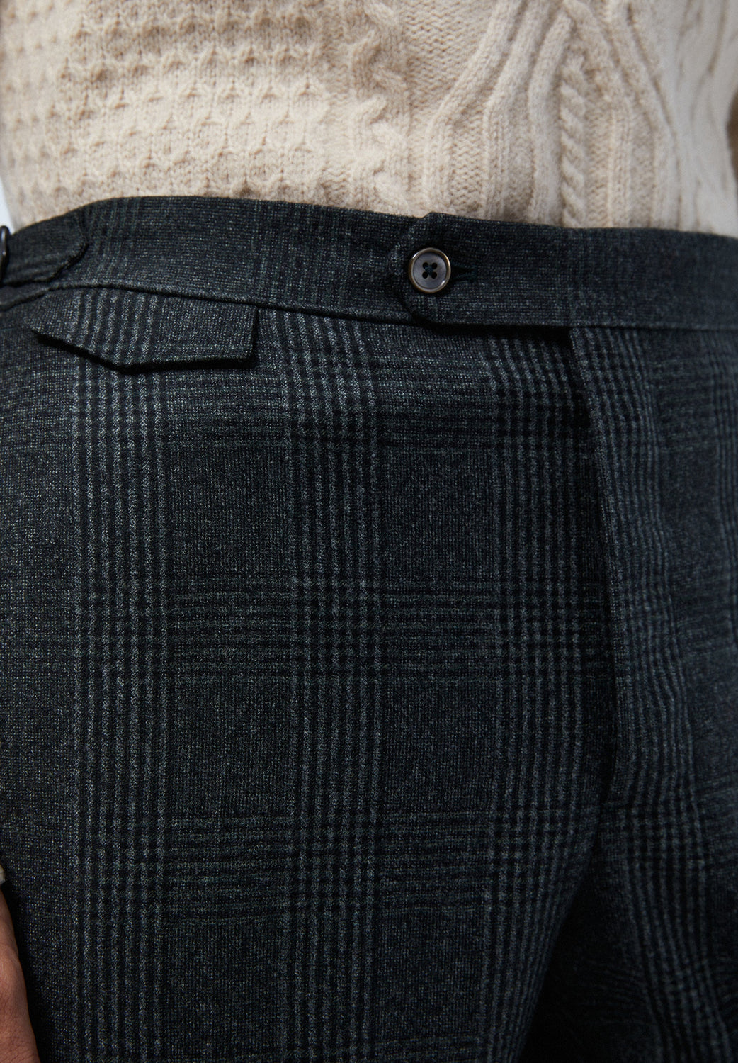 - Straight trousers with an extended button-up fastening at the waist and buttons. Side belt and button for braces. Turn-up hem.