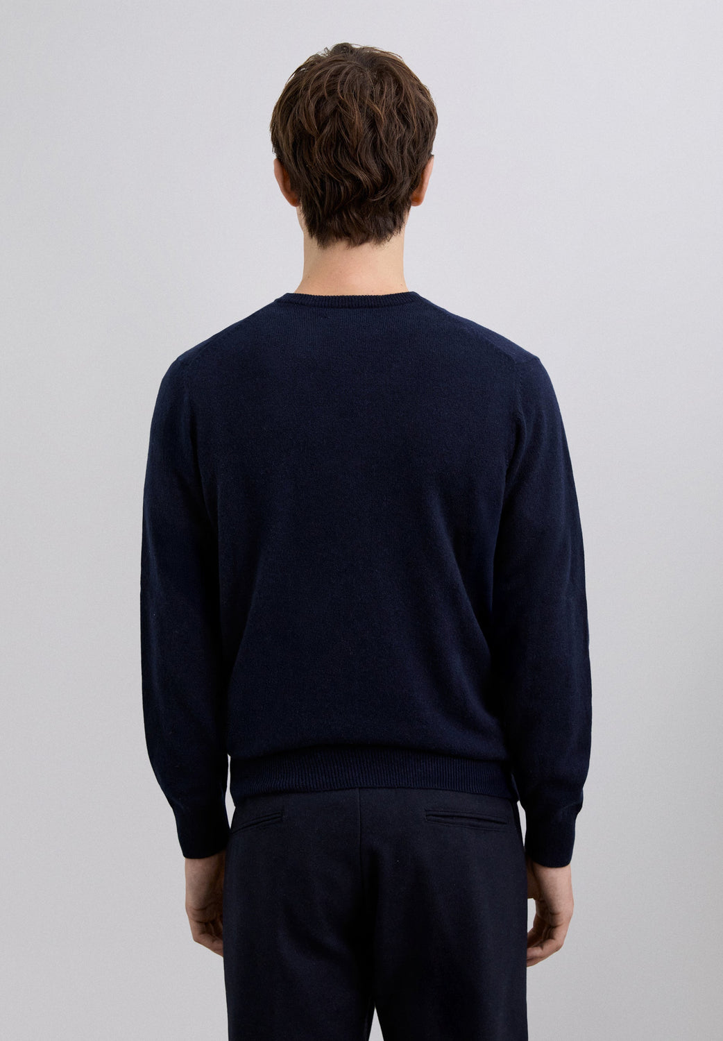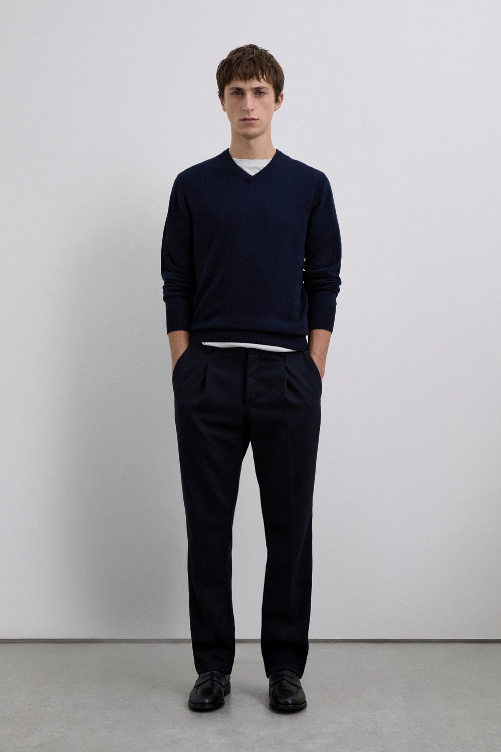 Jersey confeccionado en cachemira 100%. Corte Regular Fit. Cuello de pico. Manga larga.