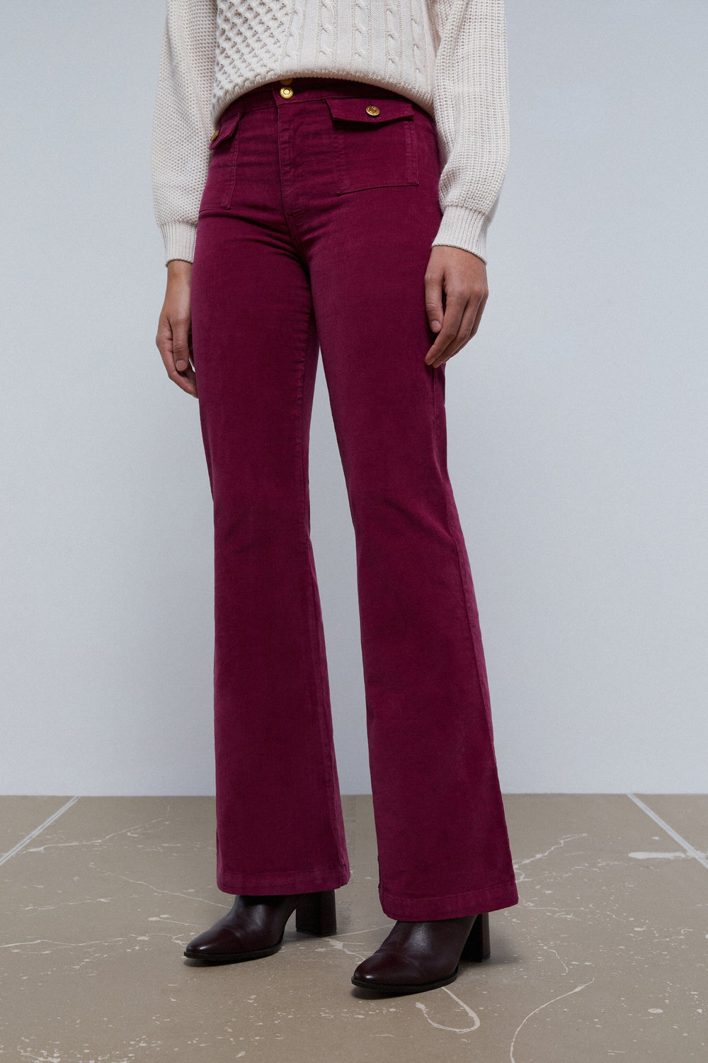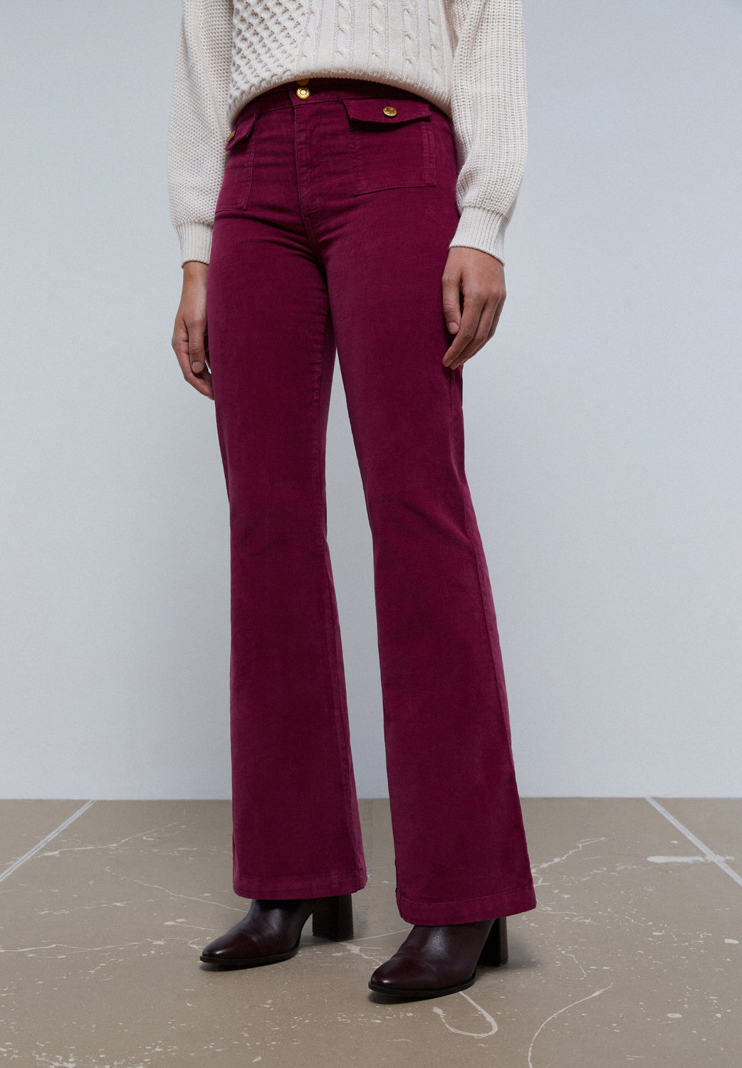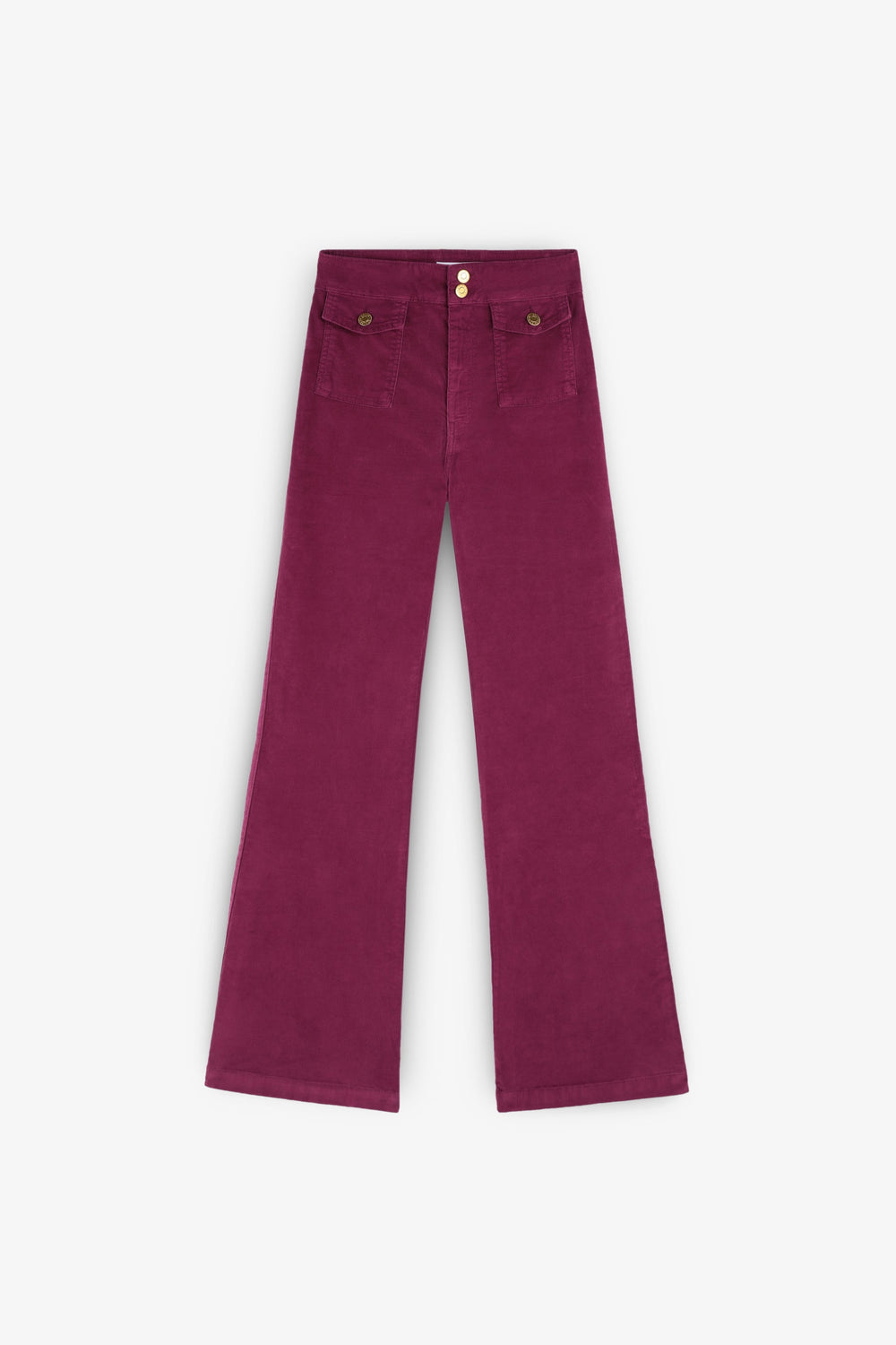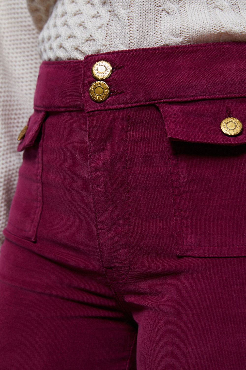 Corduroy trousers with golden button detail.