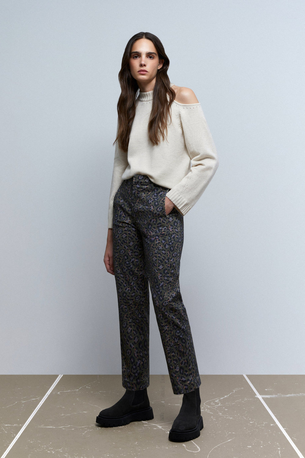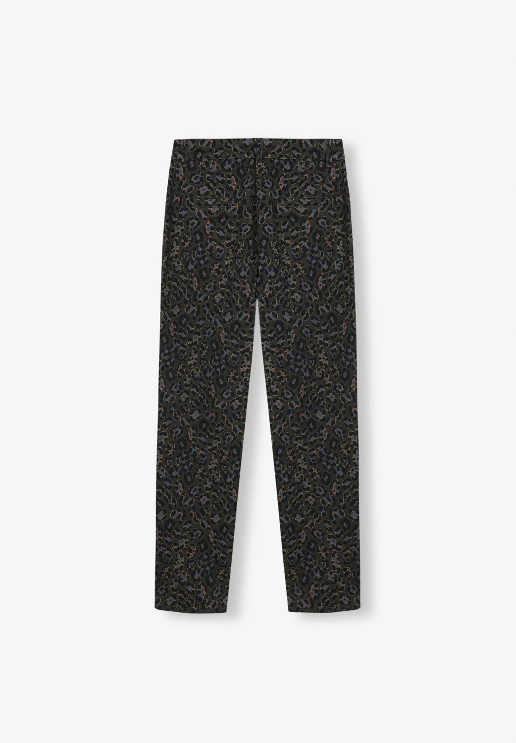 Animal print chino trousers.