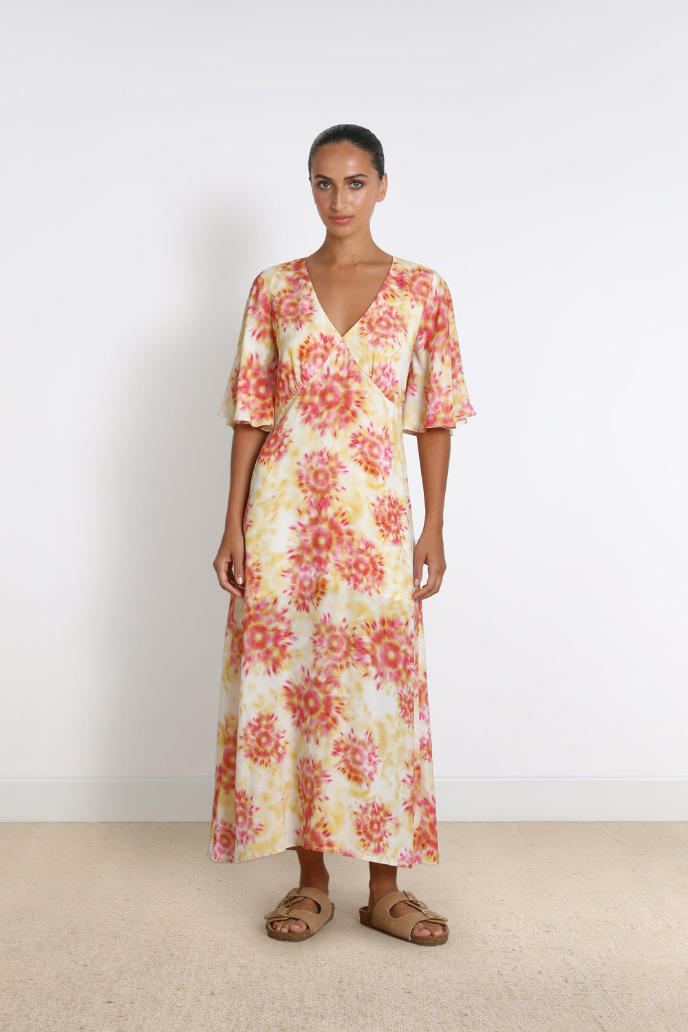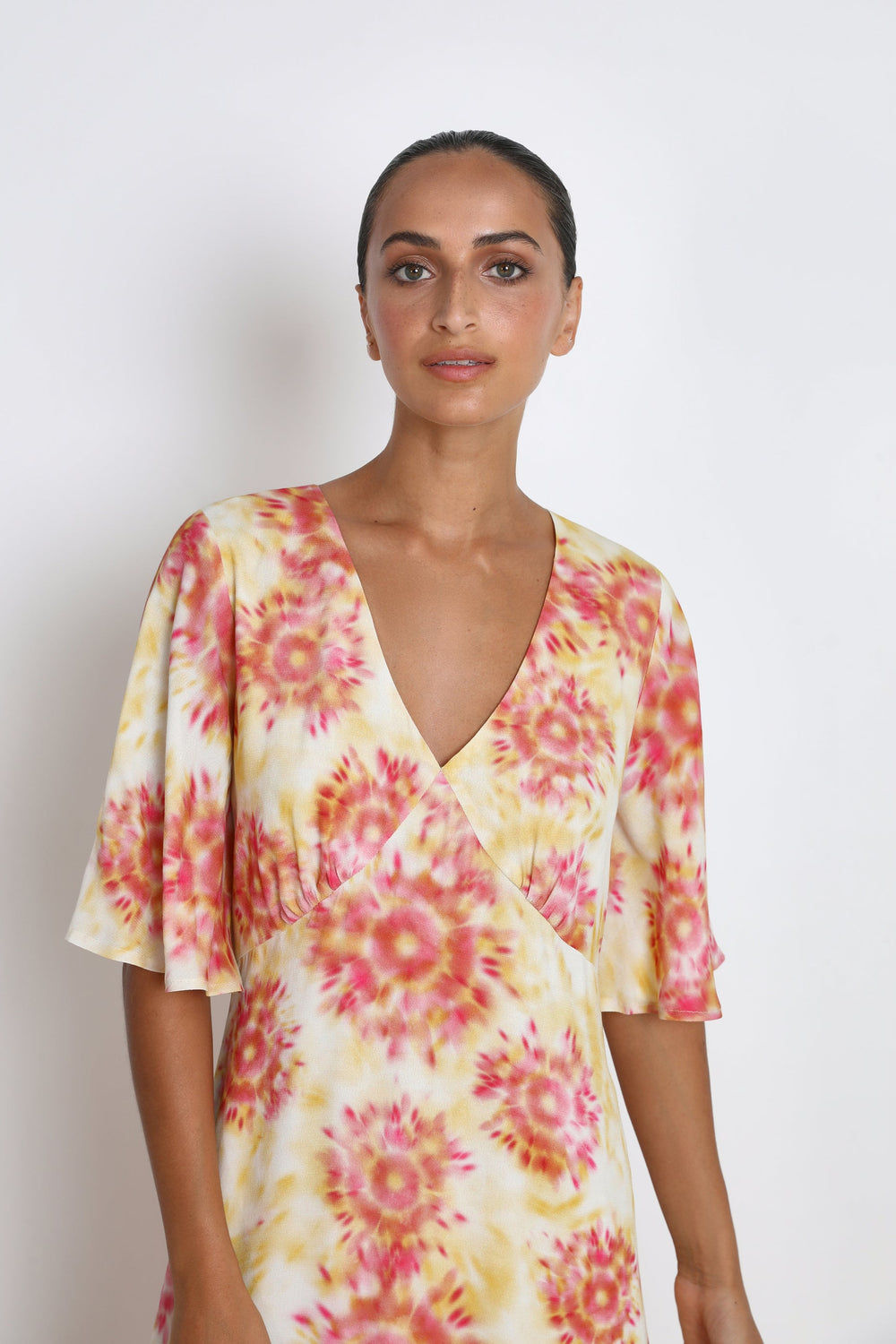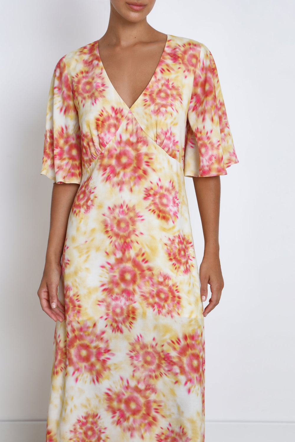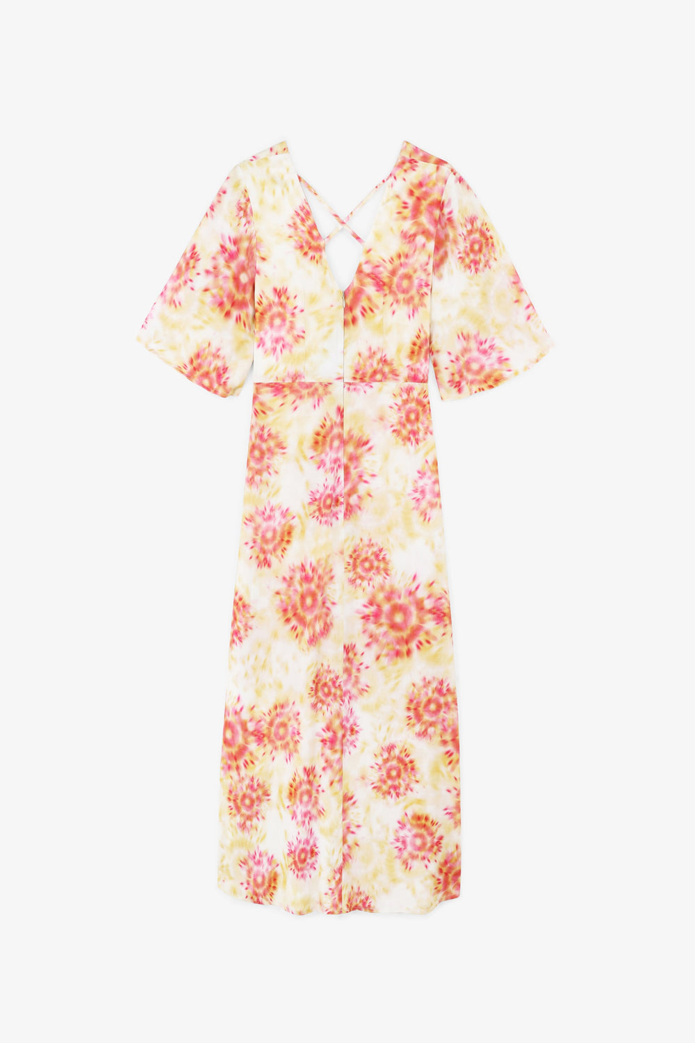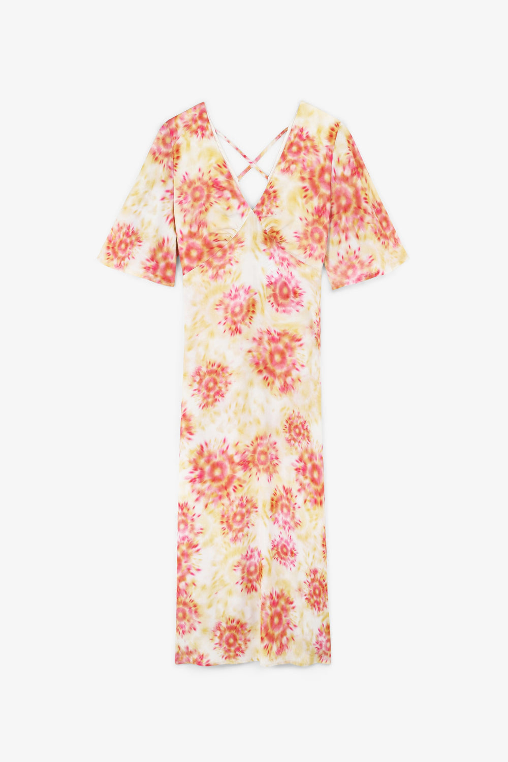 Midi dress with a lightly tie-dyed print.