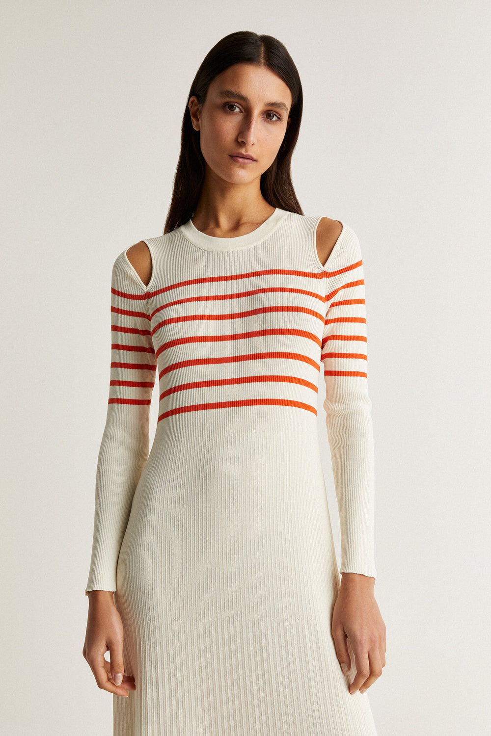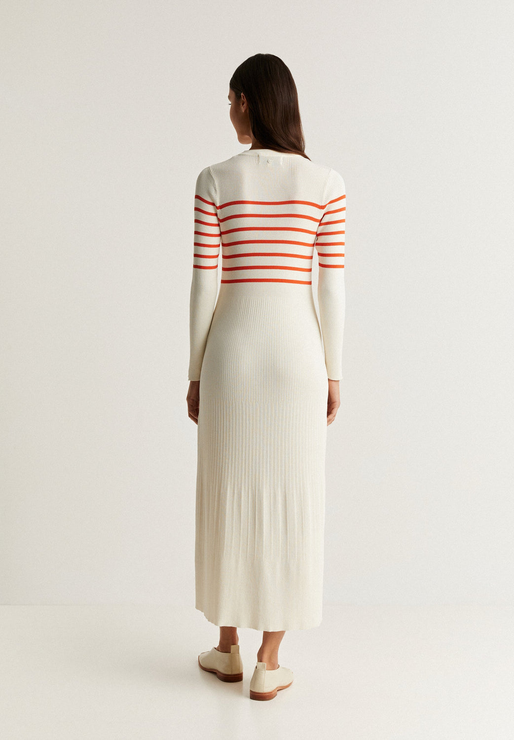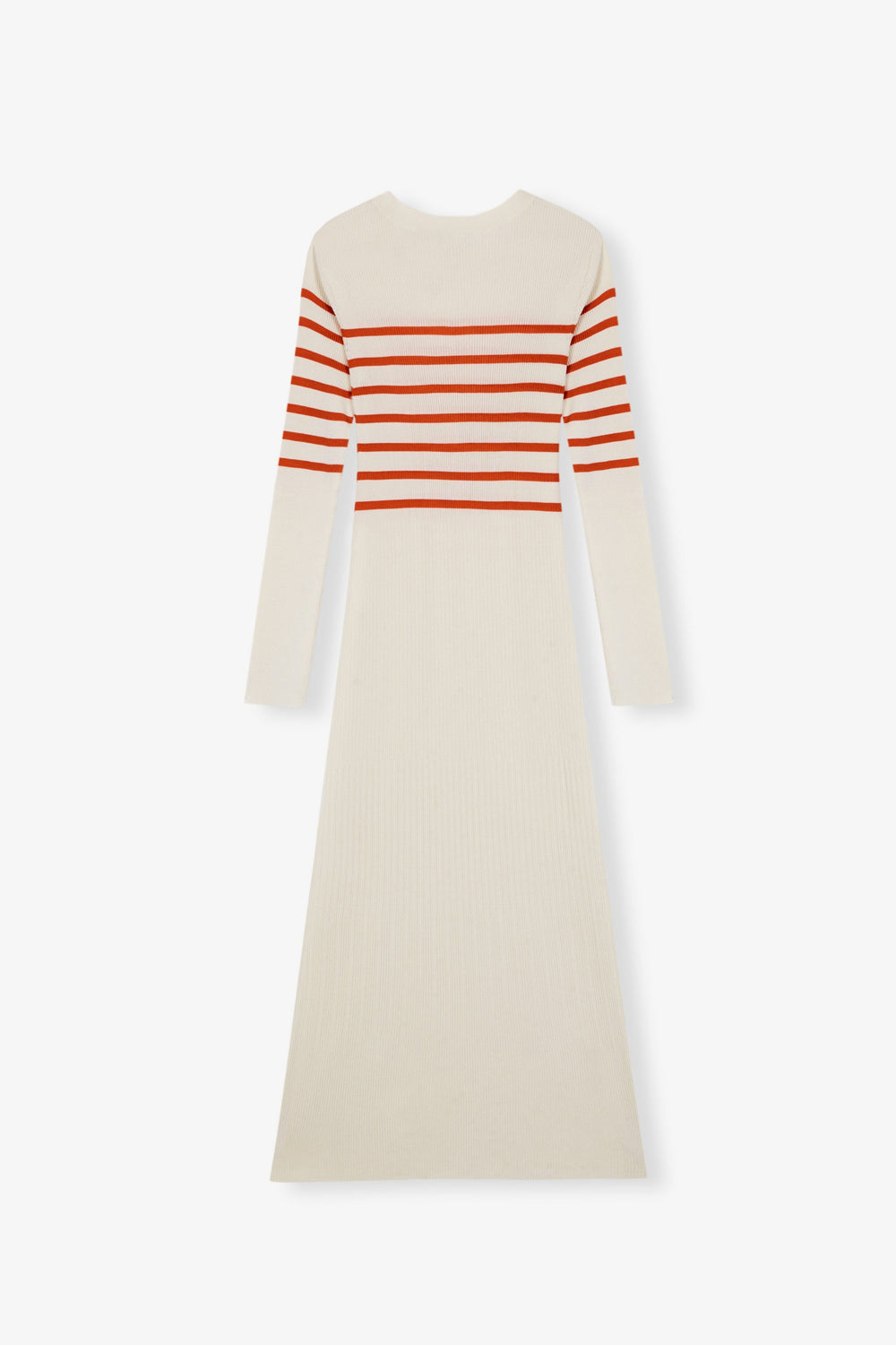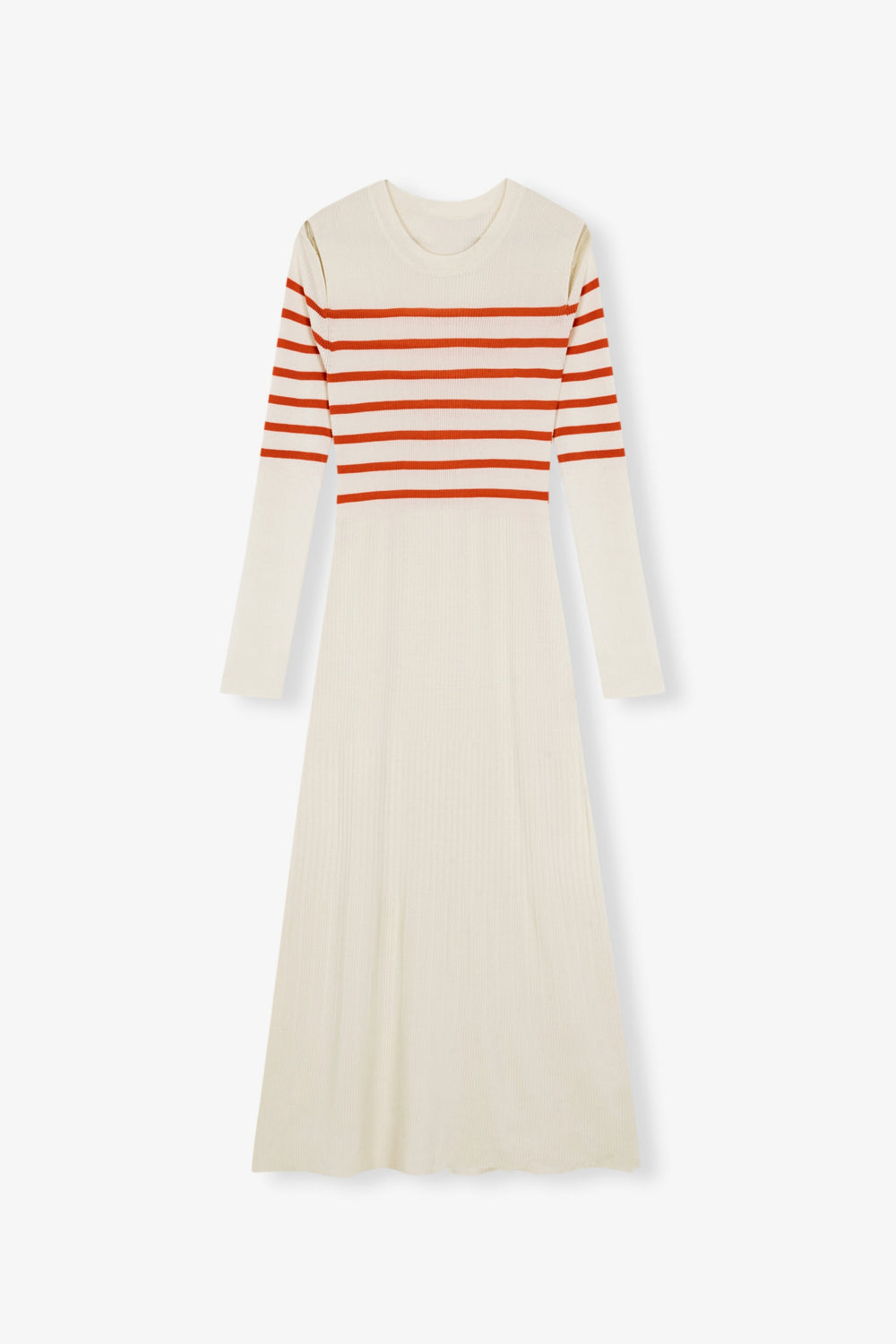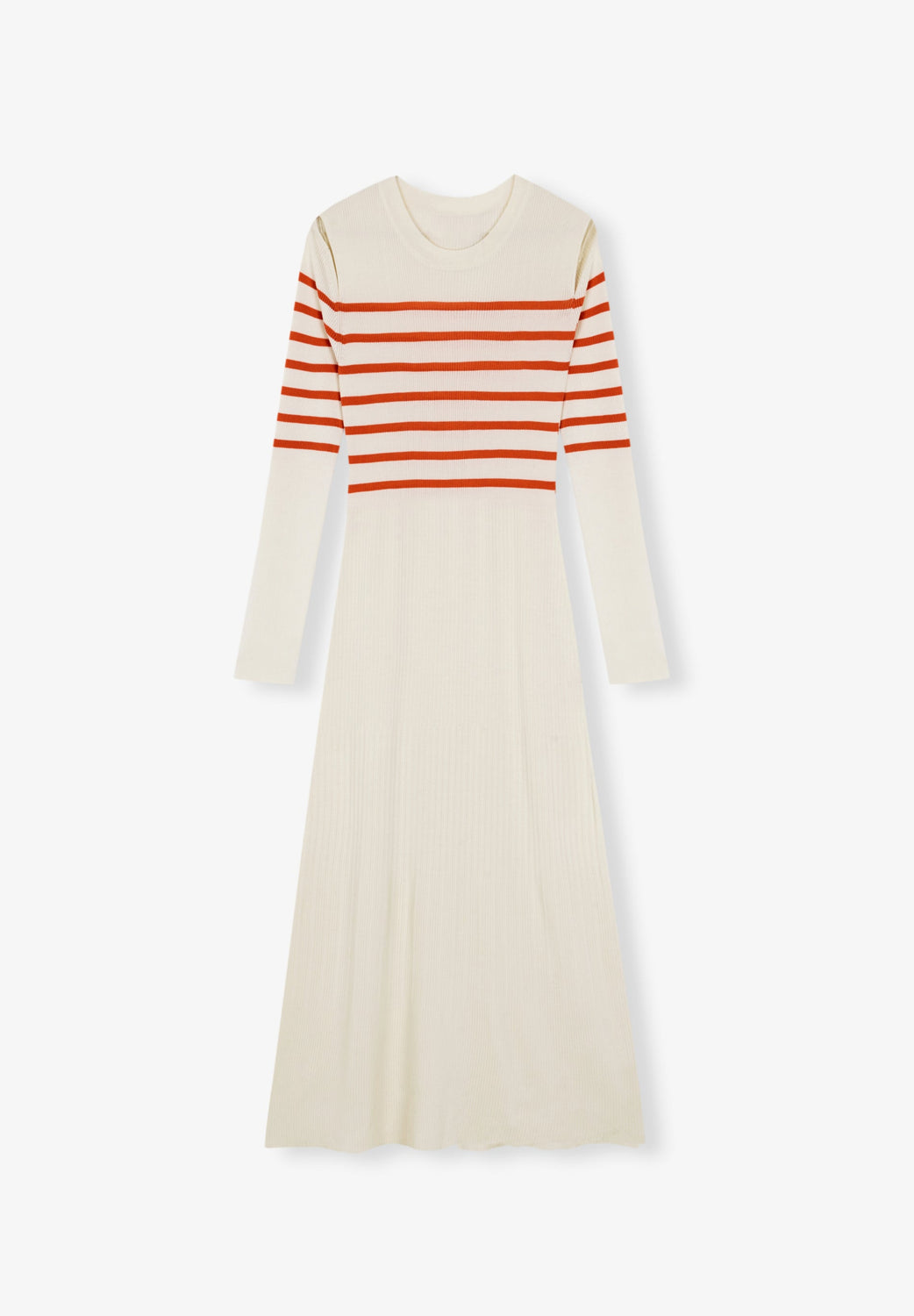 Ribbed knit dress with contrast stripes on the chest.