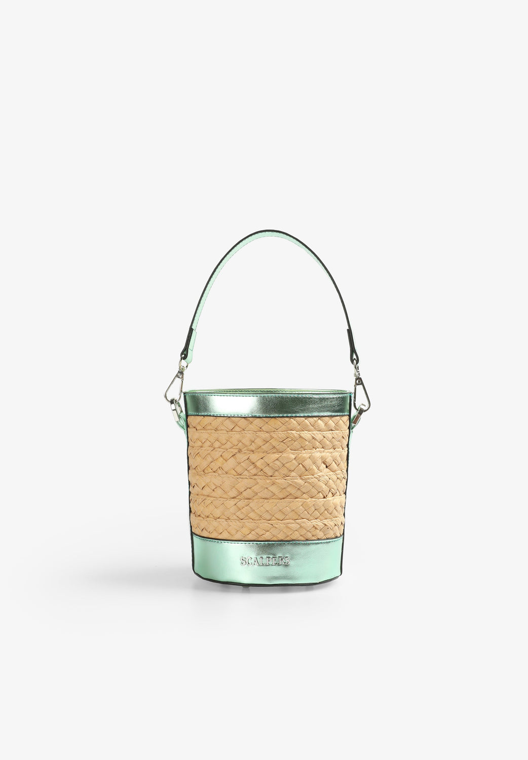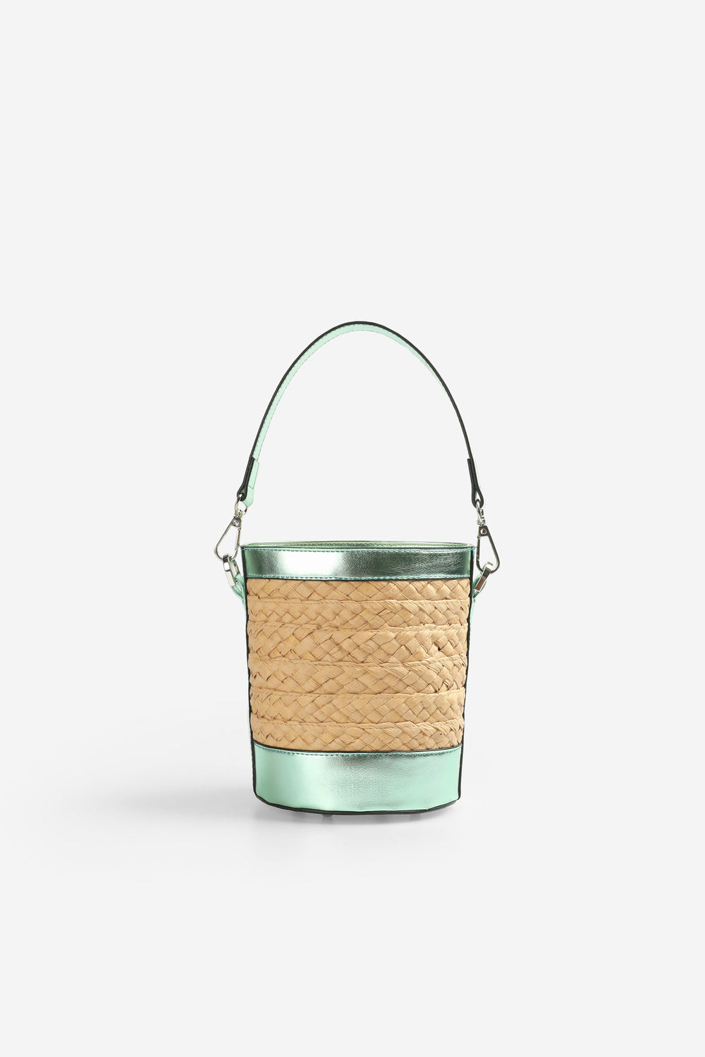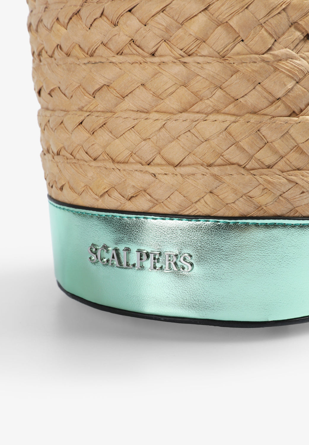 Raffia bucket bag with metallic details.