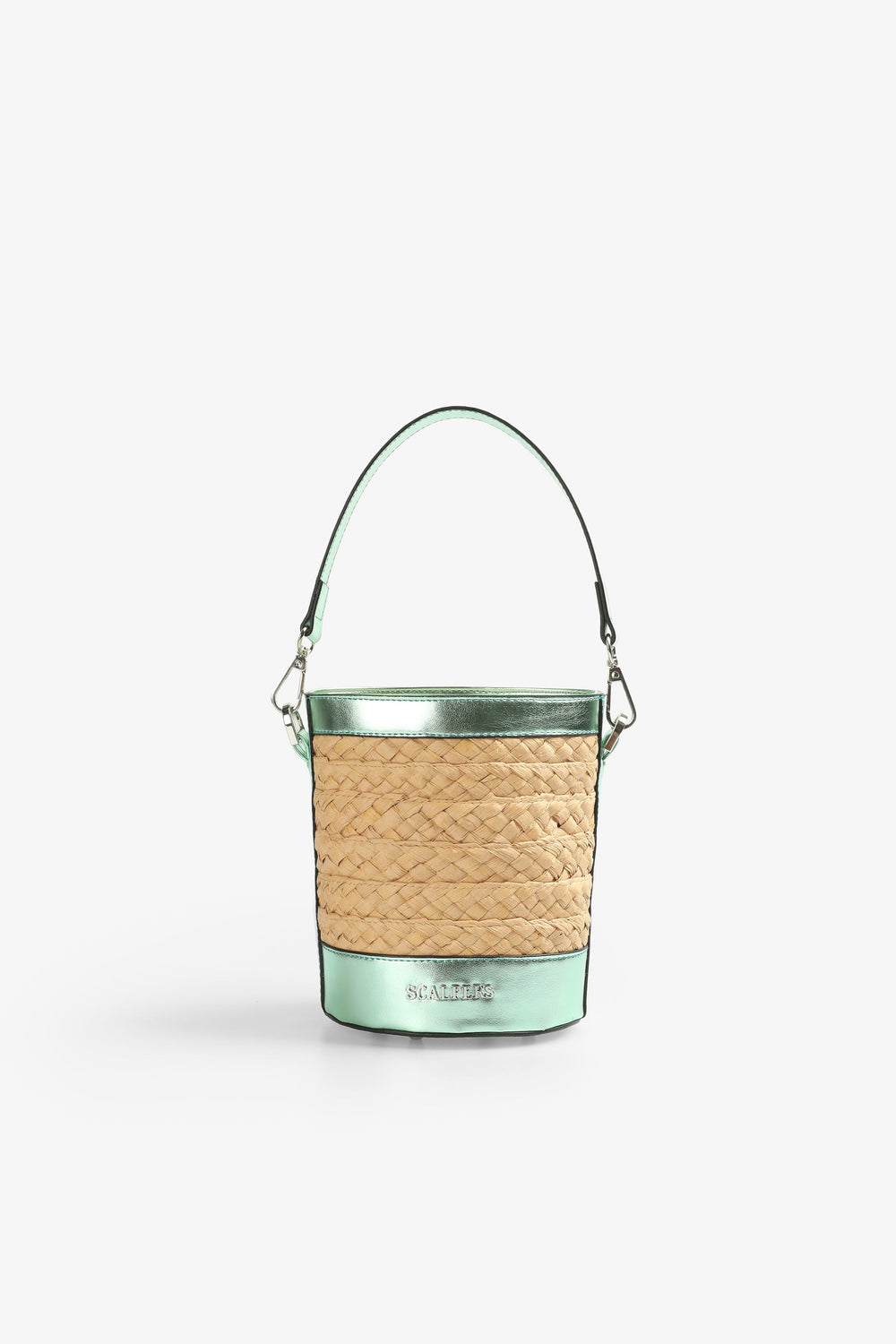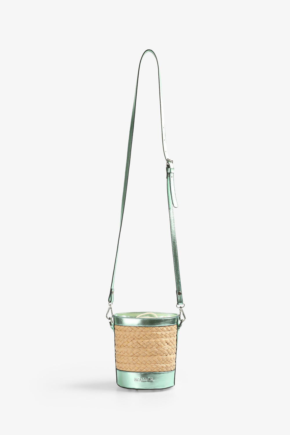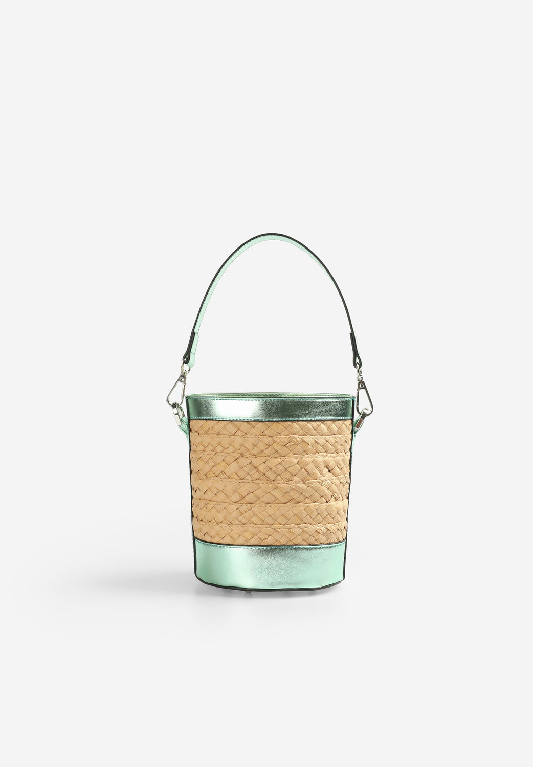 Raffia bucket bag with metallic details.
