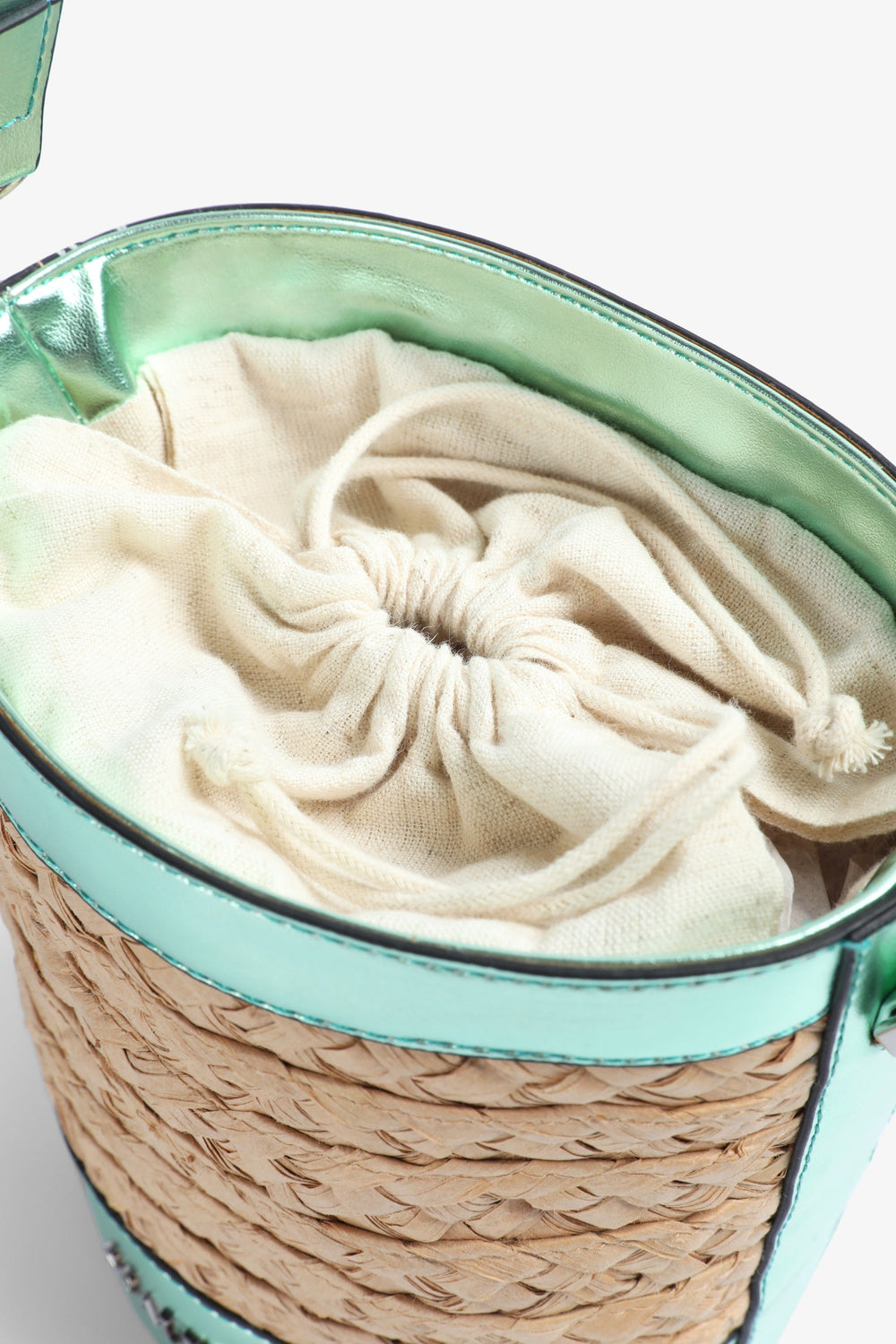 RAFFIA BUCKET BAG WITH METALLIC DETAIL