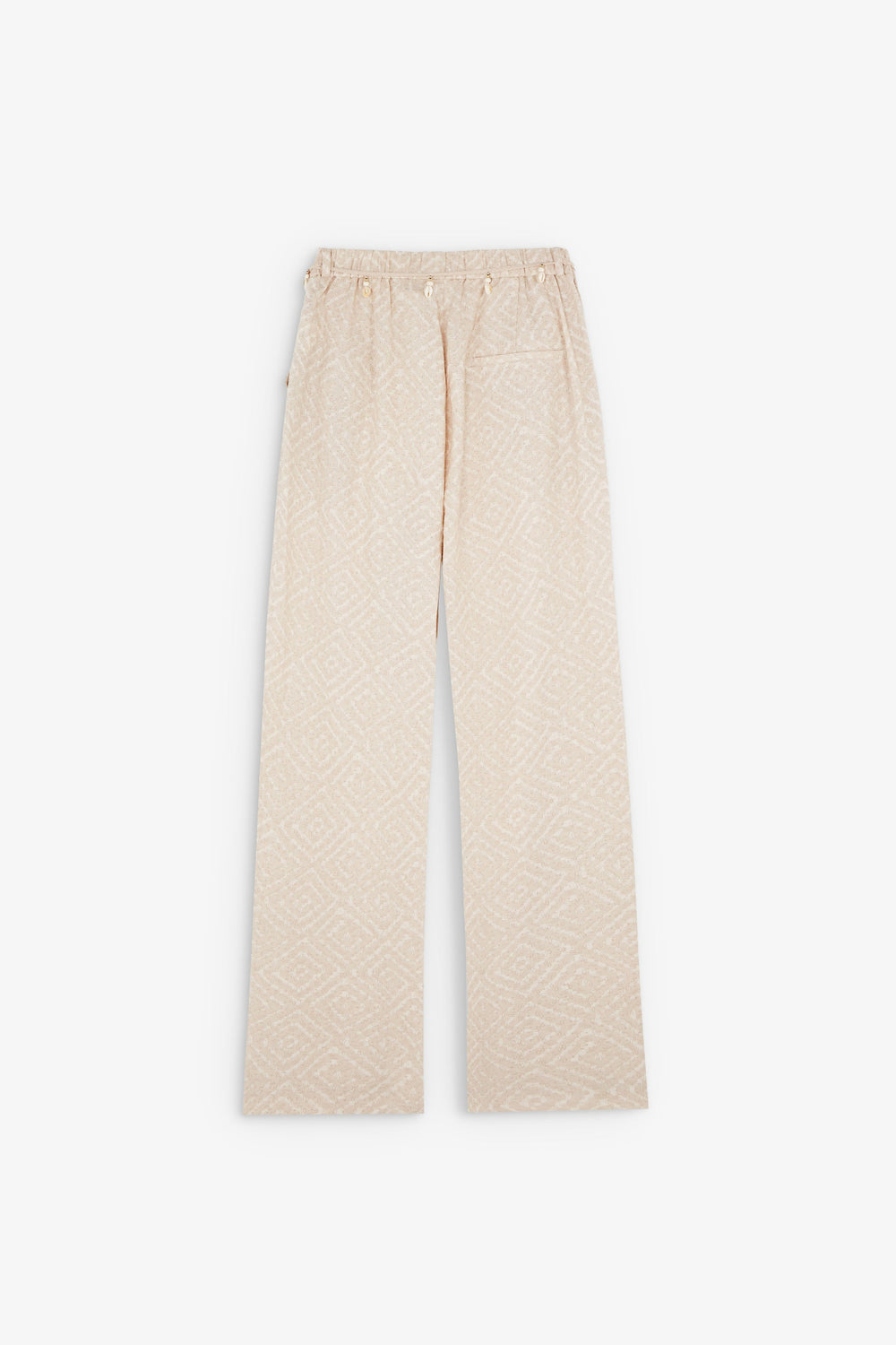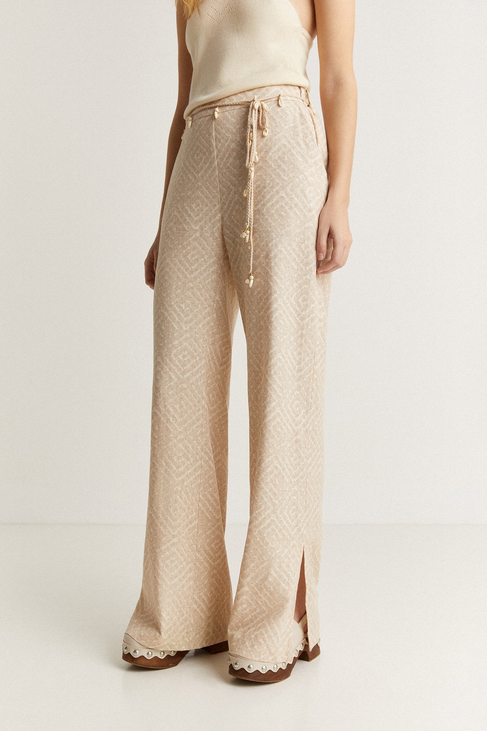 Printed trousers and belt with beads.