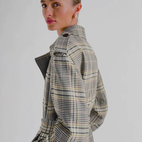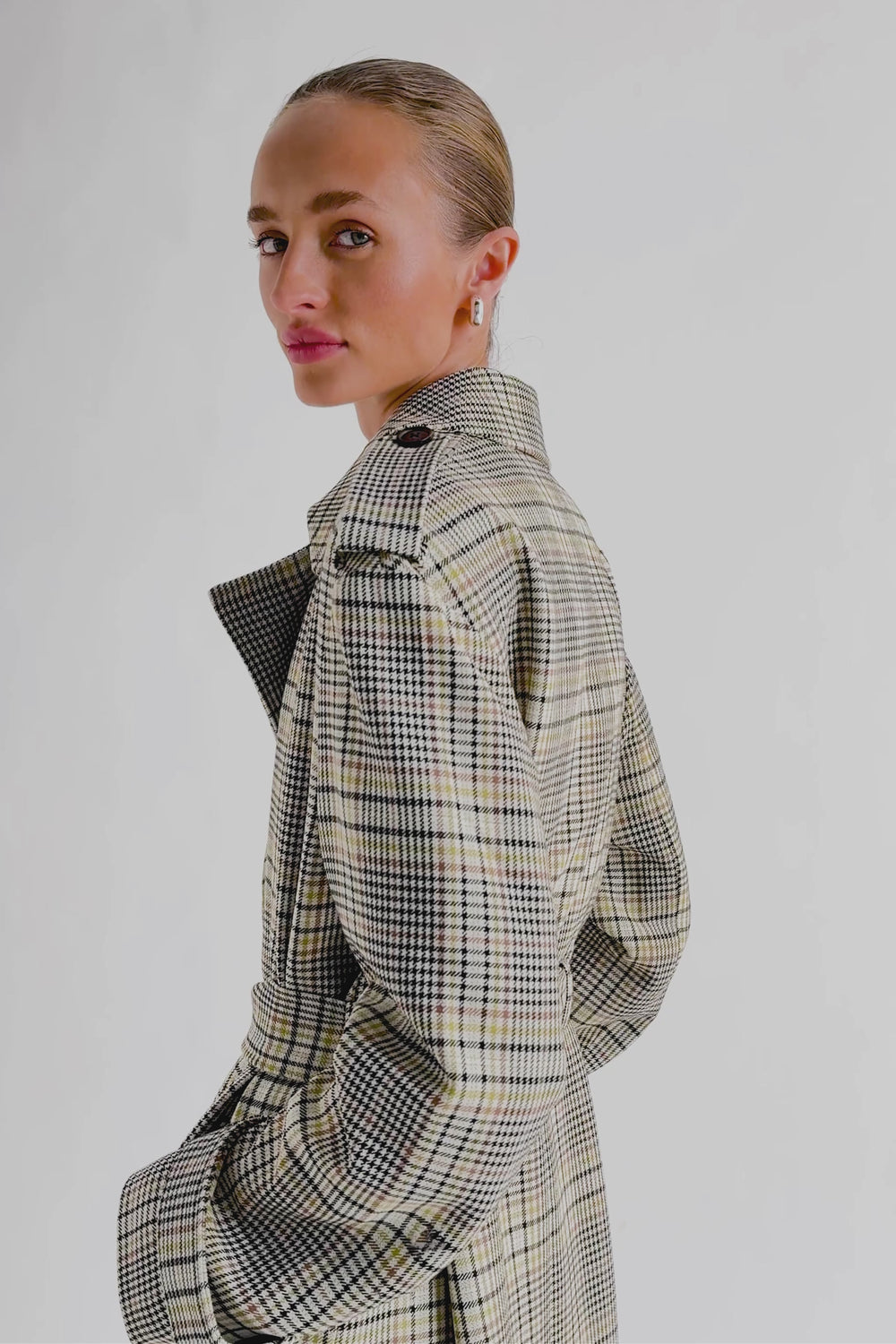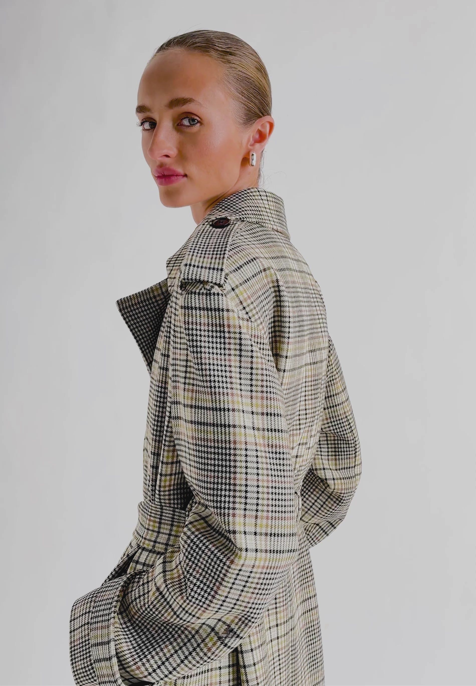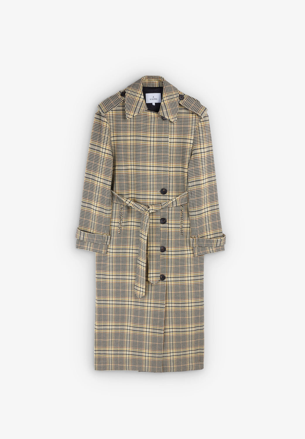 Check trench coat. Regular fit. V-neck and lapel collar. Button fastening and tied belt. Long raglan sleeves. Front pockets. Belt loops at the waist.