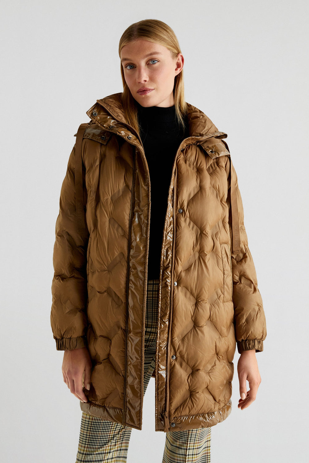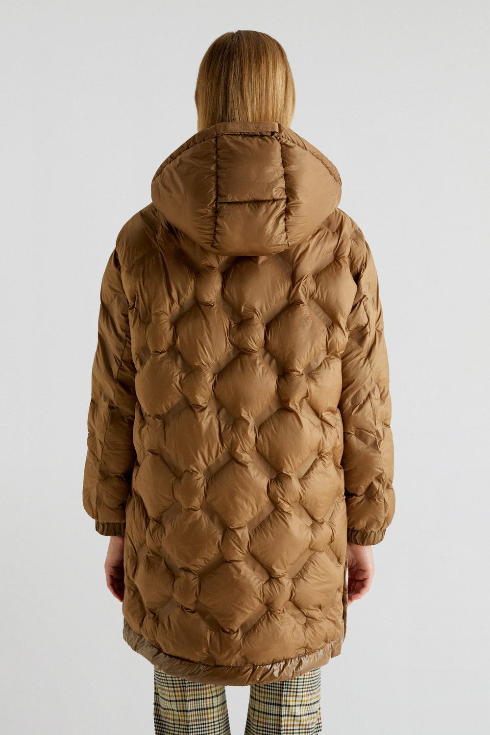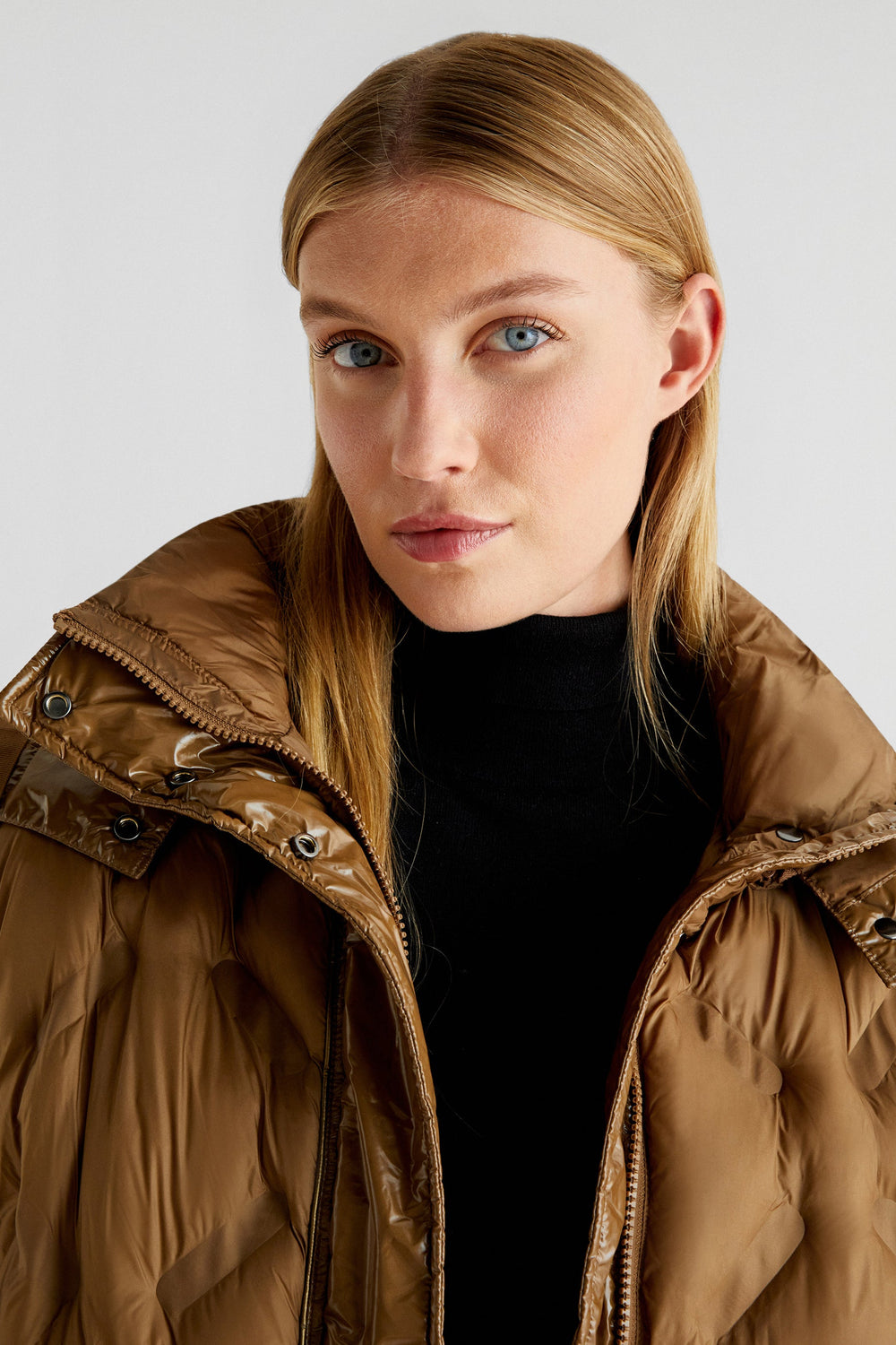 Quilted coat made of recycled fabric. Regular fit, high collar with an adjustable hood and button and snap button fastenings. Long sleeves with elasticated trims, side pockets and side openings.