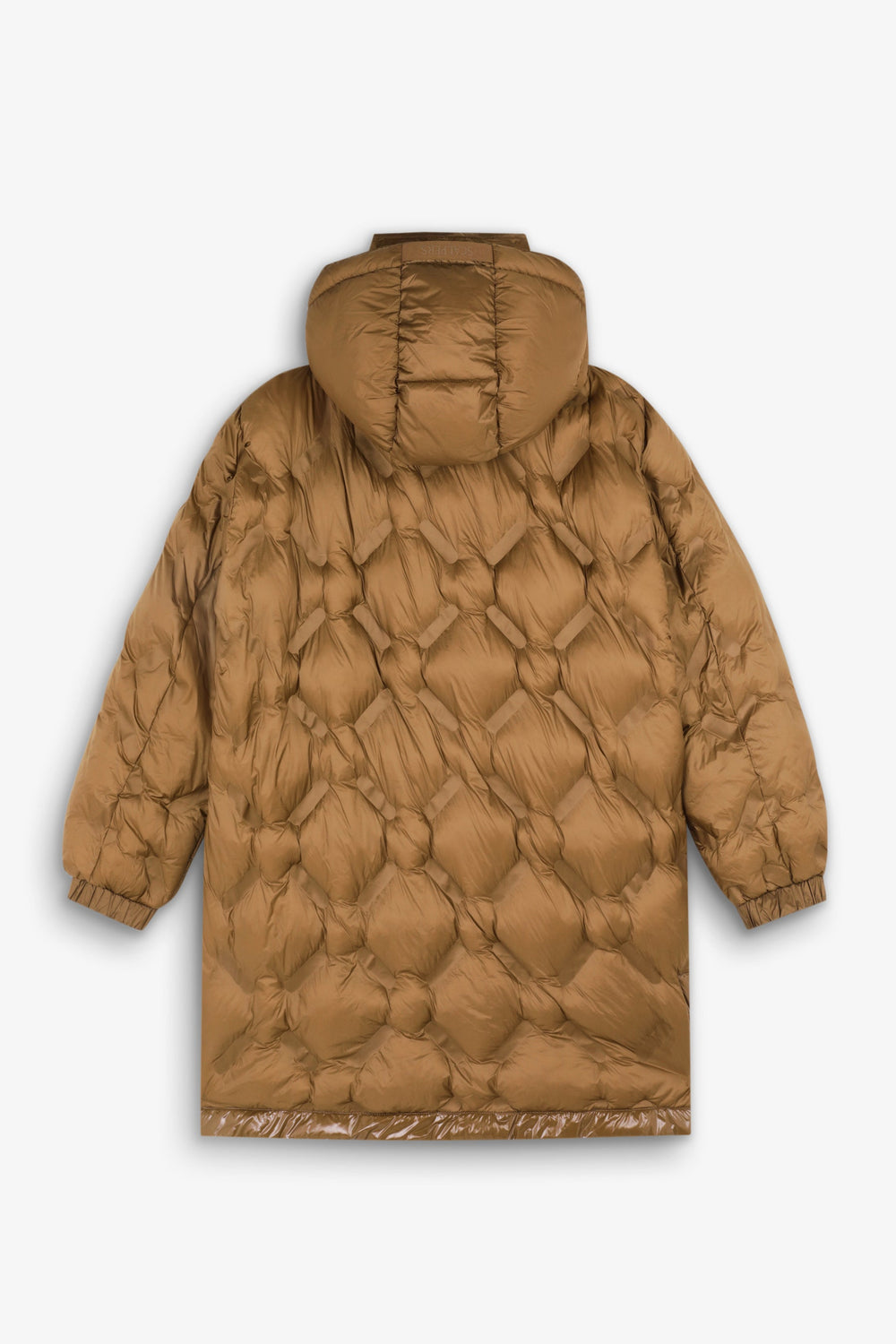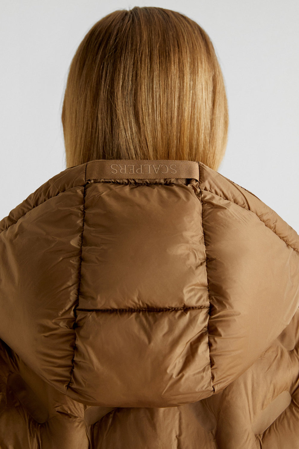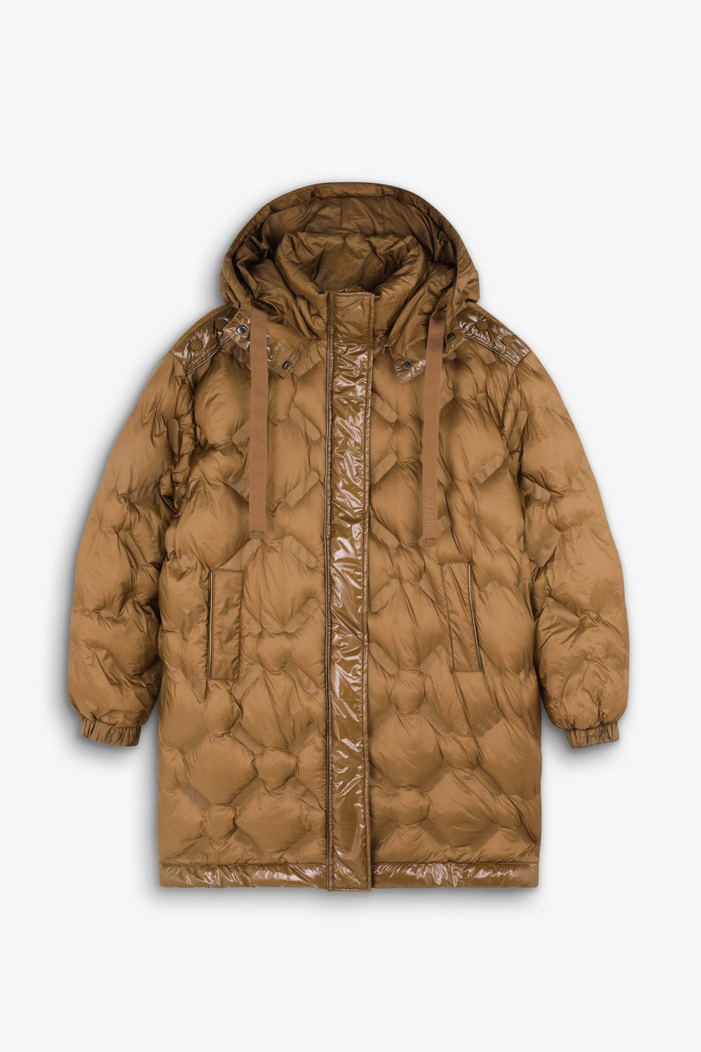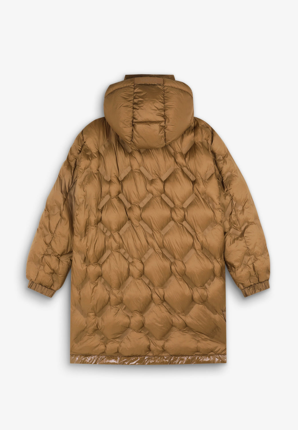 Quilted coat made of recycled fabric. Regular fit, high collar with an adjustable hood and button and snap button fastenings. Long sleeves with elasticated trims, side pockets and side openings.