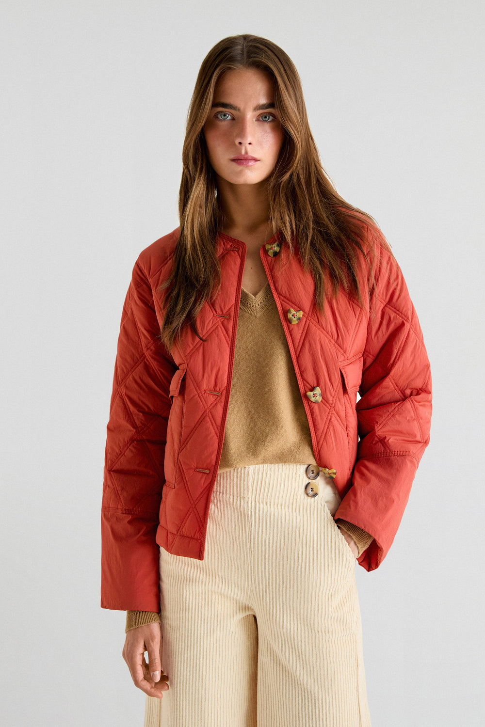 Lightweight puffer jacket made of technical fabric. Regular fit, round neck and button fastening. Long sleeves and flap pockets.