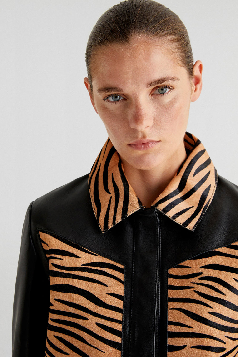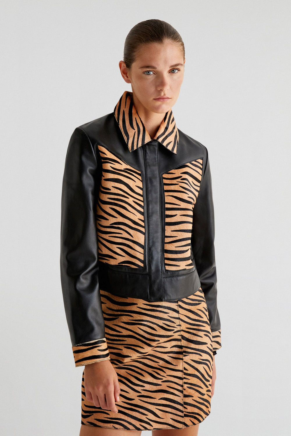 Jacket with zebra details in 100% leather. Regular fit, classic collar and snap-button fastening. Long sleeves with cuffs.