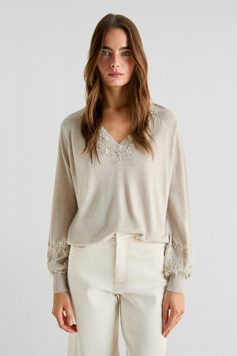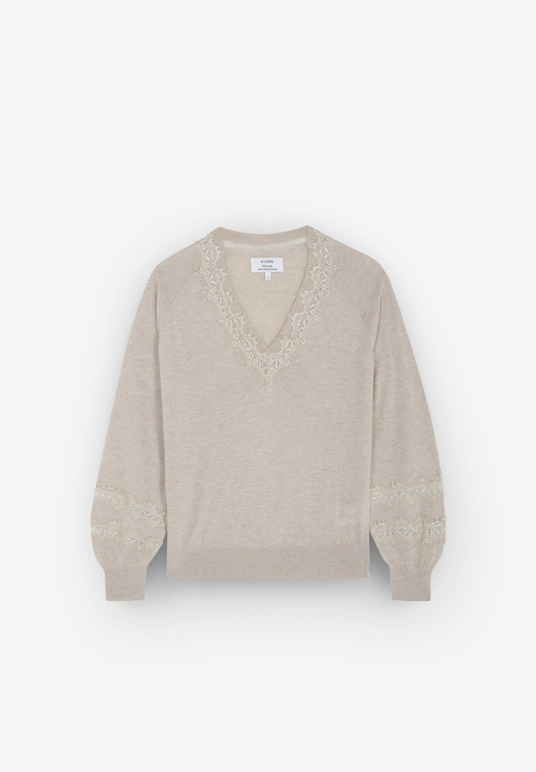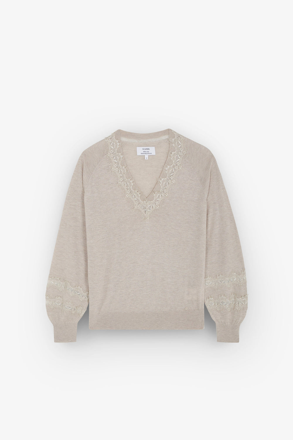 Sweater made of a wool blend. Regular fit, V-neckline and long sleeves. Lace detailing on the neckline and cuffs.