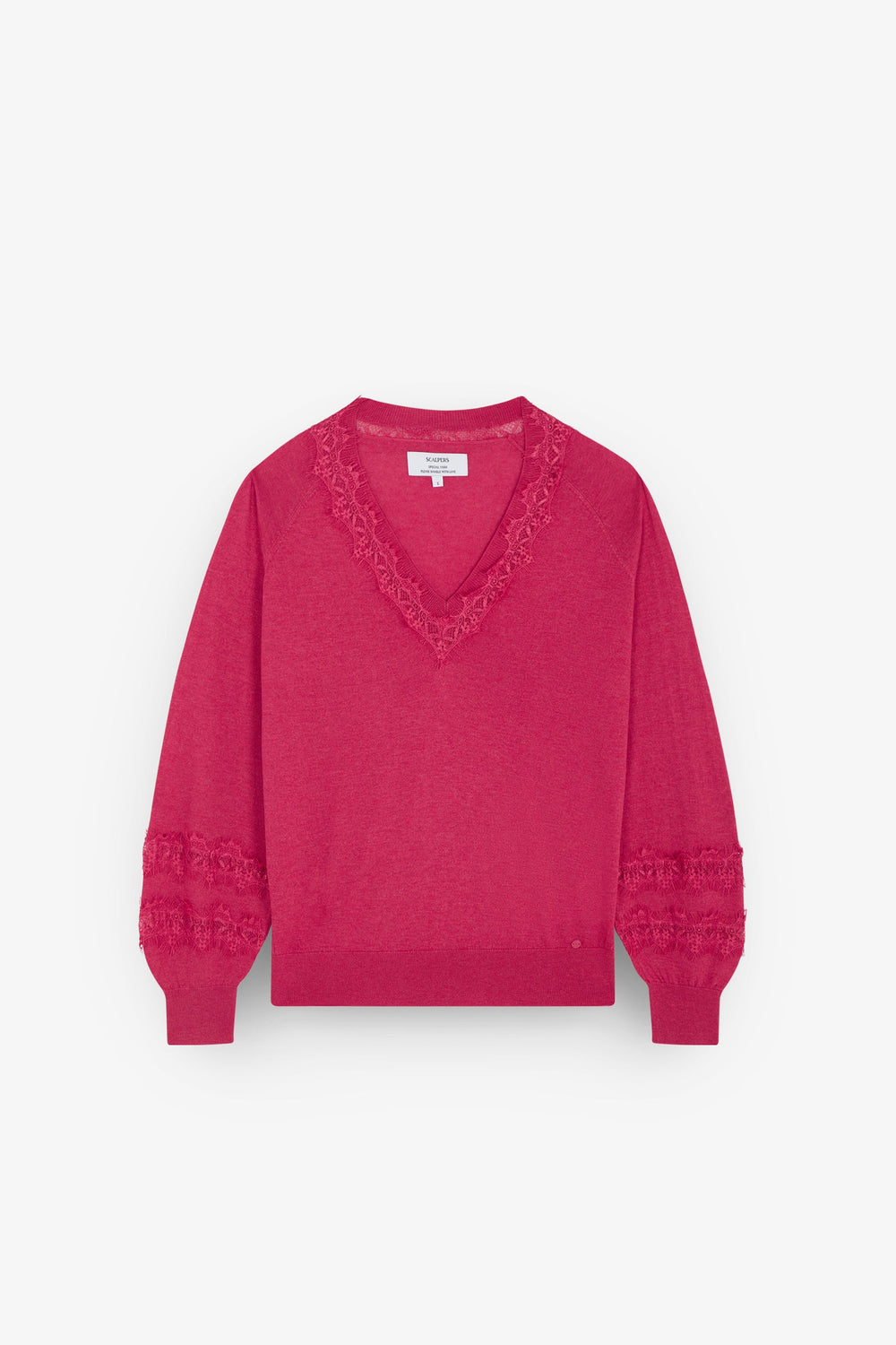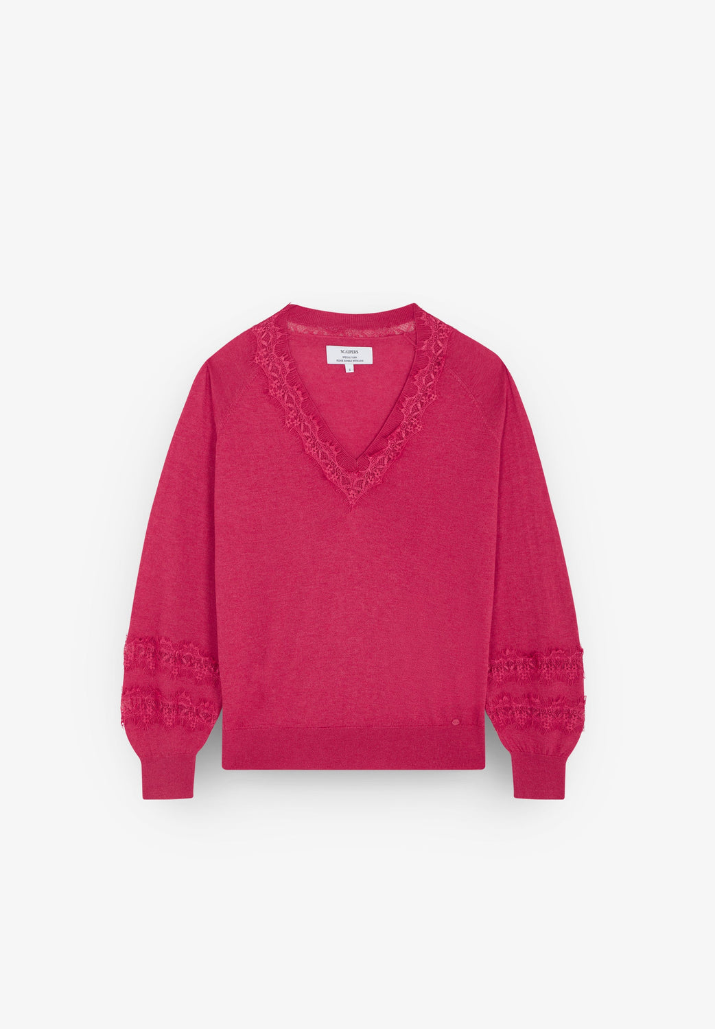 Sweater made of a wool blend. Regular fit, V-neckline and long sleeves. Lace detailing on the neckline and cuffs.