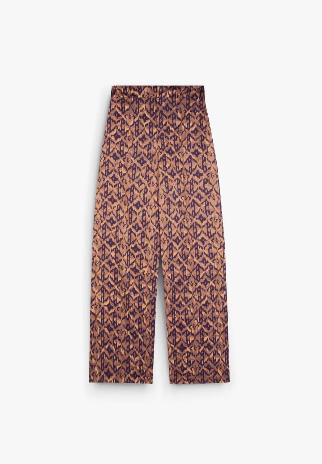 Palazzo ethnic trousers made in flowing fabric. Regular fit, high-rise cut, hook and zip fastening. Elastic at the back.